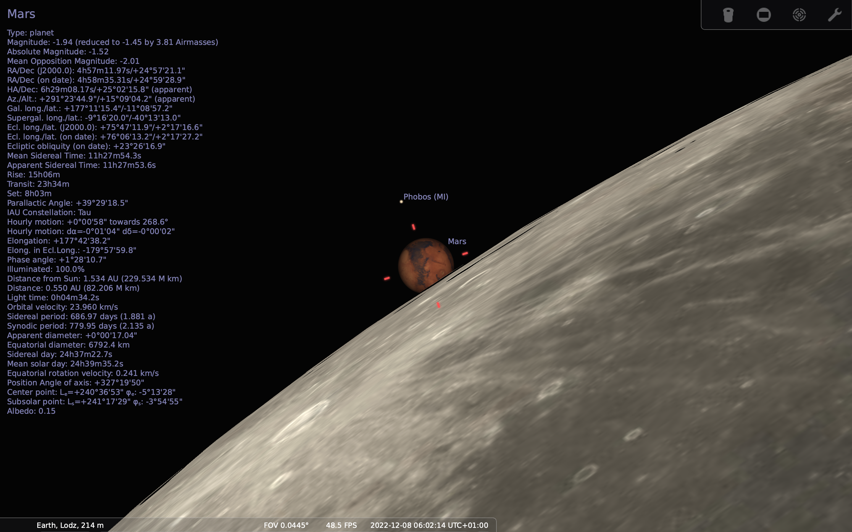8 grudnia rano nastąpi zakrycie Marsa przez Księżyc. To wyjątkowe zjawisko, które ostatnio można było obserwować z Polski nocą w 2007 roku (w międzyczasie zdarzyły się inne zakrycia, ale dzienne). Szczególnej wymowy tej grudniowej nocy dodaje fakt, że właśnie wtedy Mars znajdzie się w opozycji, a zatem będzie najbliżej Ziemi i najjaśniejszy w całym 2022 roku. W Łodzi zakrycie zacznie się o godzinie 6:02 i zakończy się niedługo przed zachodem Księżyca, a zarazem o świcie, o 6:55. Oby dopisała pogoda, bowiem zakrycia tak jasnych obiektów (planet) przez naszego naturalnego satelitę, to naprawdę zjawiska - białe kruki.