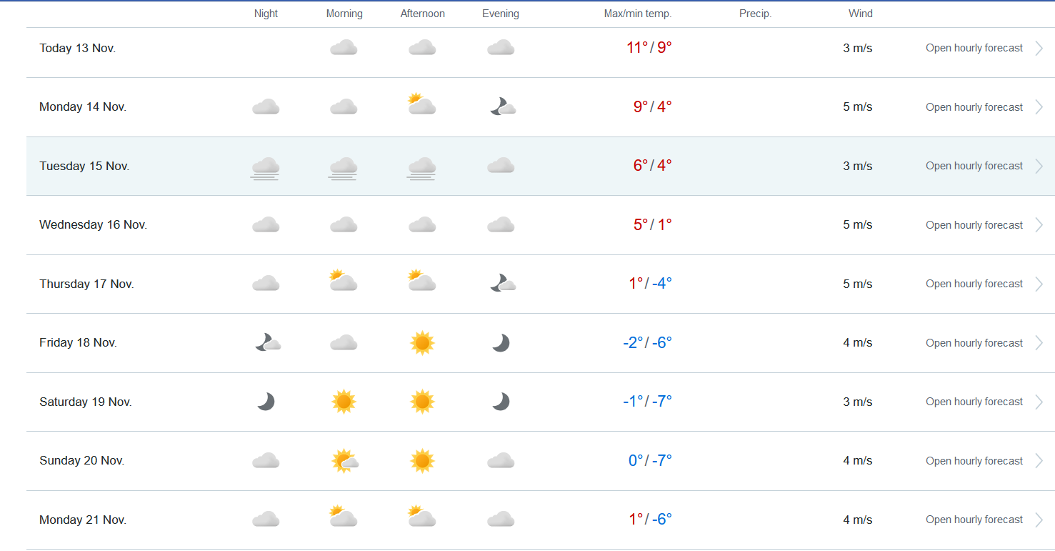 U mnie obecnie bardzo ciepło jak na listopad bo to już 9-ty dzień z temperaturą powyżej 10 -ciu stopni na ogół to jeden lub 2 dni. A tak to wygląda w prognozach na kolejne dni. No i jeszcze dodam ,że wygląda na bardzo suchy listopad choć prawie codziennie mży ale to około 0,3 mm dziennie więc tyle co nic.