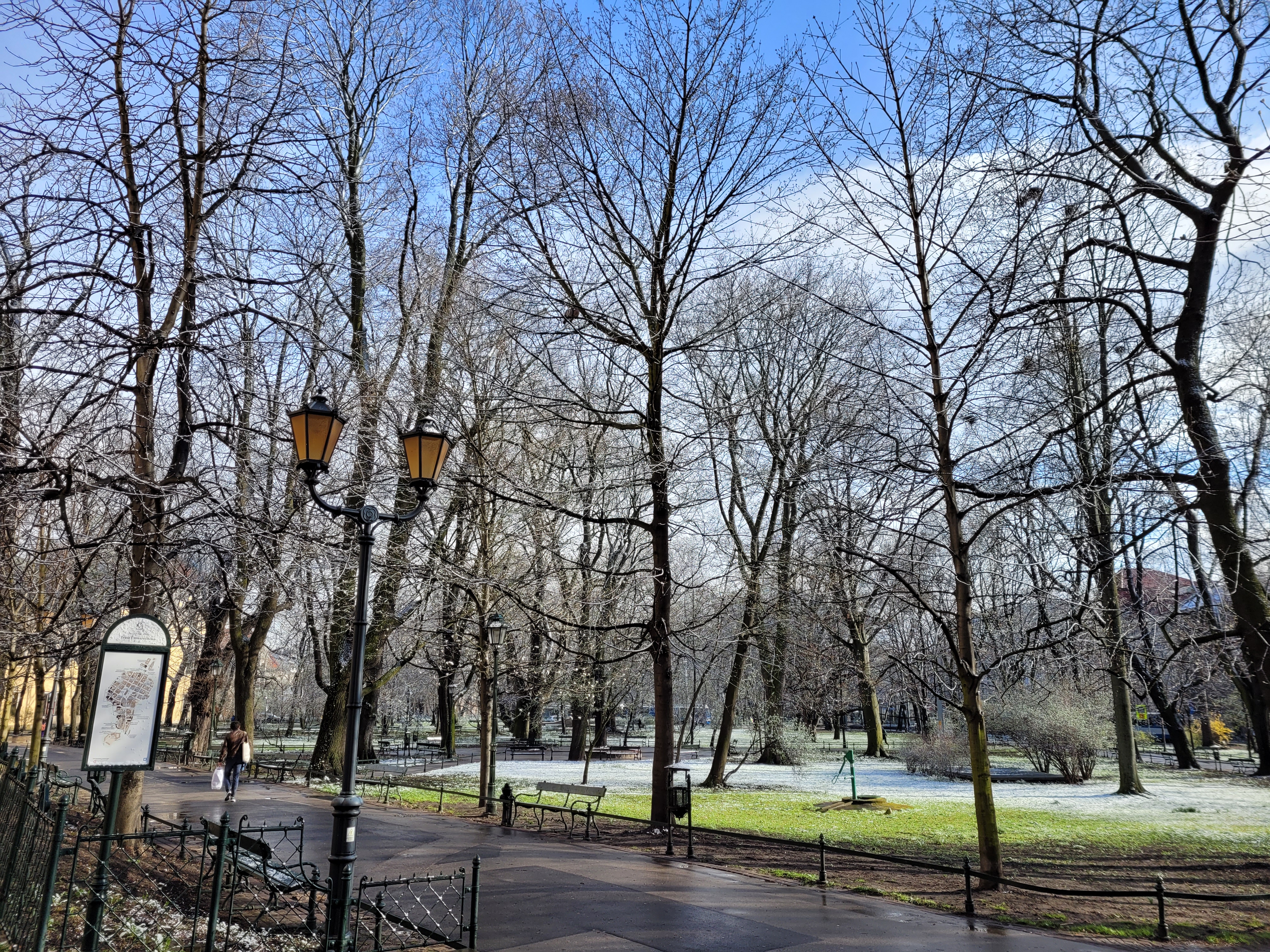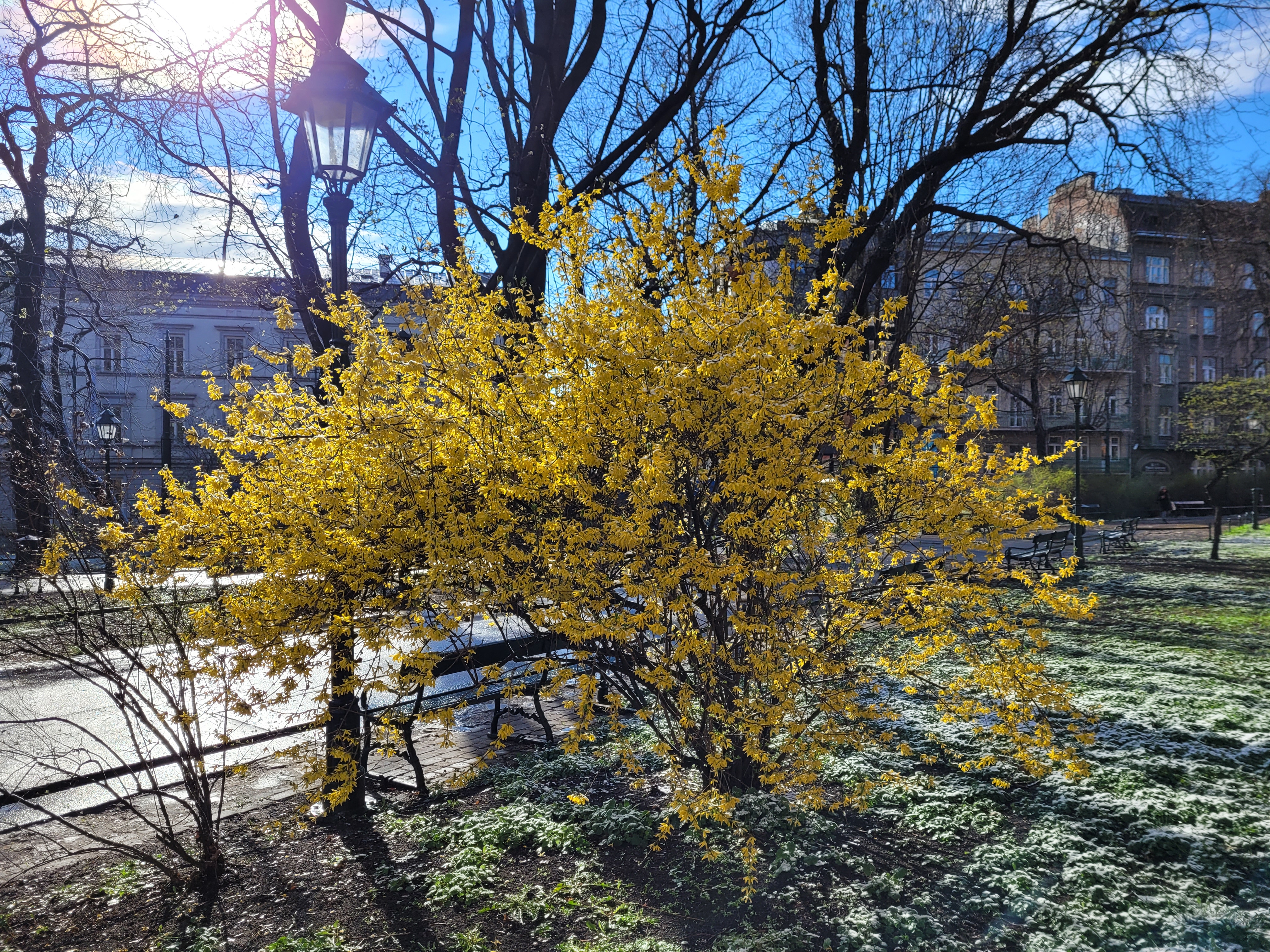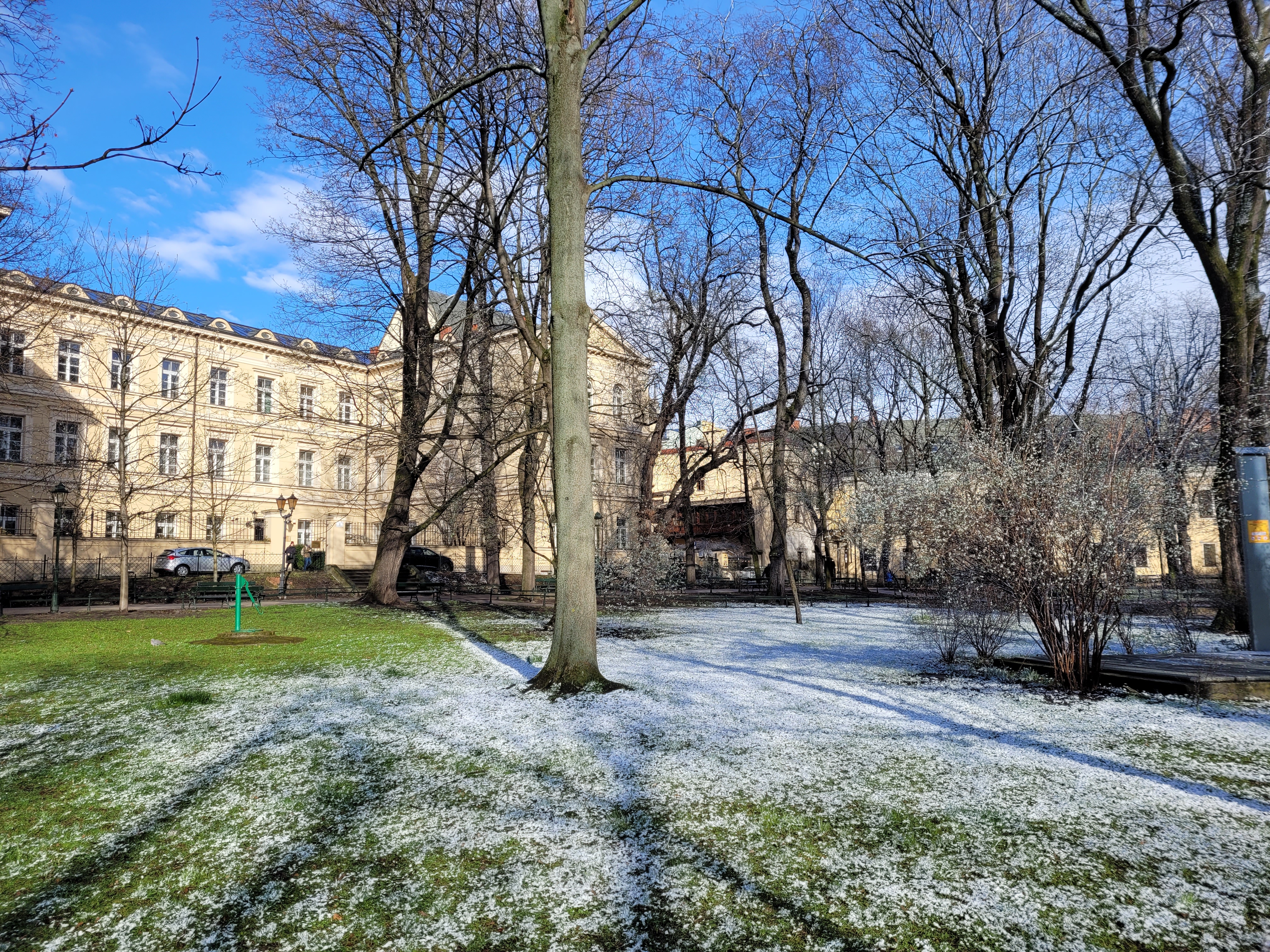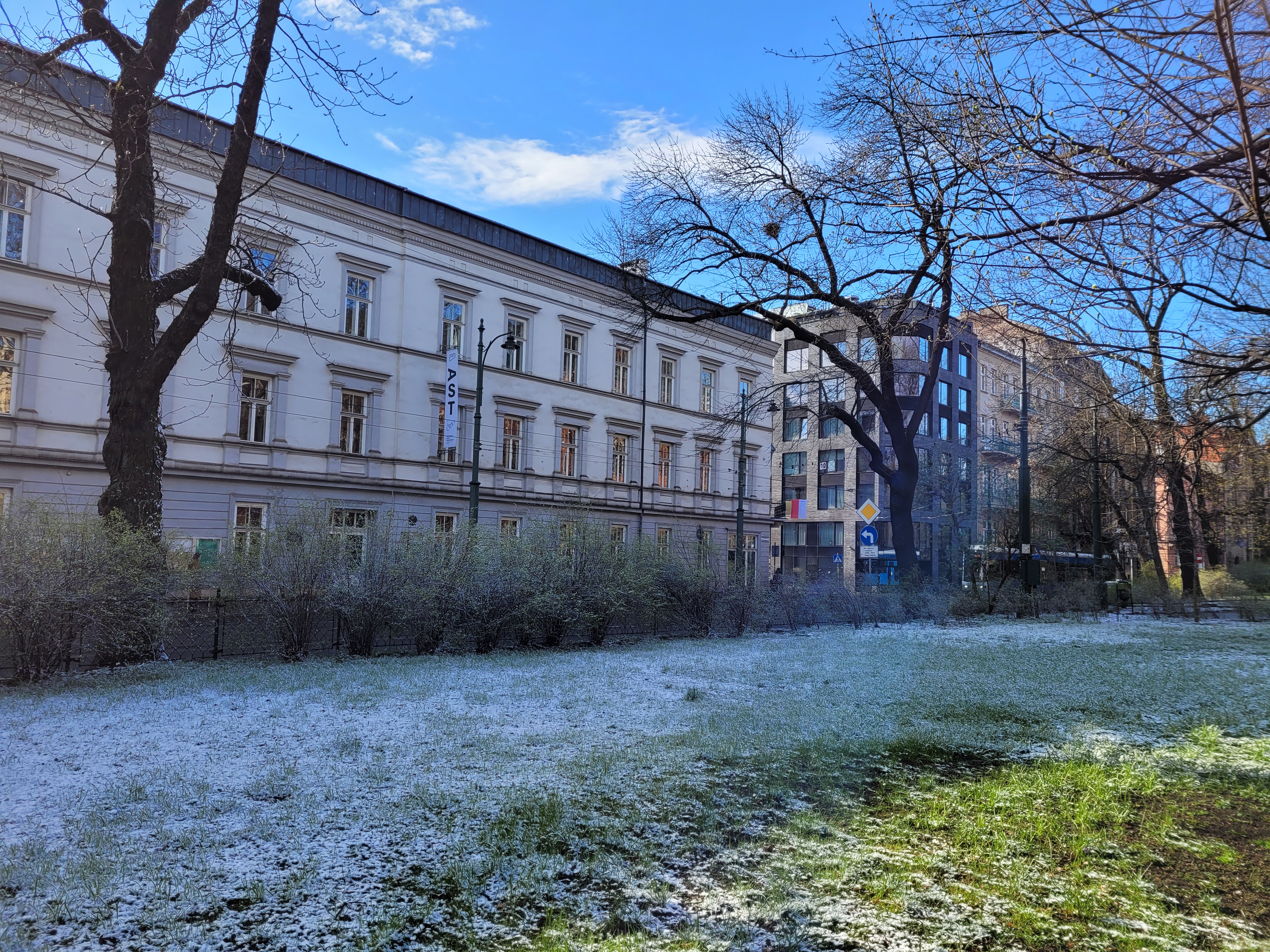 Po krótkiej, ale intensywnej śnieżycy (niestety z racji trwających wtedy zajęć nie miałem jak jej uwiecznić) krajobraz Krakowa tymczasowo się zabielił To największe jak do tej pory natężenie białego koloru dzisiejszego dnia, lecz nie na długo - jak widzicie, Słońce prędko przeszło do kontrofensywy