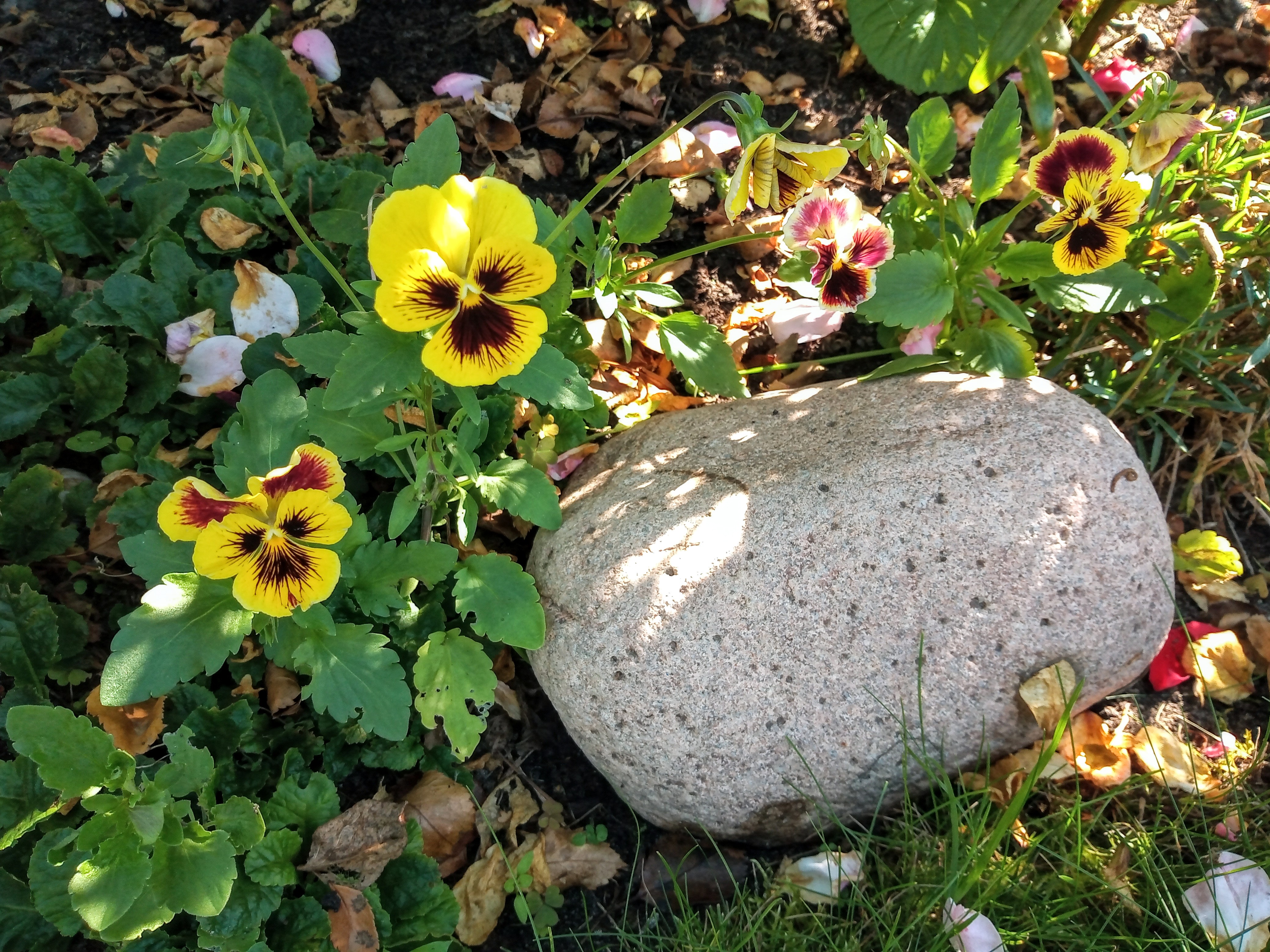 Bratki samosiejki. Wykiełkowały z nasion wiosennych przekwitłych bratków. Wiosną znów zakwitną, bo to kwiatki dwuletnie.