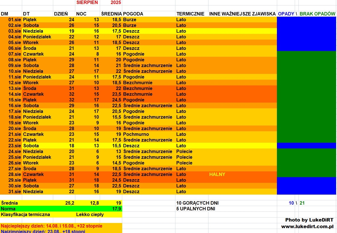 Niestety bardzo kiepsko oceniam ten miesiąc, przede wszystkim z uwagi na opady, a w zasadzie ich brak w okresie 6-29.08. Termikę byłbym w stanie zaakceptować, ale nie do końca pasuje mi jej amplitudowa wersja. Na minus też TOTALNY brak burz po 2/3.08.
