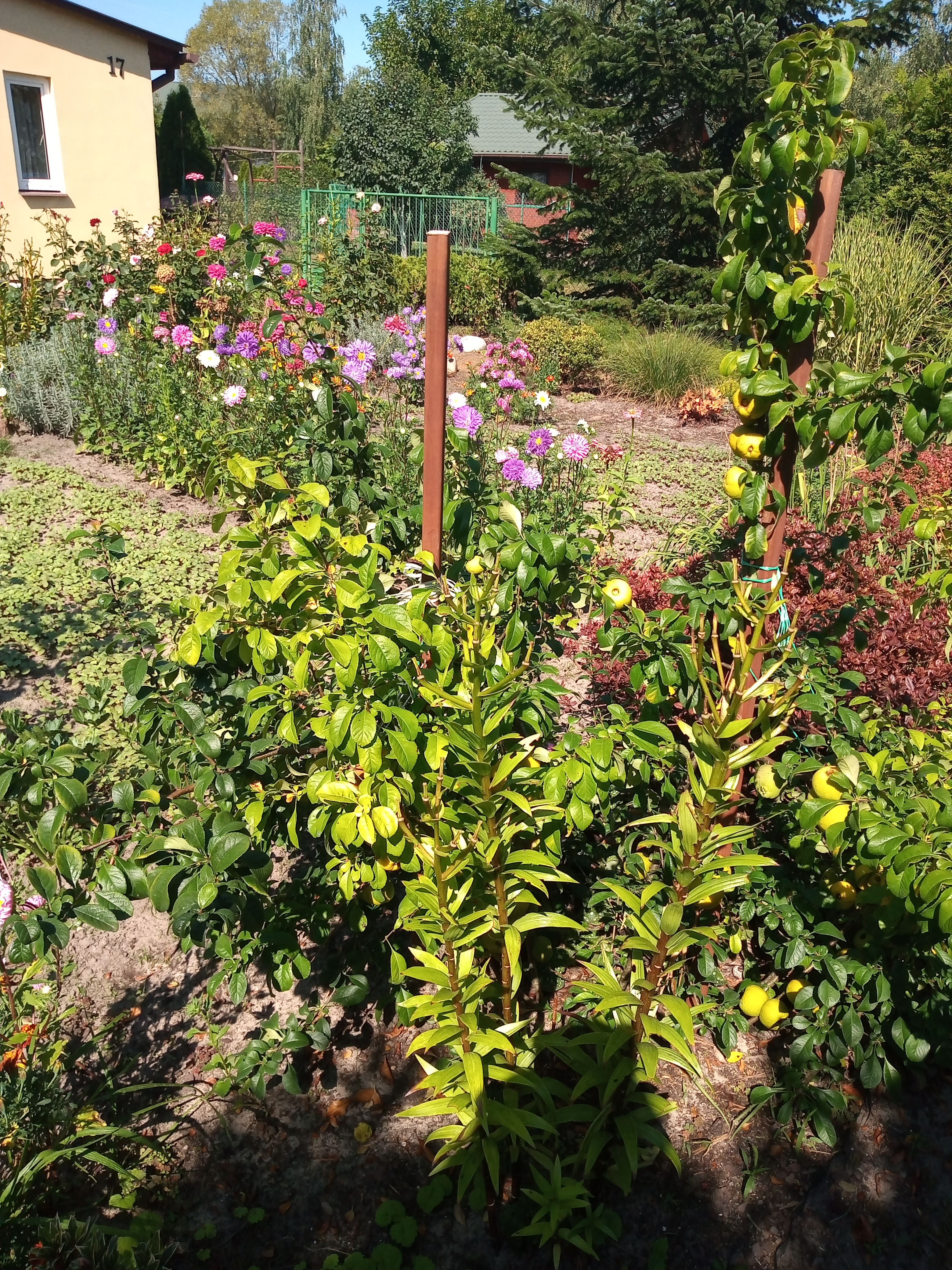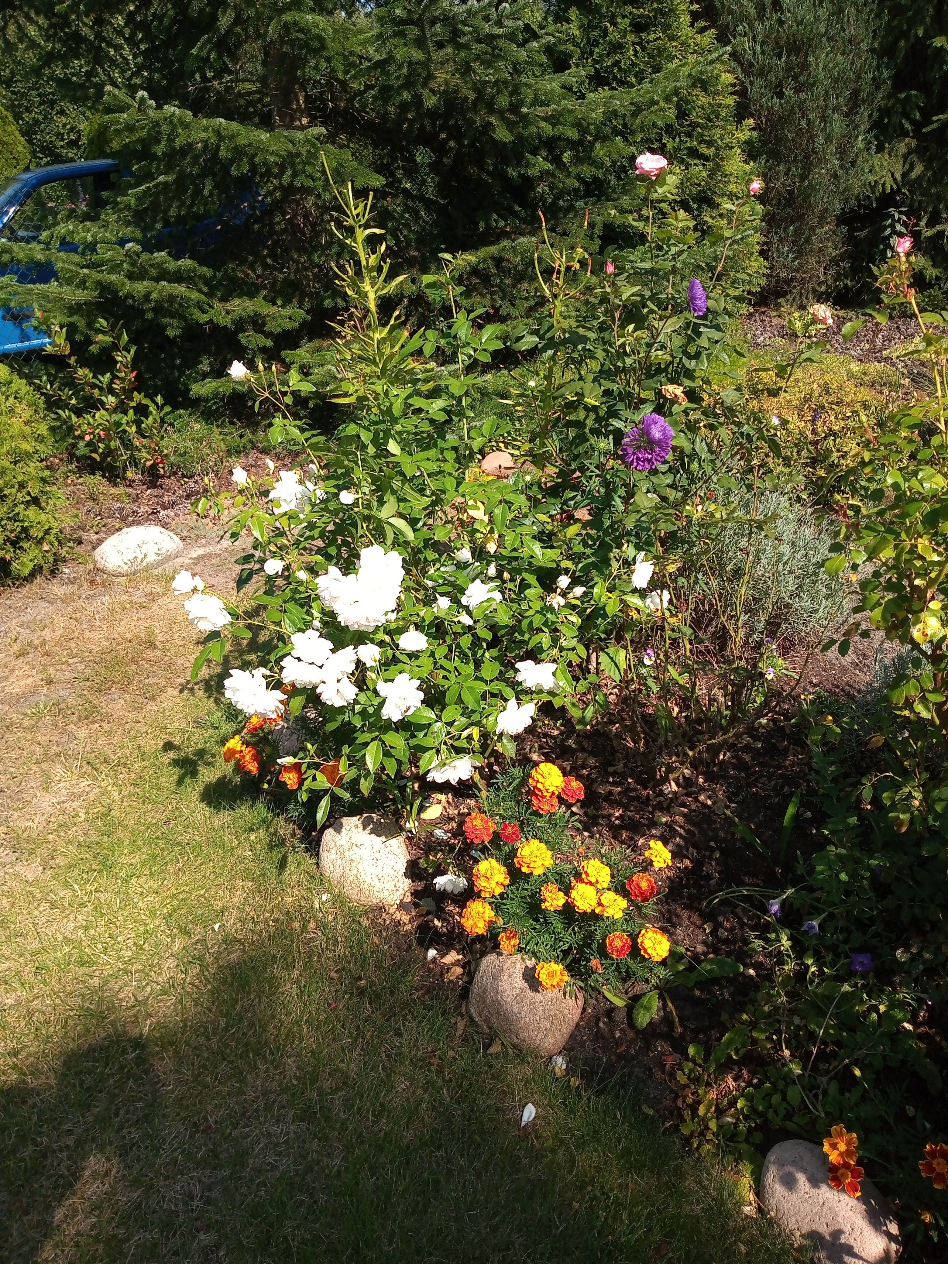 Biała róża zakwitła już drugi raz w tym roku. Inne róże też puszczają pąki.