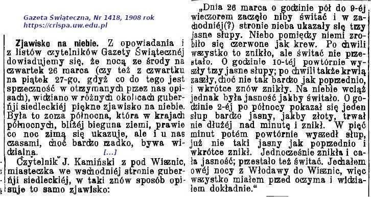 Ostatnio znalazłem także kolejny archiwalny materiał dotyczący zorzy polarnej. To wycinek prasowy z marca 1908 roku.