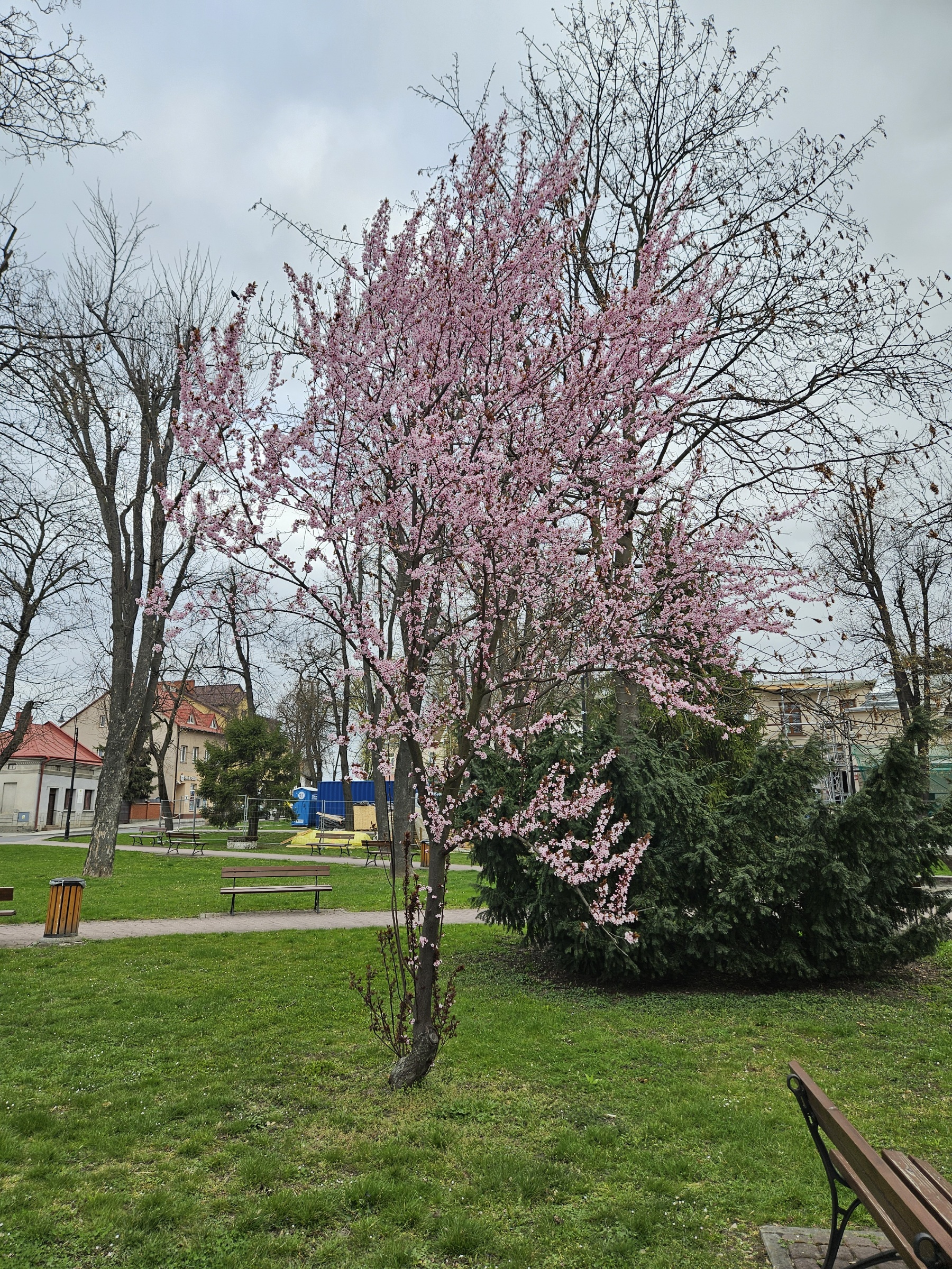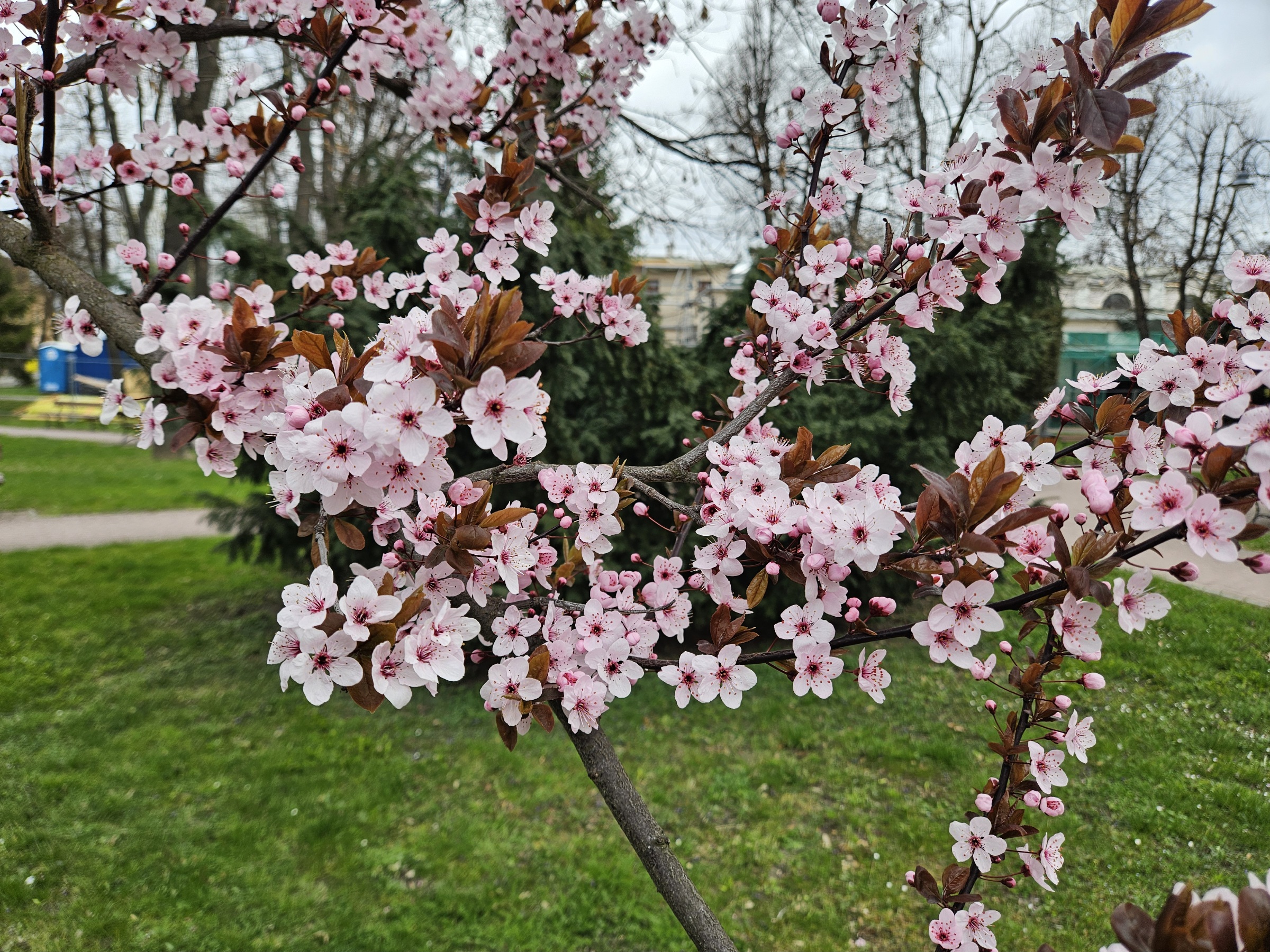 Śliwa wiśniowa kwitnąca w parku: