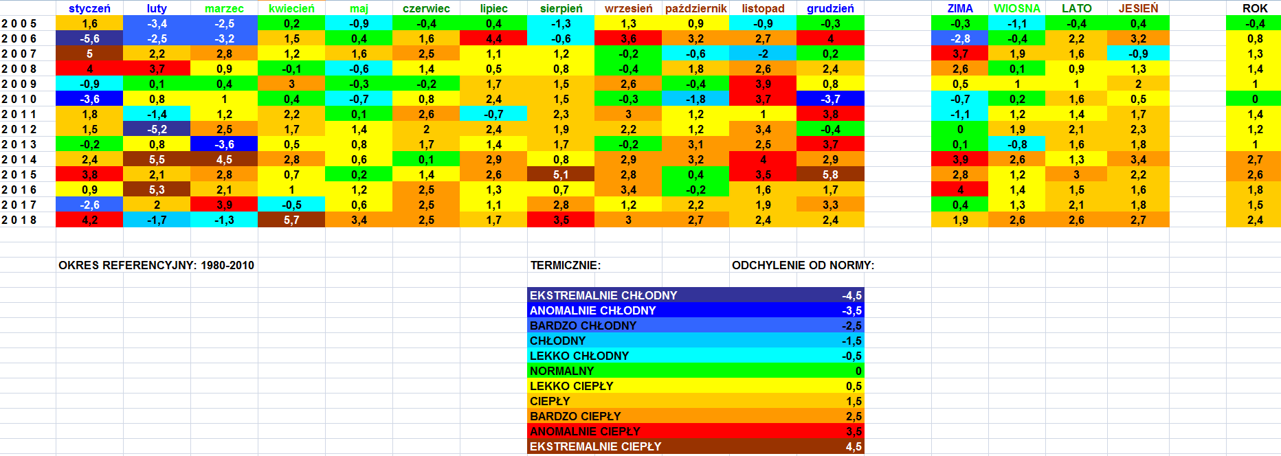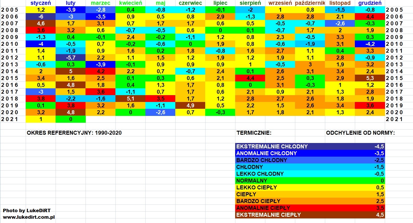 Najnormalniejszy był chyba rok 2005 - wtedy od kwietnia aż do grudnia wszystkie miesiące oscylowały w okolicach normy - raz lekko poniżej raz lekko powyżej, ale zawsze mniej więcej w normie.