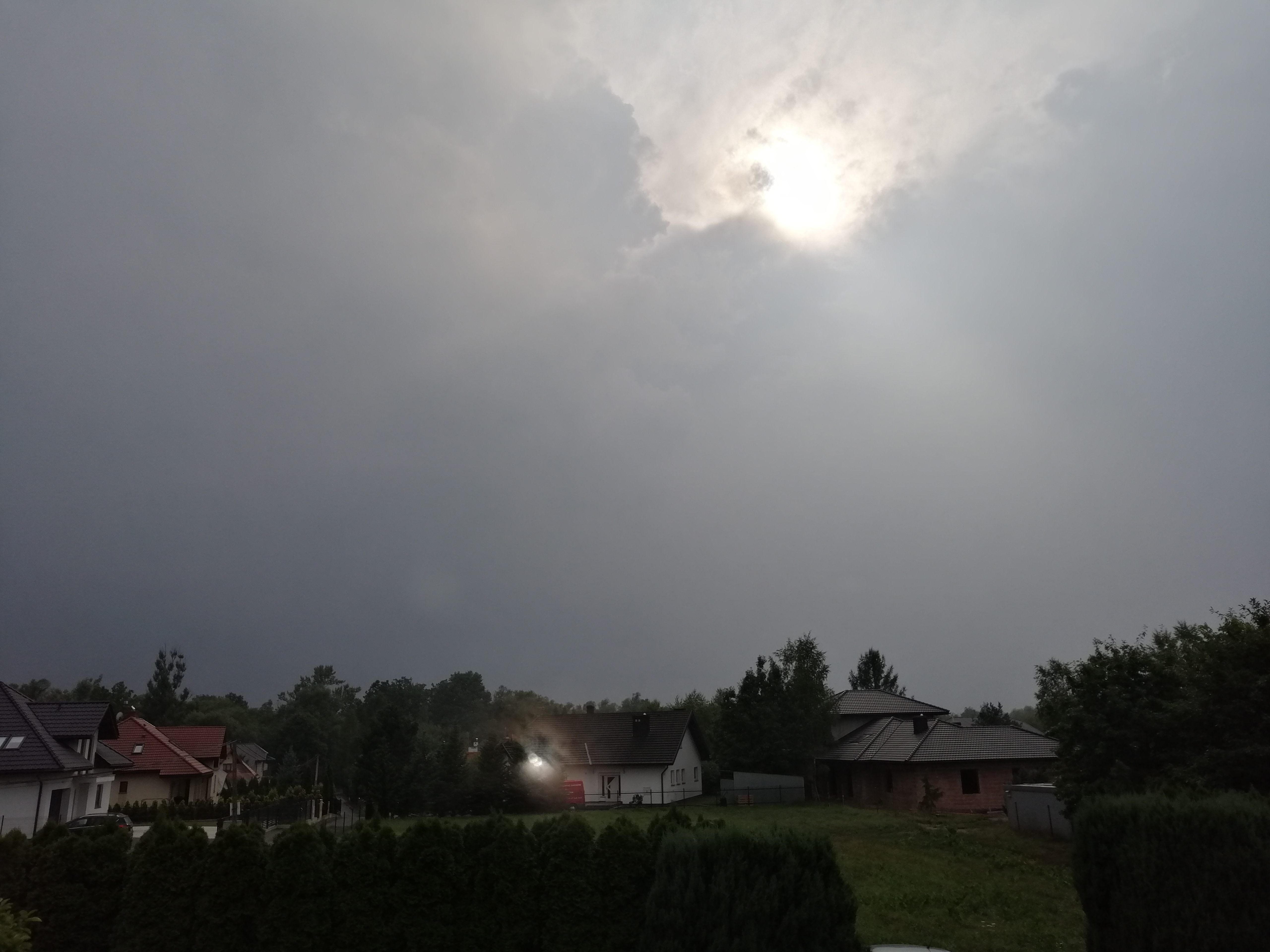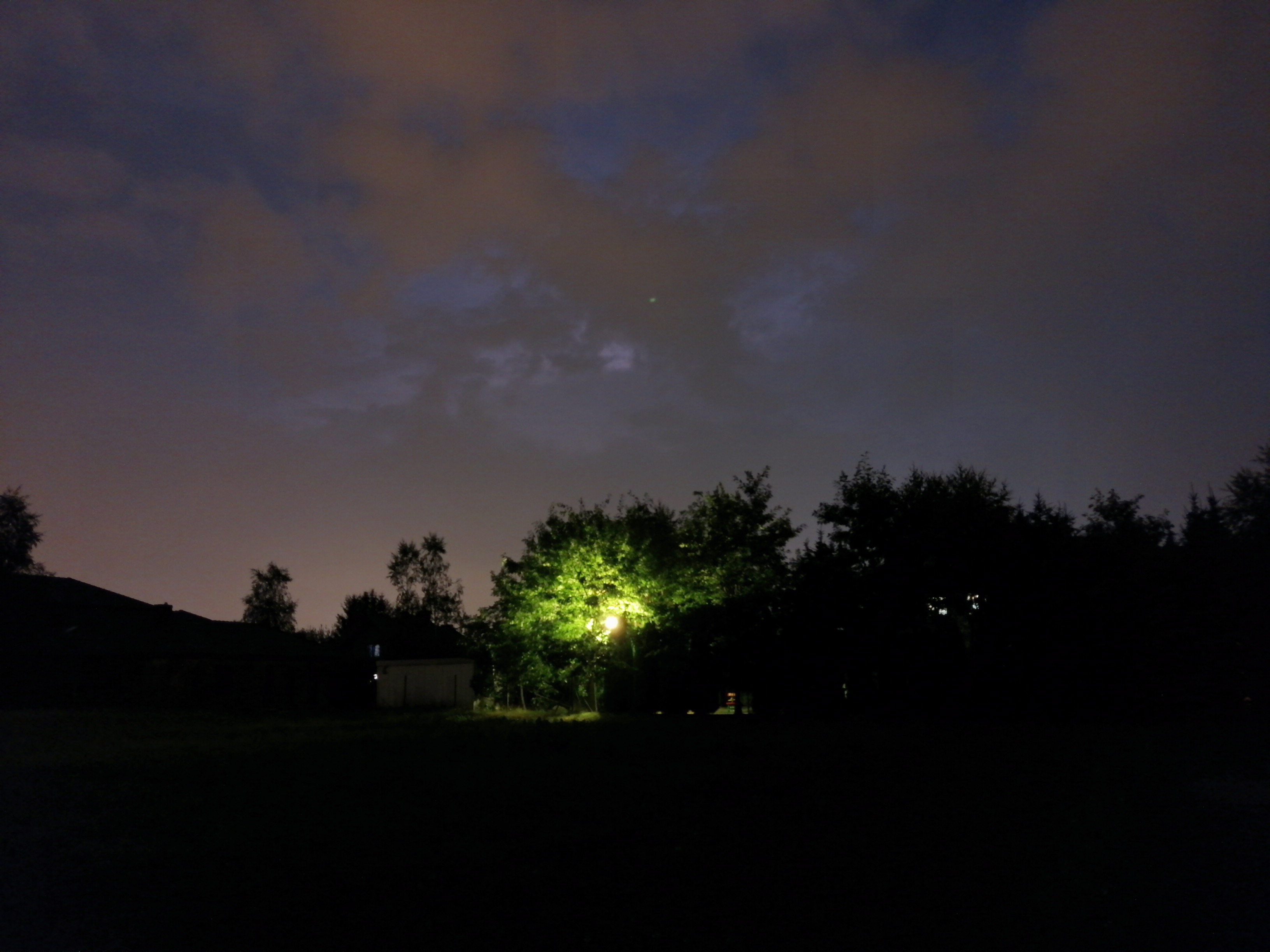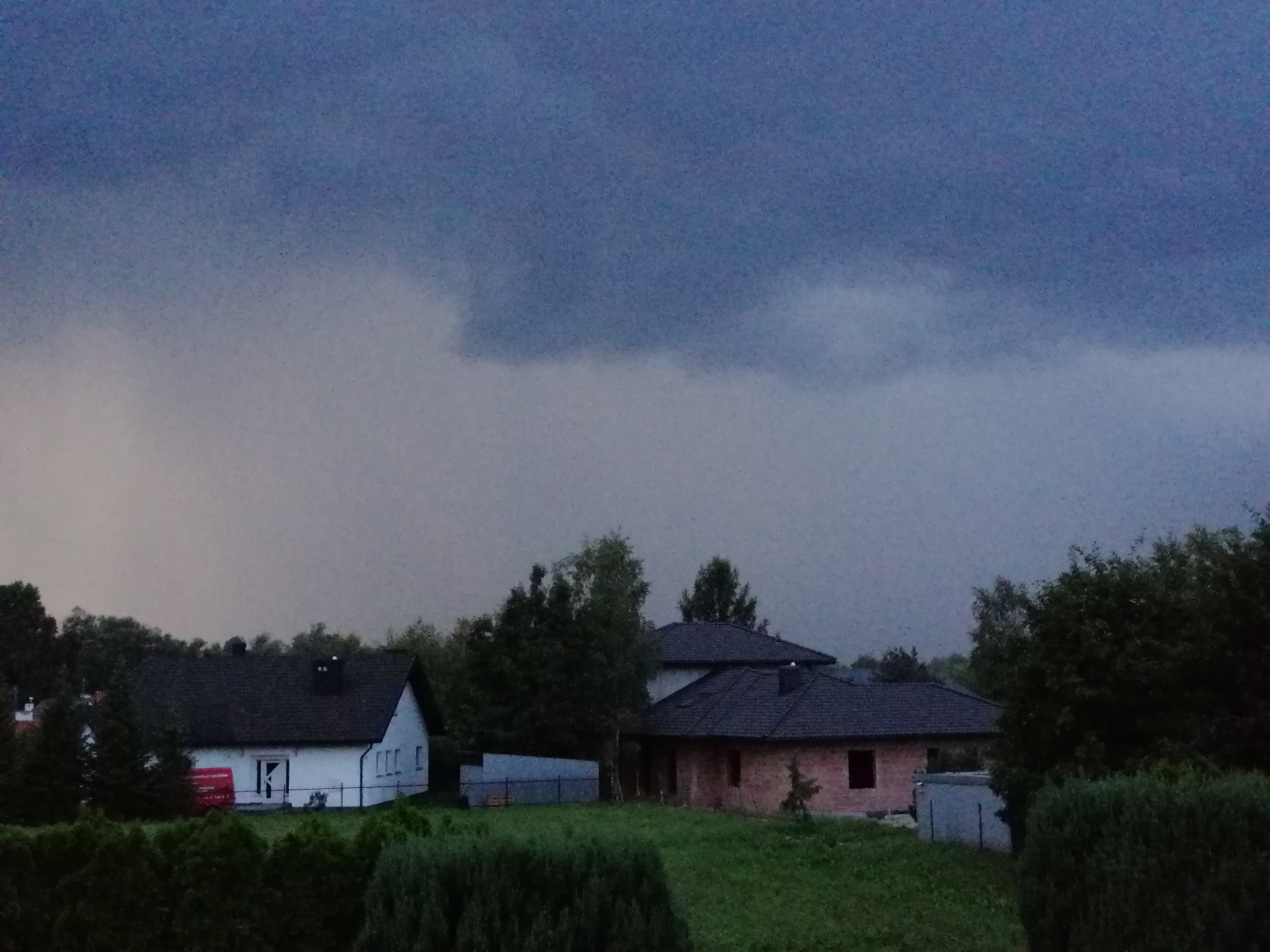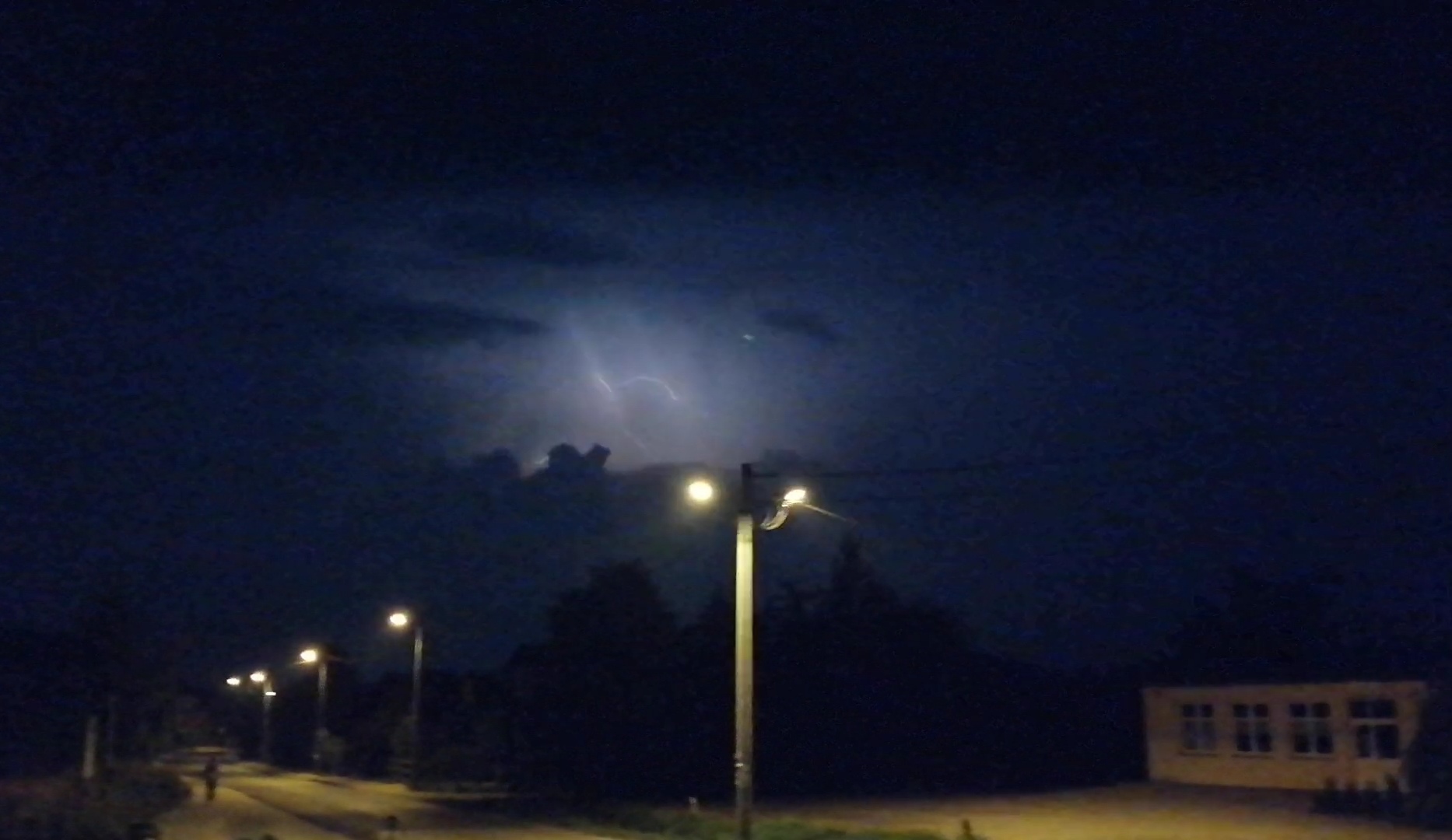 Wieczorem, kiedy było już ciemno (około 20:30) postanowiłem trochę się wyciszyć i przejść na spacer po okolicy, ciesząc się opadem który nareszcie nastąpił. Szedłem sobie spokojnie, aż nagle odniosłem wrażenie jakby ktoś w pobliżu zrobił zdjęcie. Zignorowałem to i szedłem dalej, aż po około trzech minutach sytuacja się powtórzyła. I potem znowu. Wracałem już do domu i kiedy znalazłem się na otwartej przestrzeni, zauważyłem że faktycznie się błyska, aczkolwiek trudno było mi ocenić z której strony. Pies sąsiadów tradycyjnie zaczął szczekać. Sytuacja powoli się klarowała i dostrzegałem już, że burza naciera od północnego-zachodu.