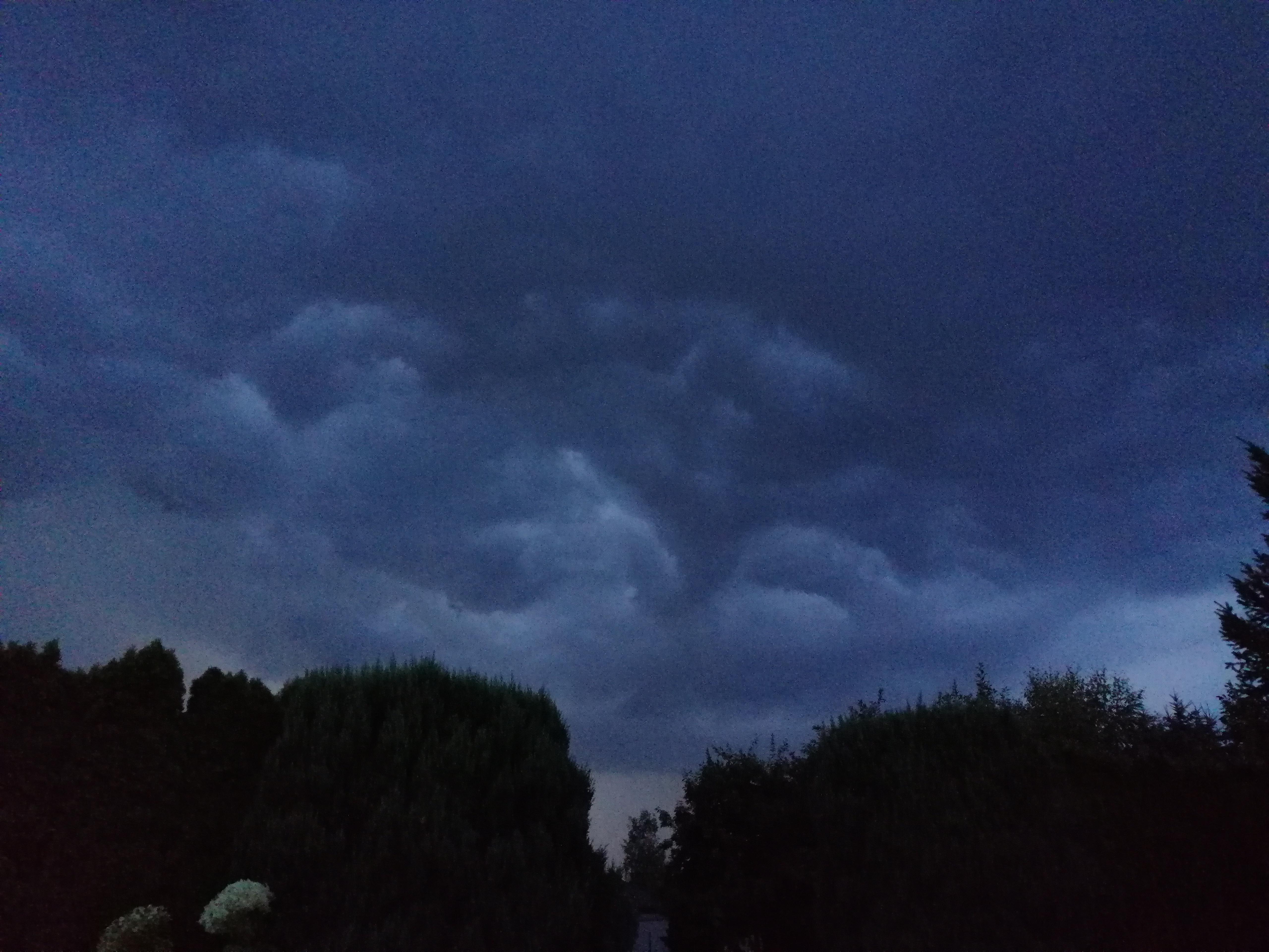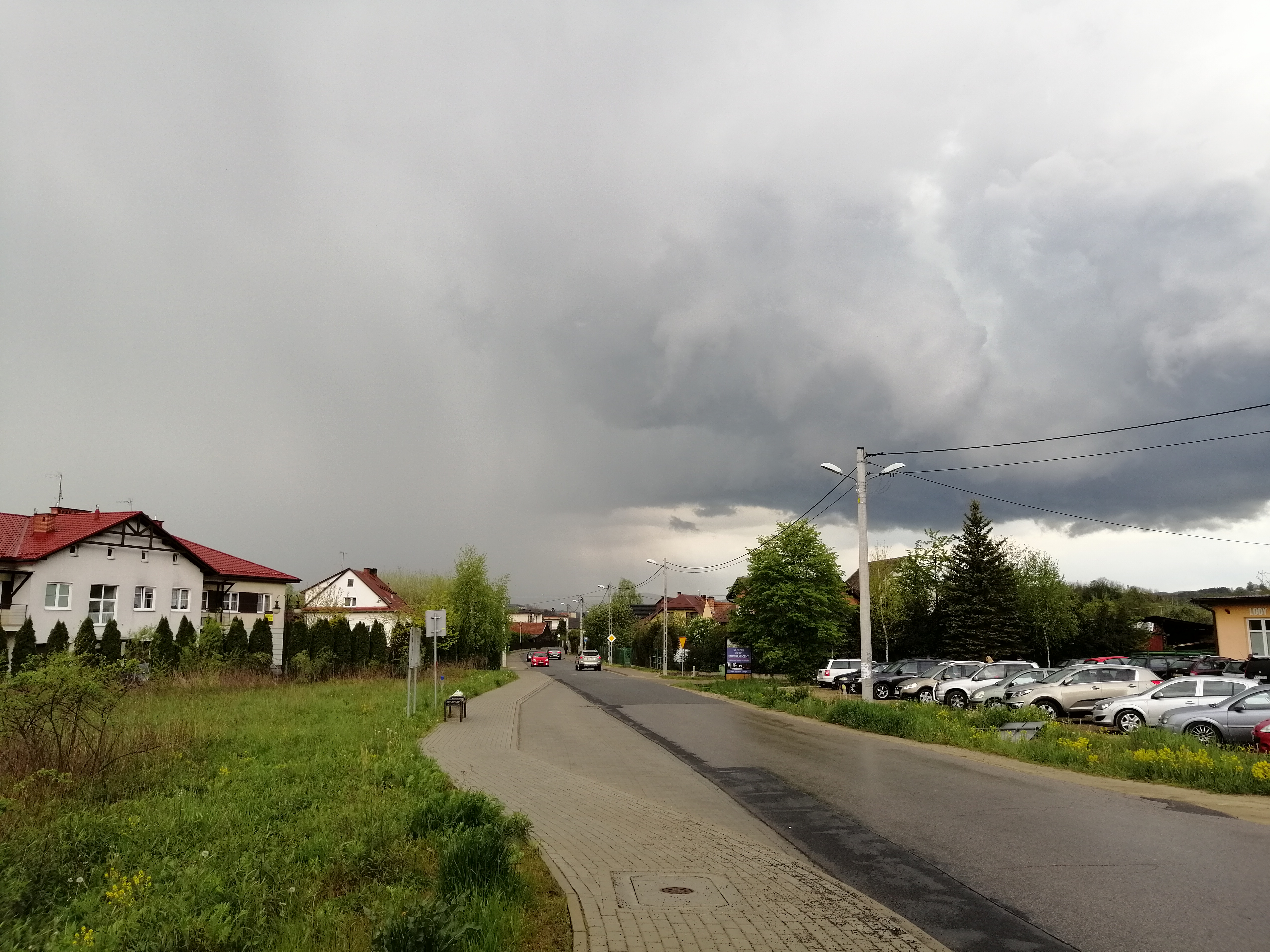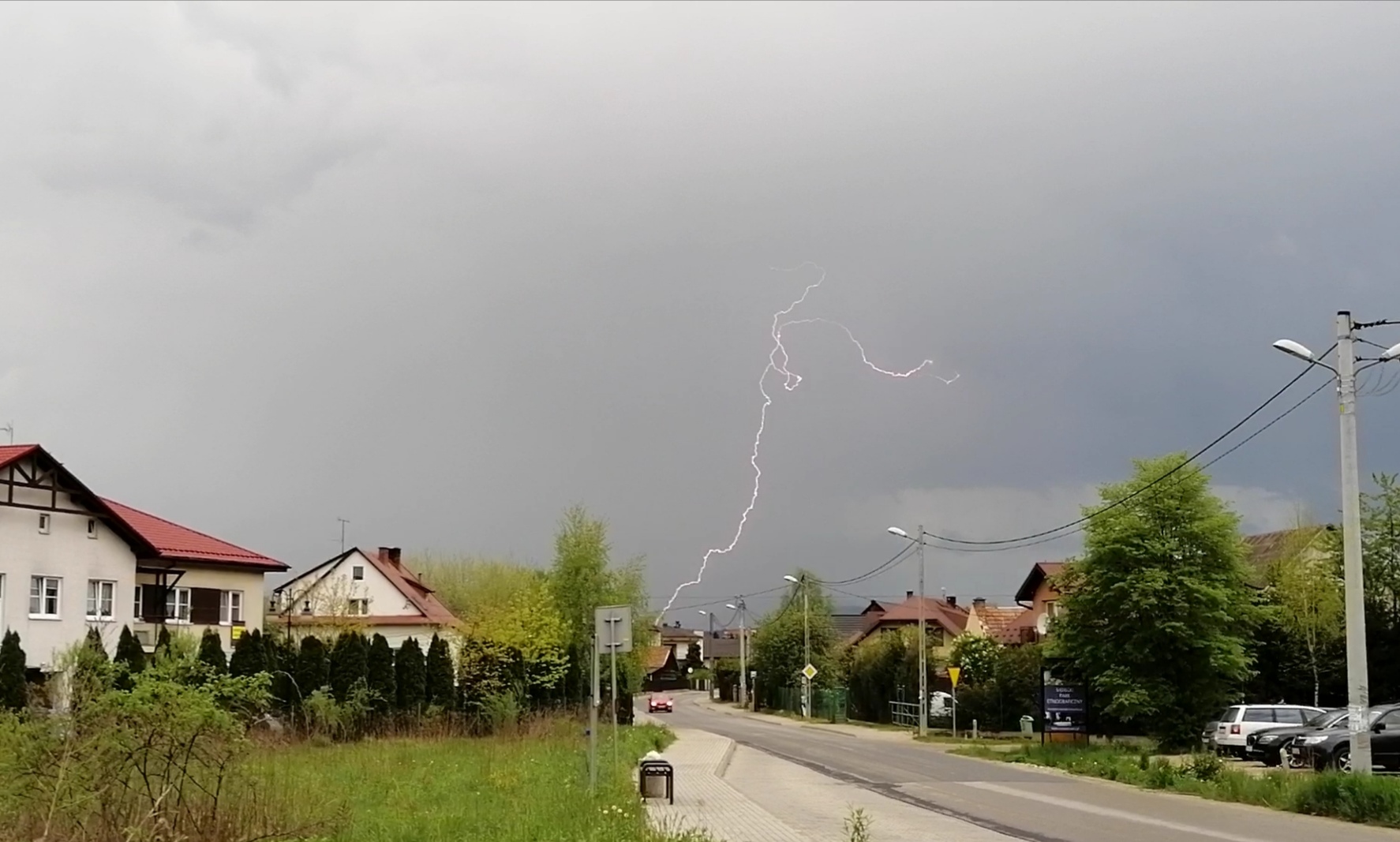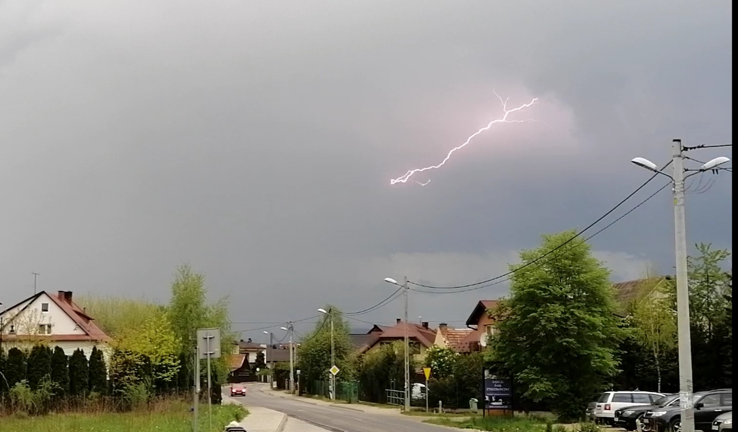 Wieczorem, kiedy było już ciemno (około 20:30) postanowiłem trochę się wyciszyć i przejść na spacer po okolicy, ciesząc się opadem który nareszcie nastąpił. Szedłem sobie spokojnie, aż nagle odniosłem wrażenie jakby ktoś w pobliżu zrobił zdjęcie. Zignorowałem to i szedłem dalej, aż po około trzech minutach sytuacja się powtórzyła. I potem znowu. Wracałem już do domu i kiedy znalazłem się na otwartej przestrzeni, zauważyłem że faktycznie się błyska, aczkolwiek trudno było mi ocenić z której strony. Pies sąsiadów tradycyjnie zaczął szczekać. Sytuacja powoli się klarowała i dostrzegałem już, że burza naciera od północnego-zachodu.