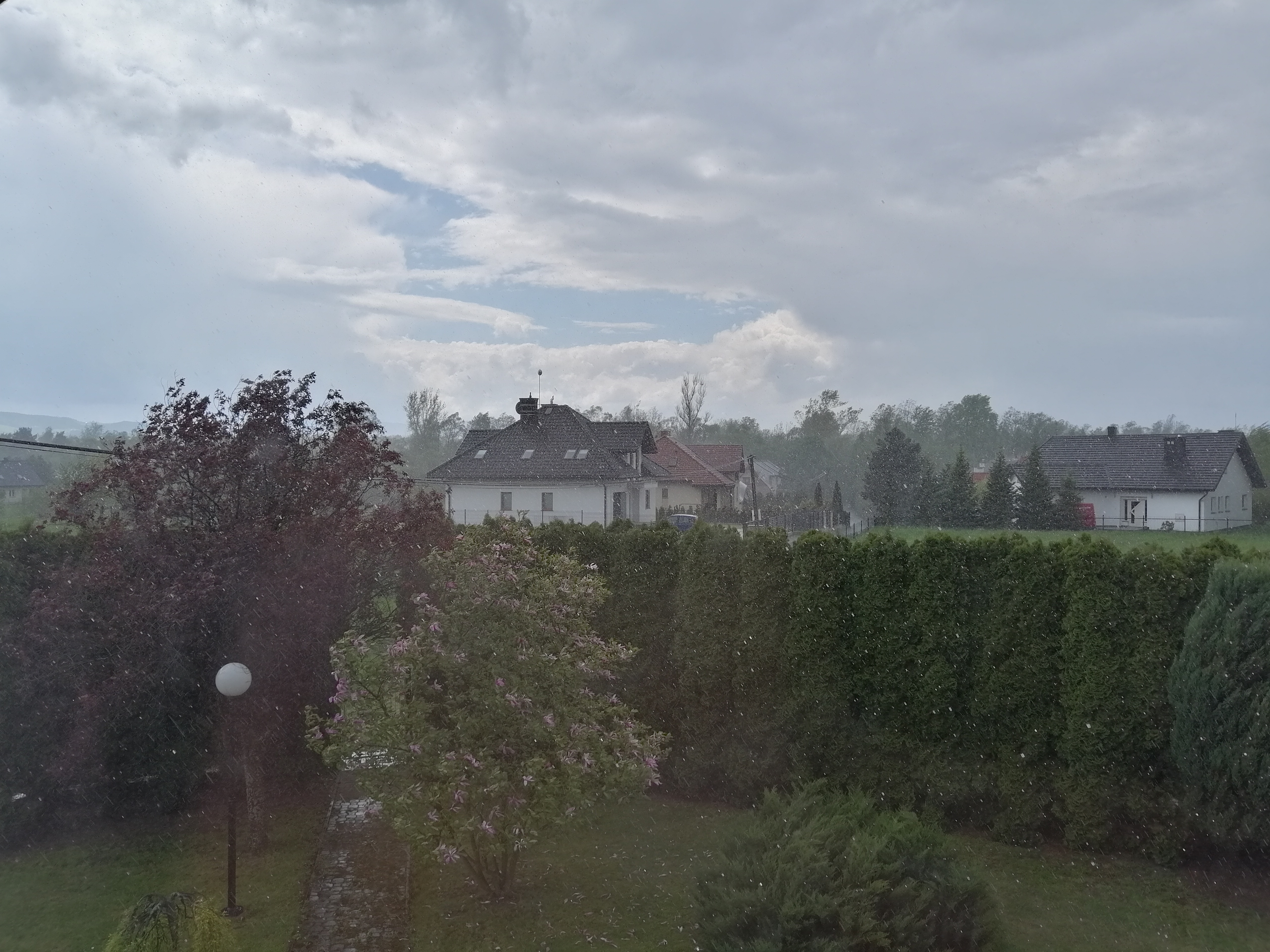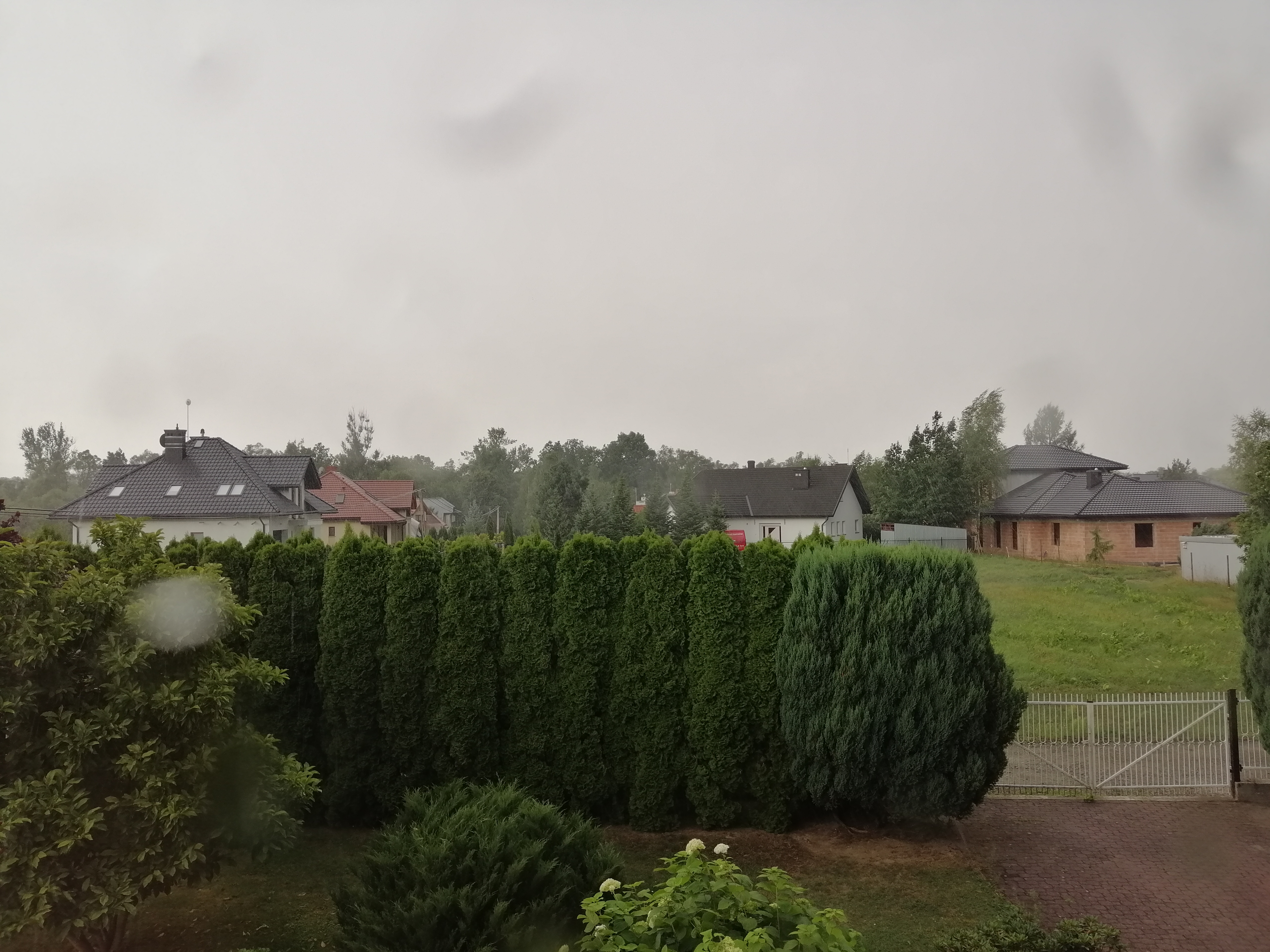 Kolejna burza zdarzyła się już po moim powrocie, przed 15:00. Tym razem nareszcie była to jakaś burzowa klasyka, coś znanego mi z poprzednich, lepszych lat. Przyszła tak jak powinna, z południowego-zachodu, niestety słabo odróżniając się od tła szarego, zamglonego nieba. Podczas tej burzy wyładowań było niewiele, a ponadto ukryły się one za gęsto padającym deszczem. To on jednak grał wówczas pierwsze skrzypce. Kiedy burza nadeszła i opad się rozpoczął, przez chwilę był naprawdę silny i znacząco ograniczył widoczność.