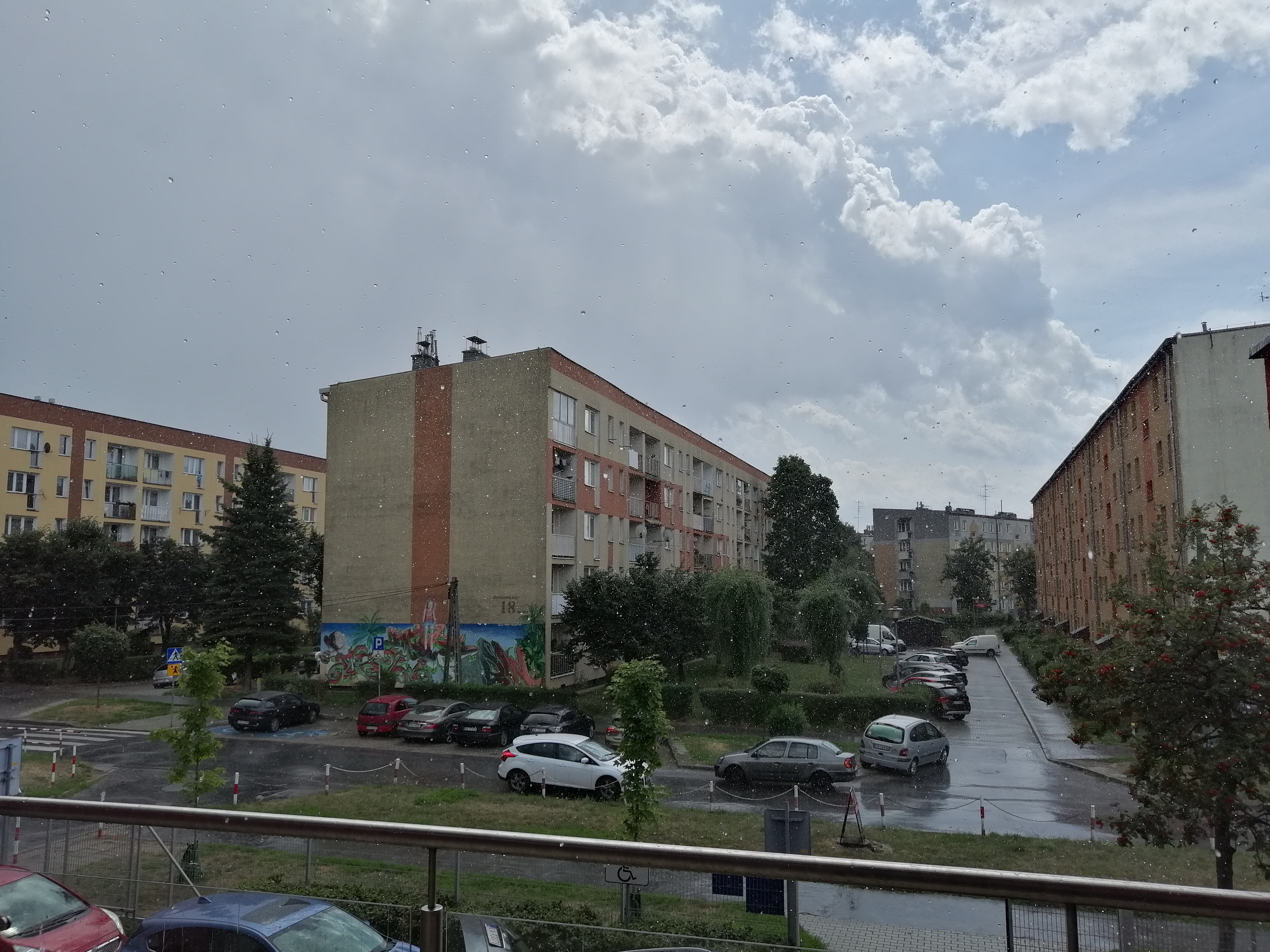 Oberwanie chmury trwało kilka minut, a szum deszczu w pewnym momencie przerwał bardzo głośny grzmot, bowiem uderzyło blisko. Zerwał się wiatr i w efekcie deszcz zalał mi domofon ;) Trwała prawdziwa nawałnica, pojawiły się nawet małe gradziny. Gniew przyrody trwał jednak krótko i już o 13:50 jedynymi śladami po nim były kałuże i cumulonimbus na tle błękitnego, jakby niedowierzającego w to co się stało, nieba. Cała burza rozstrzygnęła się zatem w ciągu godziny.