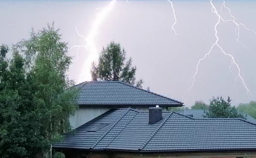 Popołudniowa burza przyniosła tak piękne, soczyste pioruny, jakich nie widziałem od bardzo dawna. Krzaczaste, grube wyładowania waliły w ziemię nieco na południe ode mnie, lecz i ode mnie prezentowały się znakomicie, a dźwięki grzmotów wywoływały wręcz małe drgania w ziemi. Zrobiłem tylko to jedno zdjęcie, gdyż przeszkadzał mi dach budowanego domu sąsiadów.