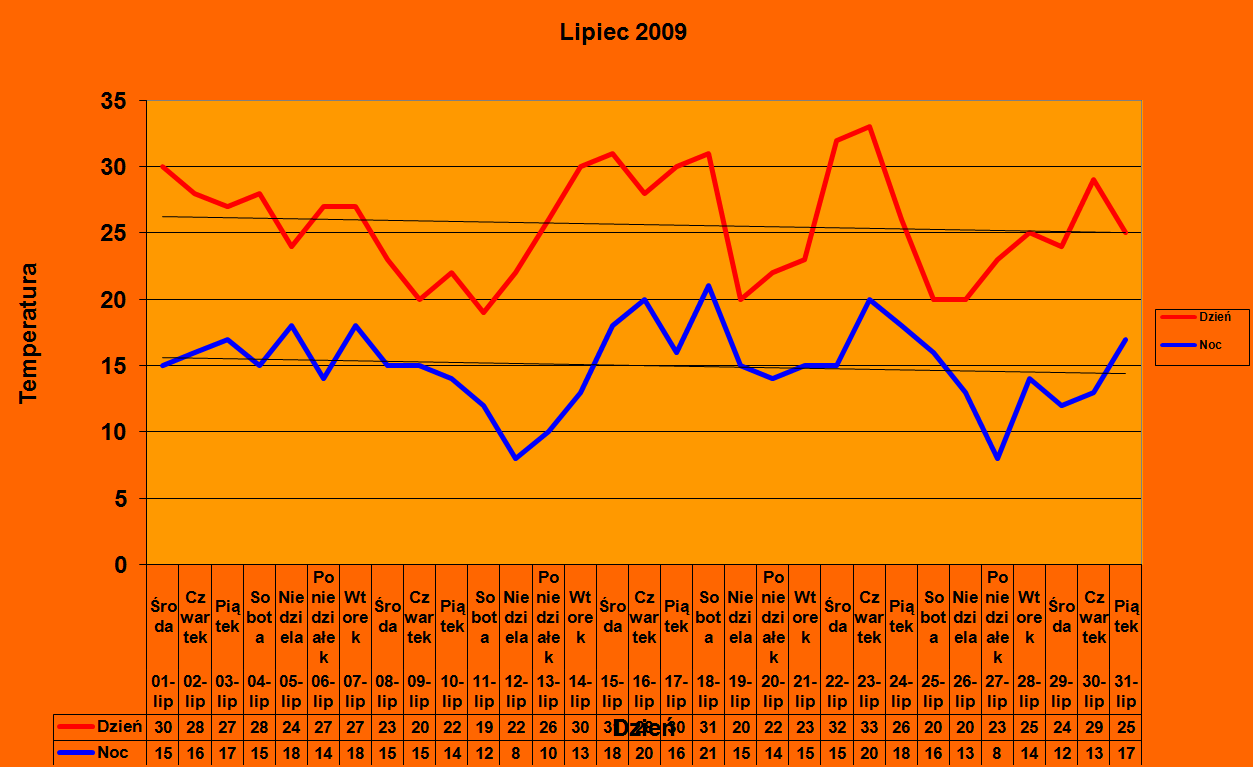Lipiec 2009 przyniósł gwałtowną pogodę. Fale upałów przeplatały się z burzami, które przynosiły ulewne deszcze i grad. Najgorzej było 23 i 24 dnia miesiąca, kiedy nad zachodnią Polską przeszło derecho .