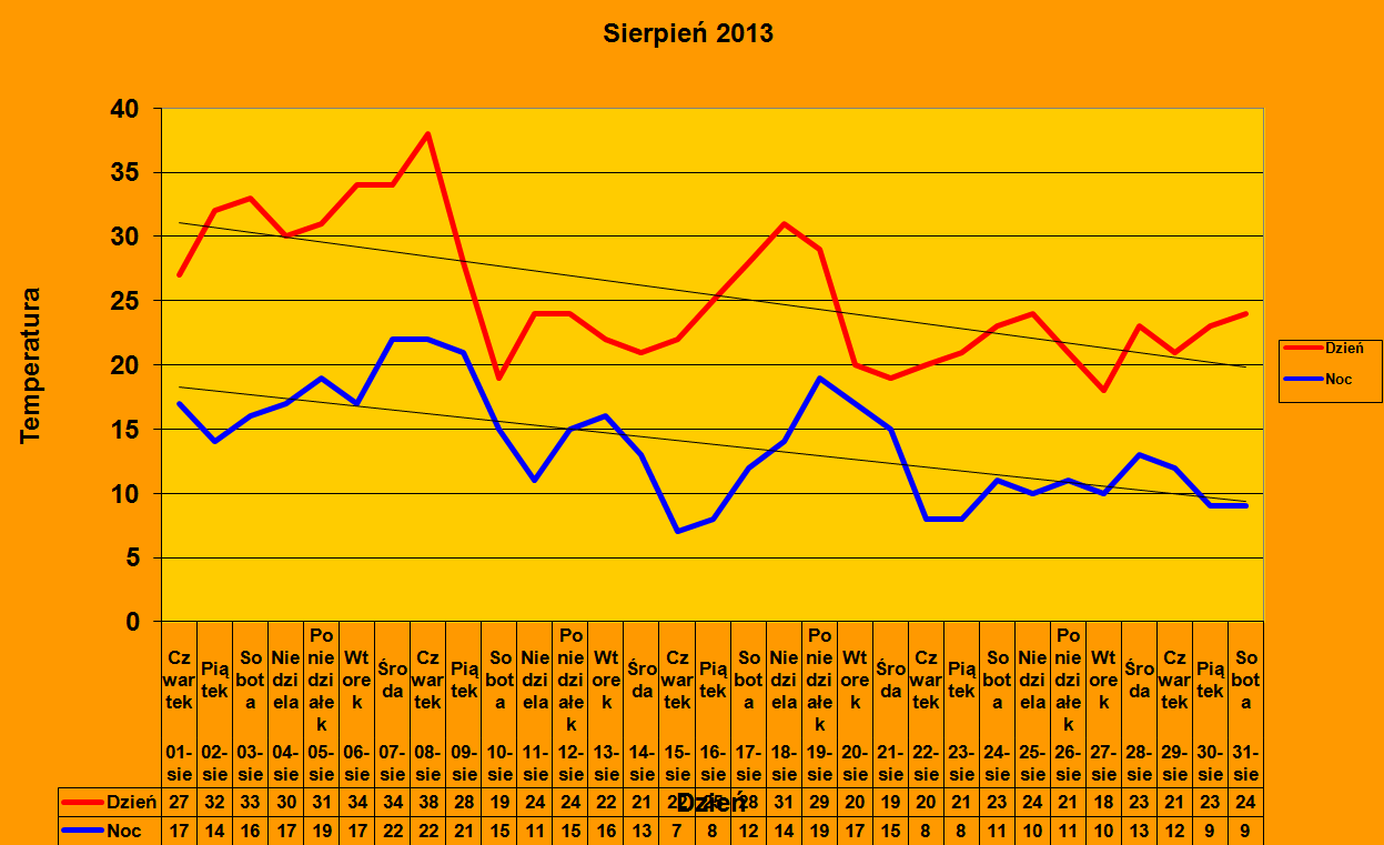Sierpień 2013 rozpoczął się upalnie. Fala upałów trwała tydzień, osiągając apogeum 8 dnia miesiąca. Oficjalnie na stacji w Katowicach zmierzono 37 stopni, lecz niewykluczone, że w Gliwicach oraz w centrach większych miast Górnego Śląska mogło być 38 stopni. W III dekadzie miesiąca nastąpiła zmiana pogody. Było więcej chmur, gorące dni już się nie zdarzały, a noce oraz wieczory były chłodne. Przeciętna końcówka miesiąca była zwiastunem niezbyt ciepłego nadchodzącego września...