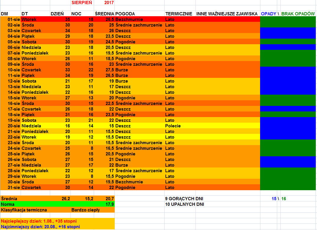 Ta silna burza z 12 sierpnia mnie załamała. :-( Ale poza tym całkiem przyjemny miesiąc i z opadami już było lepiej niż w lipcu. Noce w 1 połowie już lekceważę, bo na ogół przeważała ładna i spokojna aura, no i zdaję sobie sprawę, że jak pojawiają się temp. na poziomie +35 C i więcej, to zakładając że dobowe amplitudy wynoszą koło 20 C (trochę mniej, trochę więcej), to 17-18 C nocą tolerowałem. ;-)