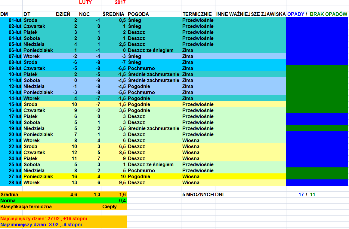 Na początku myślałem, czy patrzę na właściwy luty, ale spojrzałem jeszcze raz i no tak musi być. Myślałem, że to był skrajnie suchy miesiąc, a gdzie tam. W pierwsze dni coś tam padało zarówno deszcz i śnieg, dzięki czemu stopniowo pokrywa śnieżna malała, ale nie stopniała do 0. W 2 połowie 1 dekady nadeszły suche mrozy. Jednak między 10 a 15 dniem zaczęło się coś dobrego dziać- mianowicie, oficjalny koniec pełnowymiarowej zimy. 15 i 16 II temp. w ciągu dnia u mnie sięgnęły i przekroczyły po raz pierwszy w tym roku +10 C, a jeszcze kilka dni wcześniej miały miejsce całodobowe mrozy. To nie był ciemnicowy okres, ale trochę padało, głównie deszcz. Na ogół temp. wynosiły 5-10 C, chociaż 24 II słupki wskazały 12-13 C. ;-) Jakieś ochłodzenia próbowały się wedrzeć, ale ciepło triumfowało, a ostatnie 2 dni to już w ogóle w kwestii tmaks. praktycznie kwiecień. ;-)