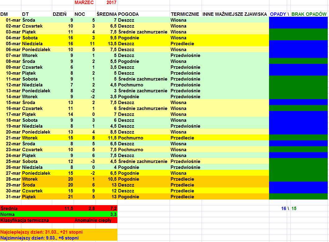 Marzec 2017 zaczął się wyjątkowym ciepełkiem i podobnie się zakończył. Koniec przyniósł ocieplenie do już iście majówkowych wartości. Poza nieudanymi, pseudociepłymi dniami 27 i 28 marca, na finiszu zrobiło się już nad wyraz przyjemnie. Przy pierwszych zbliżeniach do 20 stopni zazieleniła się trawa, tym bardziej że oprócz ciepła i Słońca wystąpiły opady. 31 marca zanotowano 21,1 stopnia, jeden z najwyższych marcowych wyników XXI wieku. Tak rozpoczęła się Kwietniówka, której jednak zbytnio nie szanuję, bo zbytnio i sztucznie napędziła wegetację, która później ucierpiała w zimnej kontynuacji kwietnia. Marzec 2017 jako całokształt był jednak bardzo pozytywny.