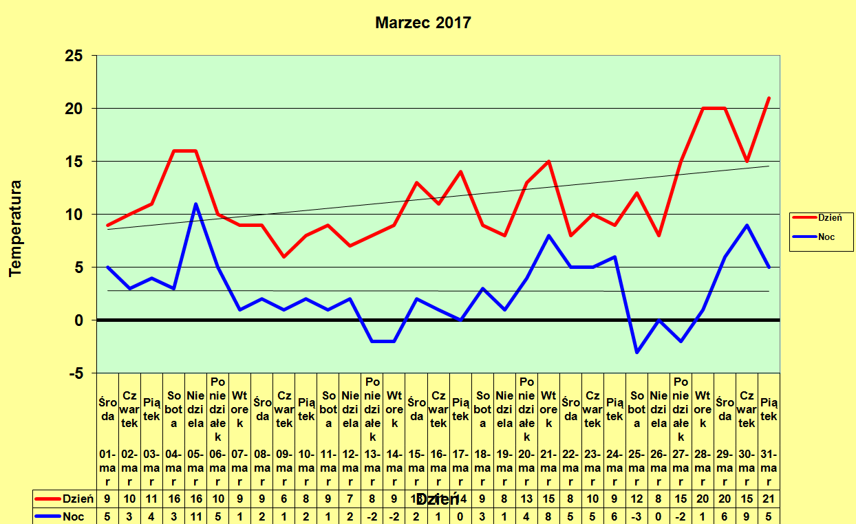 Marzec 2017 roku zapisał się ze średnią temperaturą 6,3 stopnia jako piąty najcieplejszy w historii (równy marcowi 2019, chłodniejszy od 1977, 1990, 2007 i 2014). Na tym lista imponujących termicznych dokonań tego miesiąca się jednak nie kończy. Uplasował się bowiem także na wysokim czwartym miejscu pod względem średniej temperatury minimalnej (1,8), a także pod względem absolutnie najniższej temperatury minimalnej, która wyniosła -3,3. Tu zwycięzcą jest marzec 2007, ten jednak przyniósł więcej spadków poniżej zera. W 2017 roku takowe wystąpiły 10 razy, ustępując w tym aspekcie czterem dawniejszym marcom, w tym 1990, kiedy mrozy zaatakowały w postaci okropnego pseudociepła (takie jak wtedy, to nawet dla mnie jest okropne).