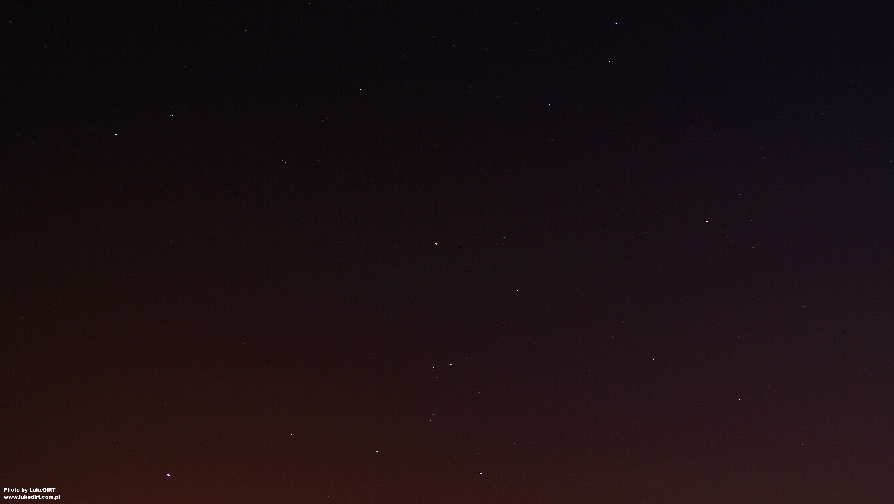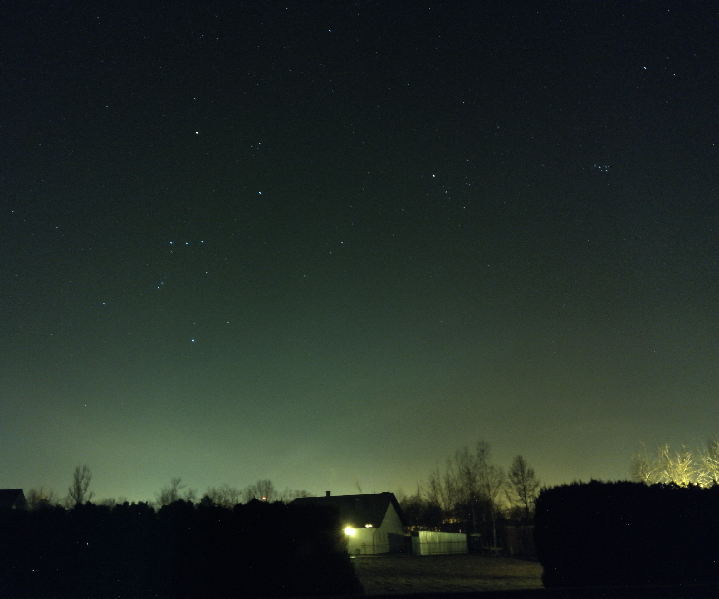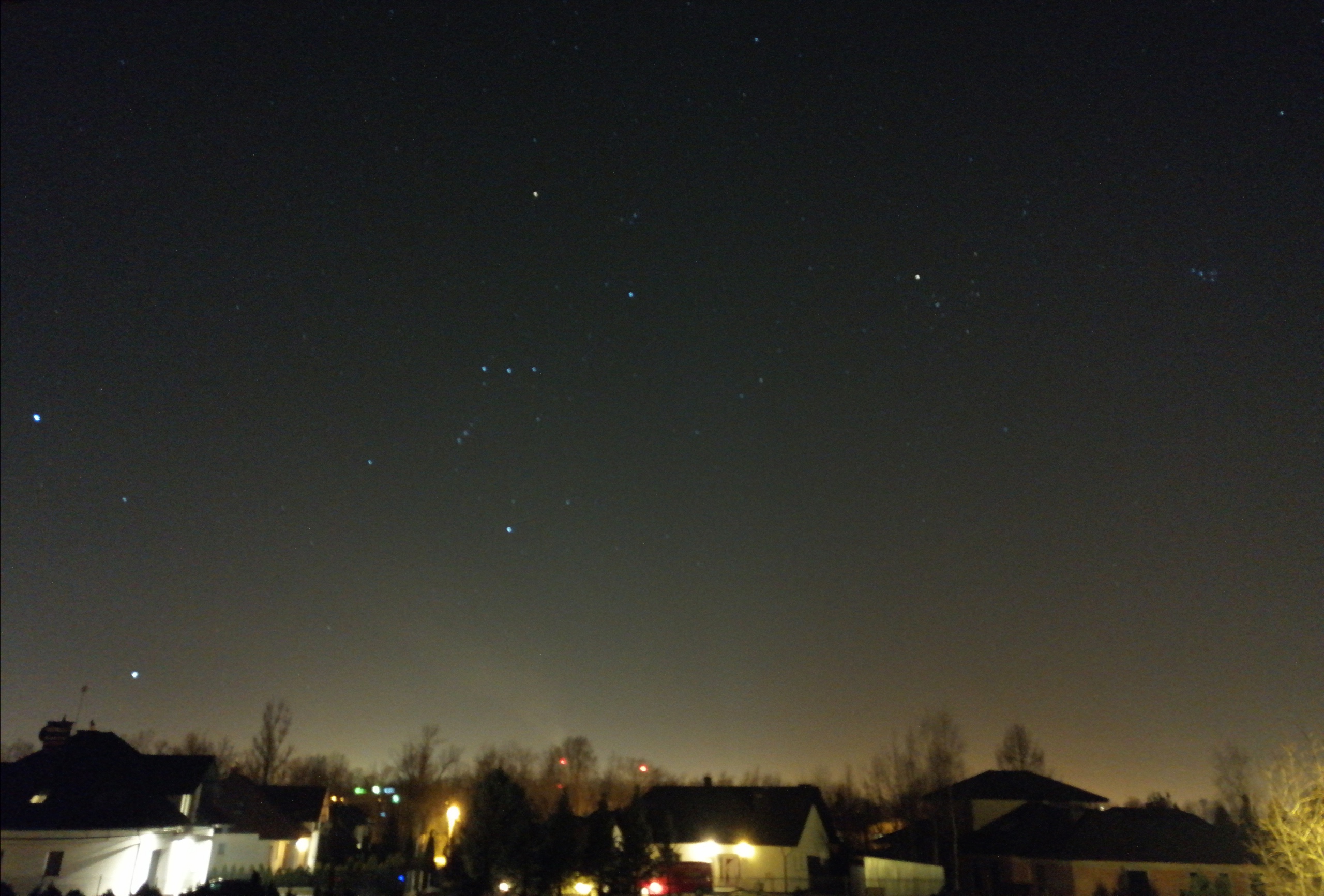 To dzisiejszy Orion kładący się spać. Widać cały Trójkąt Zimowy tworzony przez gwiazdy - Betelgezę, Procjona i Syriusza. Po prawej stronie widoczne są także Plejady. Zdjęcie zrobiłem punktualnie o 20:00 i dosłownie chwilę później pogodne niebo zasnuły chmury.