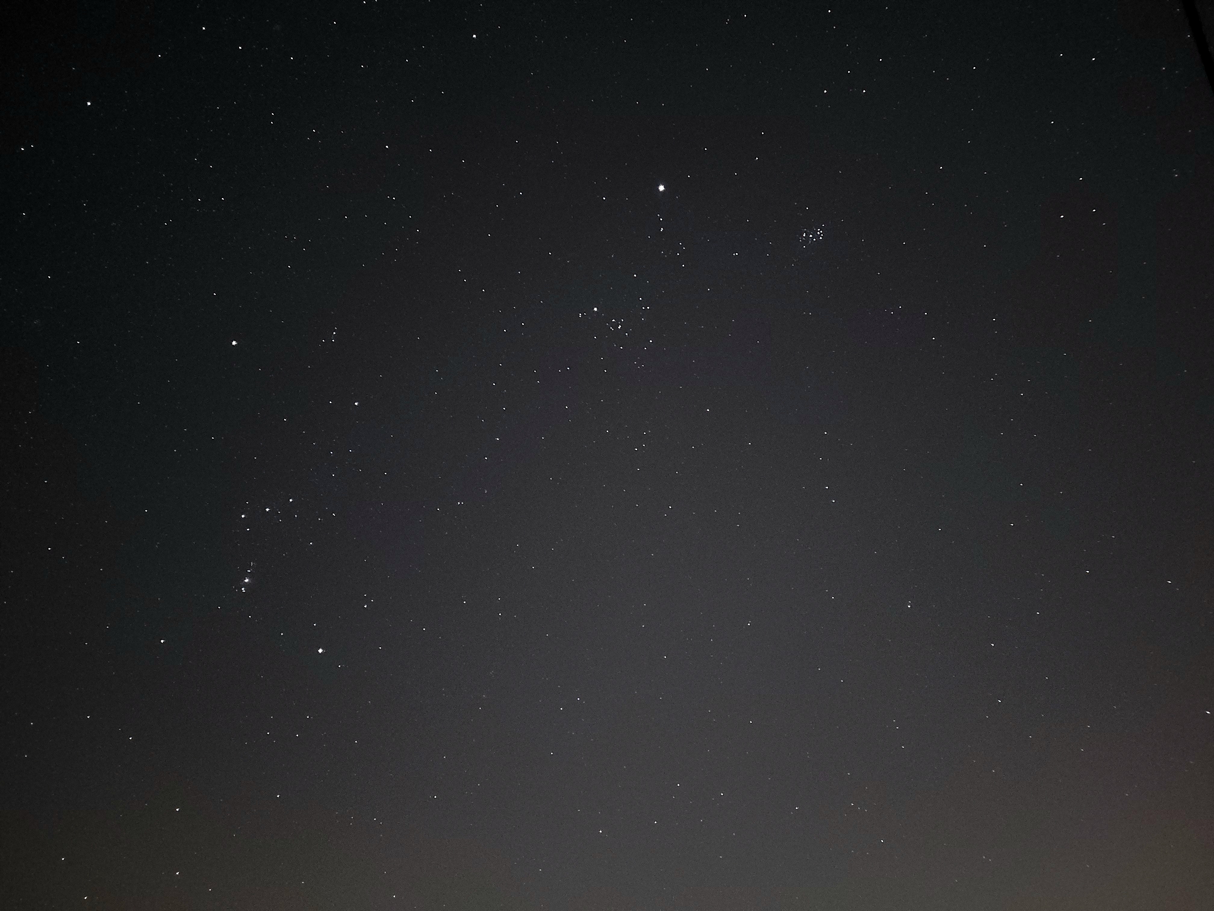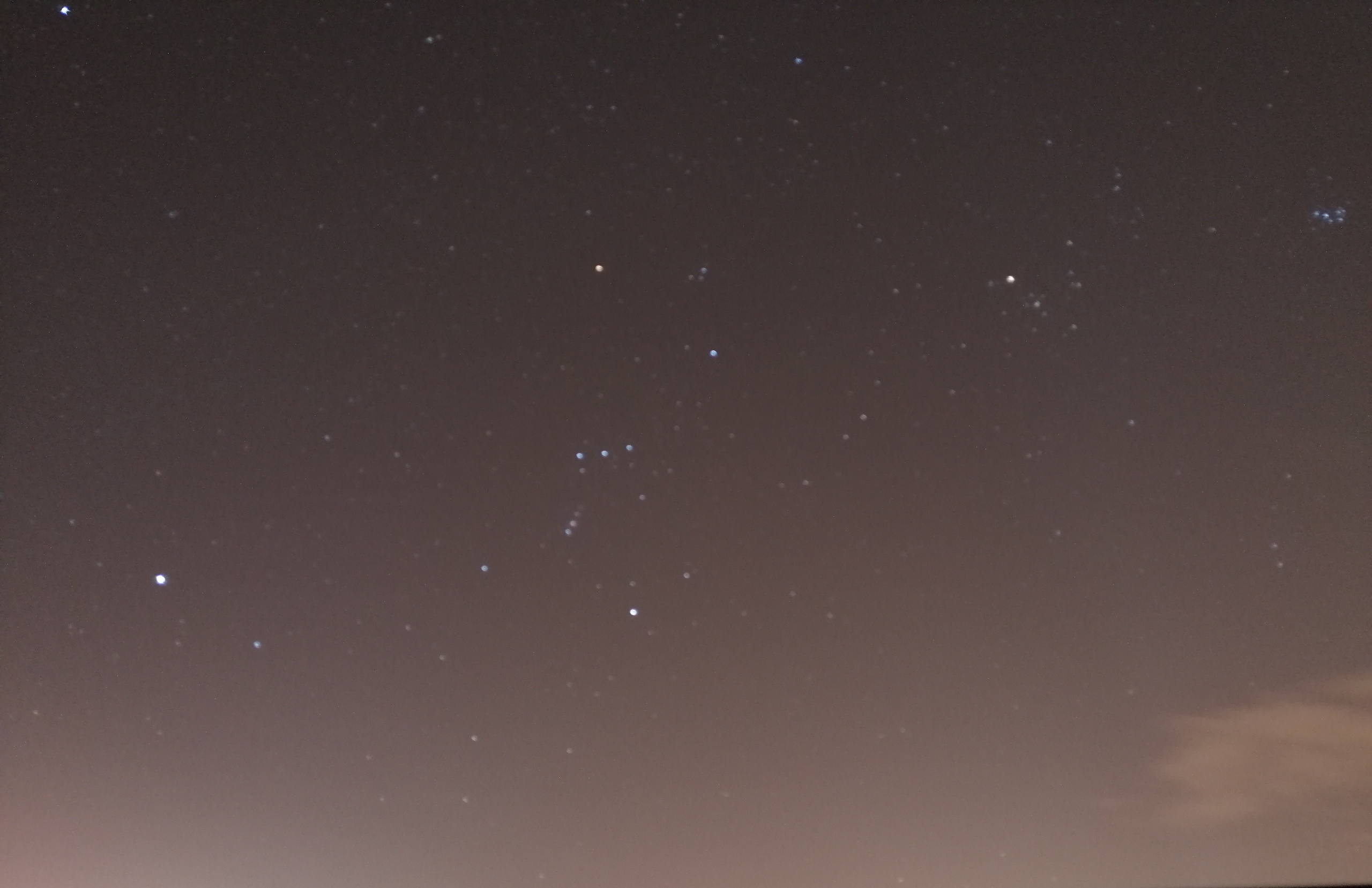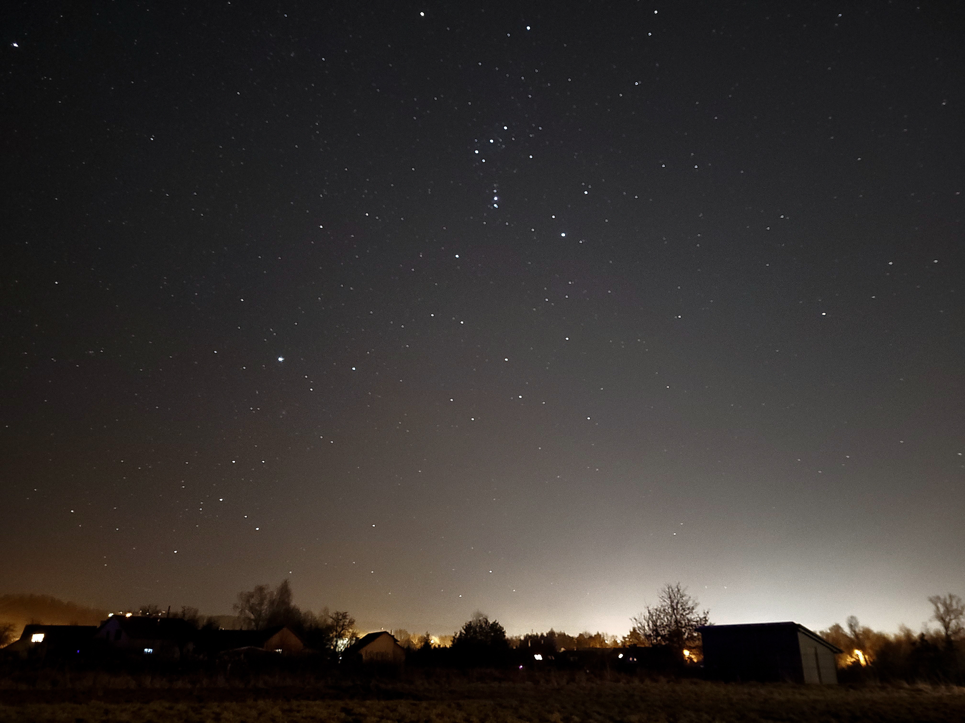 To dzisiejszy Orion kładący się spać. Widać cały Trójkąt Zimowy tworzony przez gwiazdy - Betelgezę, Procjona i Syriusza. Po prawej stronie widoczne są także Plejady. Zdjęcie zrobiłem punktualnie o 20:00 i dosłownie chwilę później pogodne niebo zasnuły chmury.