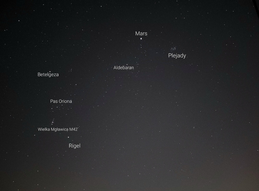 Dzisiejszej nocy gwiazdy na niebie są doskonale widoczne. Pogoda przynajmniej w tym aspekcie dopisała, co pozwoliło na nacieszenie się widokiem Oriona i otaczających go konstelacji, na tle których świeci jasny, czerwony Mars. Przedstawiam kilka zdjęć, które wykonałem dzisiejszej nocy krótko po godzinie 22:00 28 grudnia. Ostatnie wklejam w wersji oryginalnej i z podpisami, dla wskazania najważniejszych obiektów, jakie aktualnie przykuwają uwagę na nocnym niebie