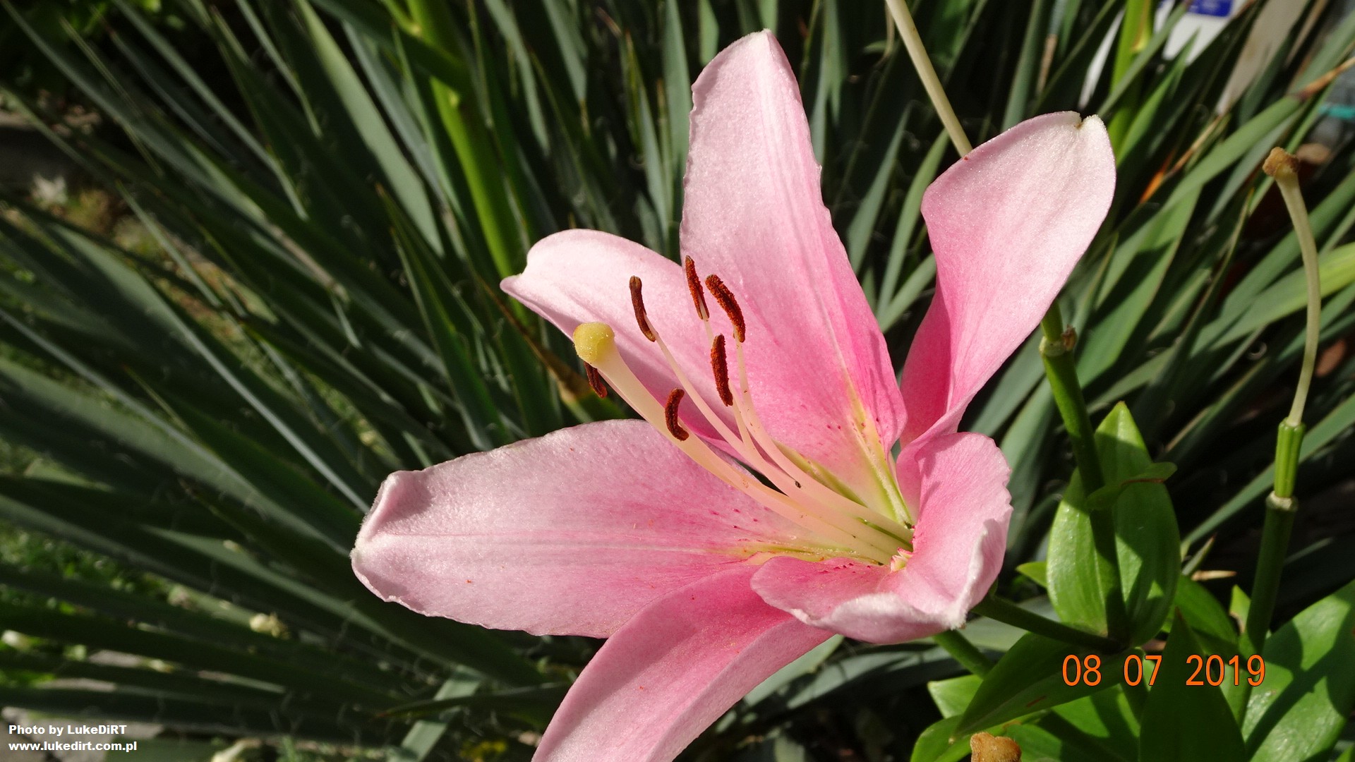 Może nie całkiem. Ten różowy to lilia lub liliowiec rosnący obok juki, to te wąskie liście.