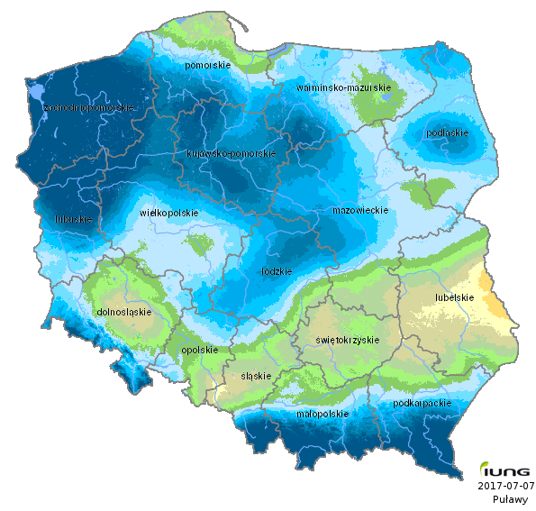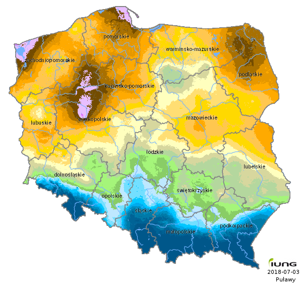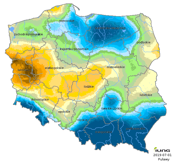 Wakacje 2013 były naprawdę ekstremalnie słoneczne i do tego w południowej połowie Polski bardzo suche. Szczególnie oberwało południe mazowieckiego, czy świętokrzyskie, gdzie ani w lipcu, ani w sierpniu, nie doczekano się prawdziwych opadów. Ale sytuacja glebowa, a tym bardziej hydrologiczna, zbytnio na tym nie ucierpiała, dzięki właśnie poprzednim kilku miesiącom - ale mapka KBW o tym nie ma pojęcia, co było przed 1.07.
