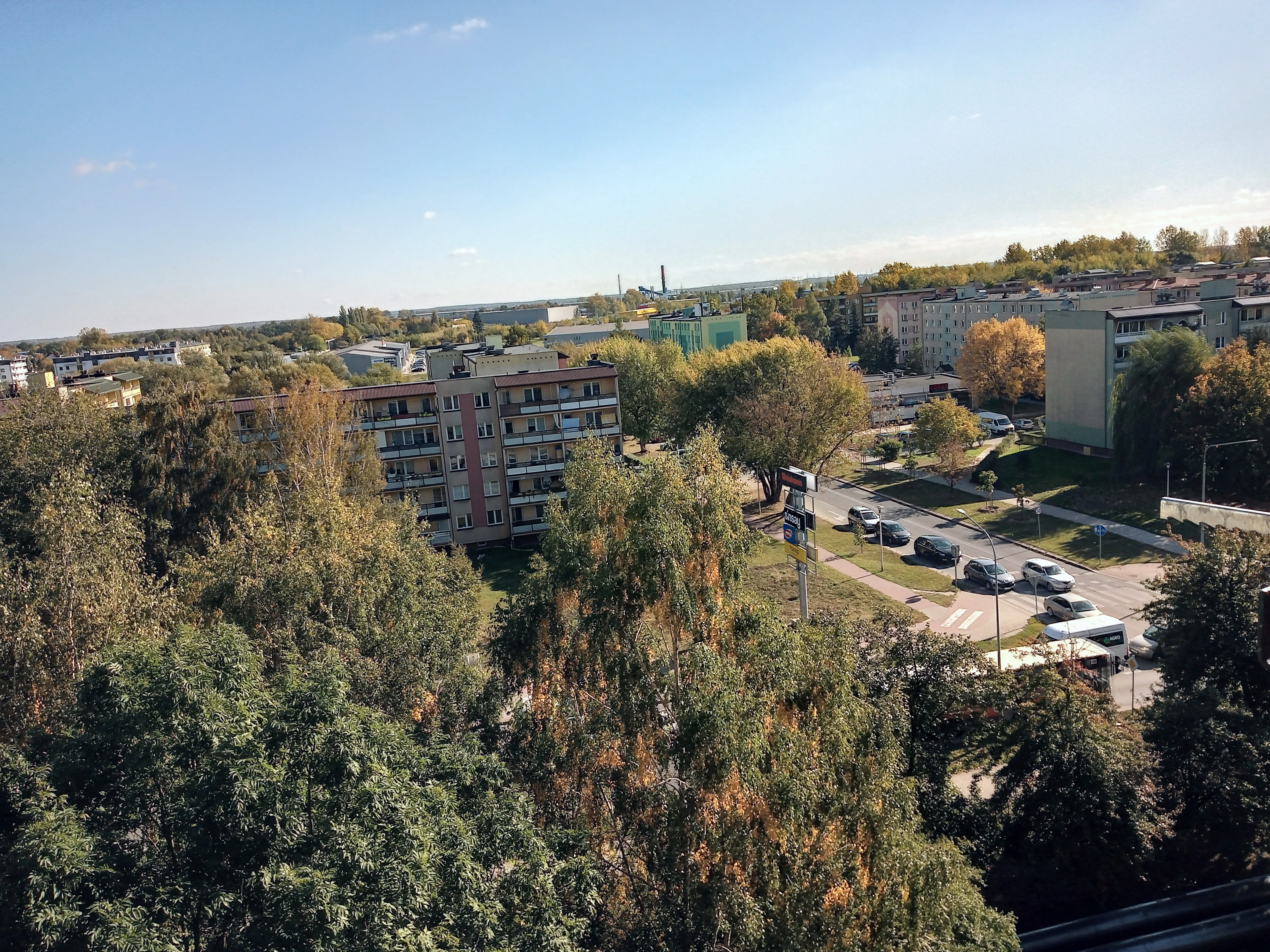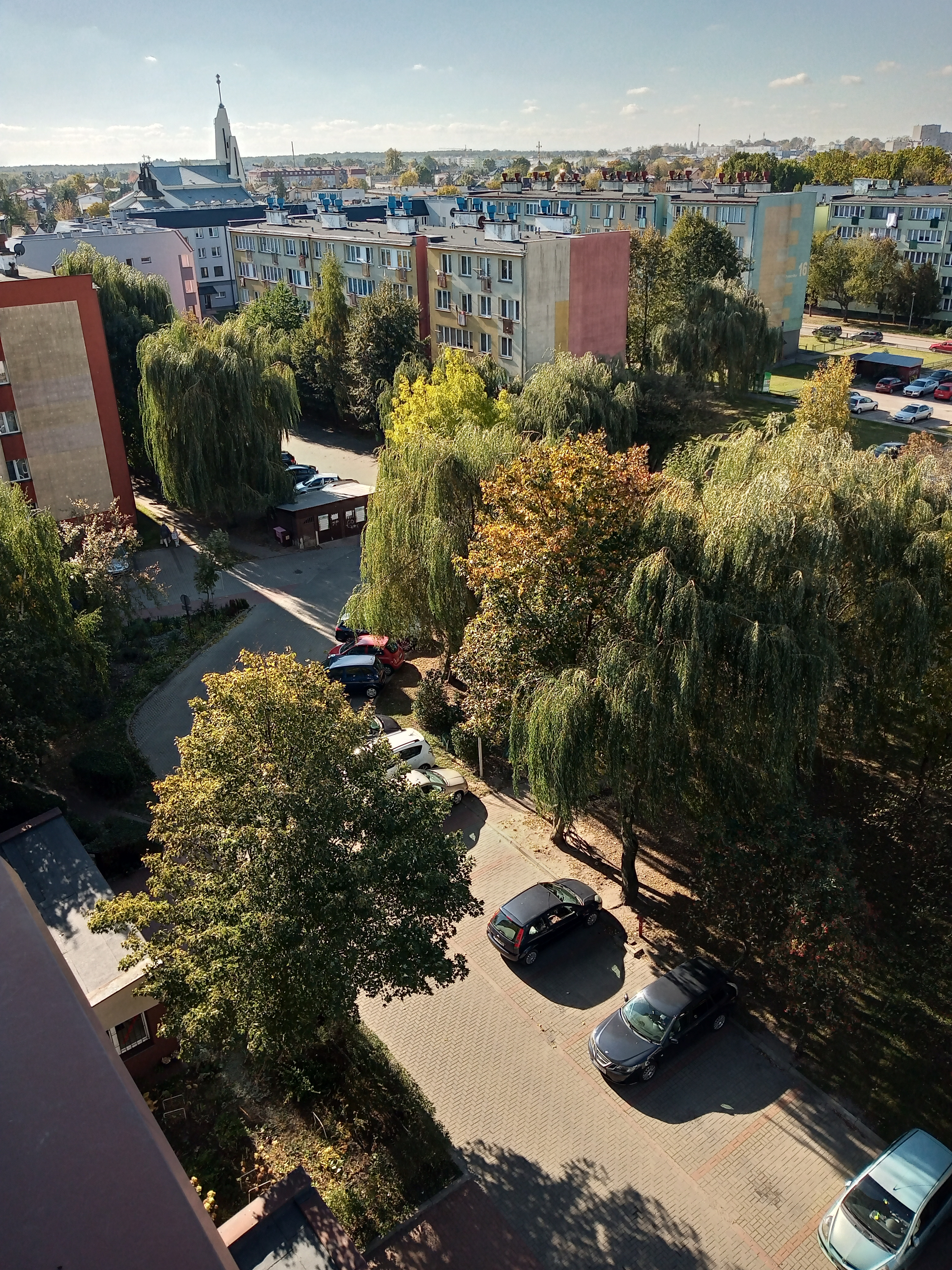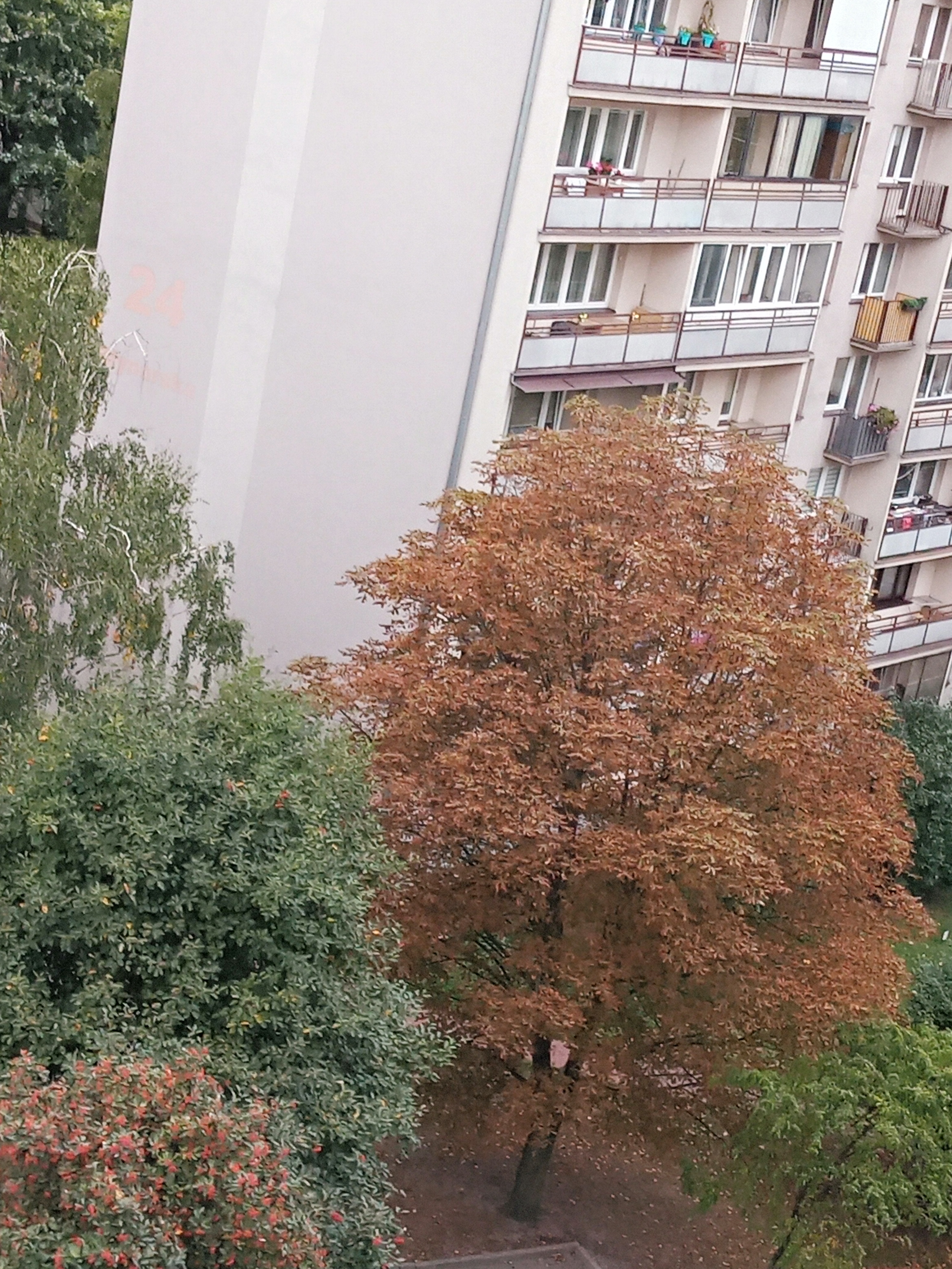 Końcówka drugiej dekady października. Niektóre drzewa jeszcze zielone, niektóre już się przebarwiają: