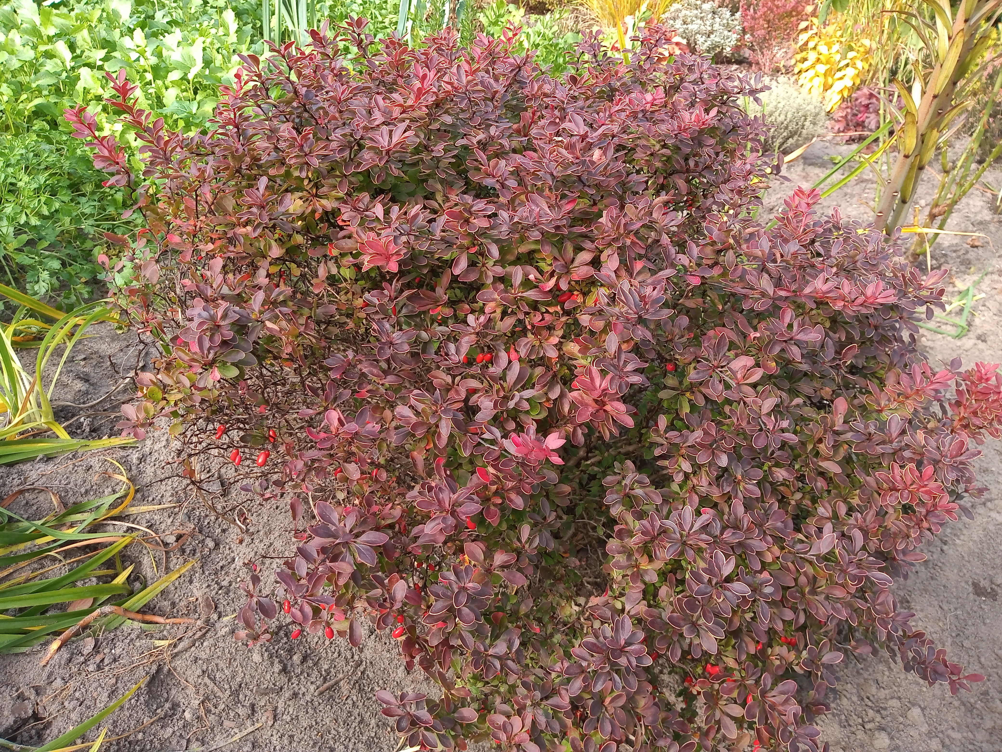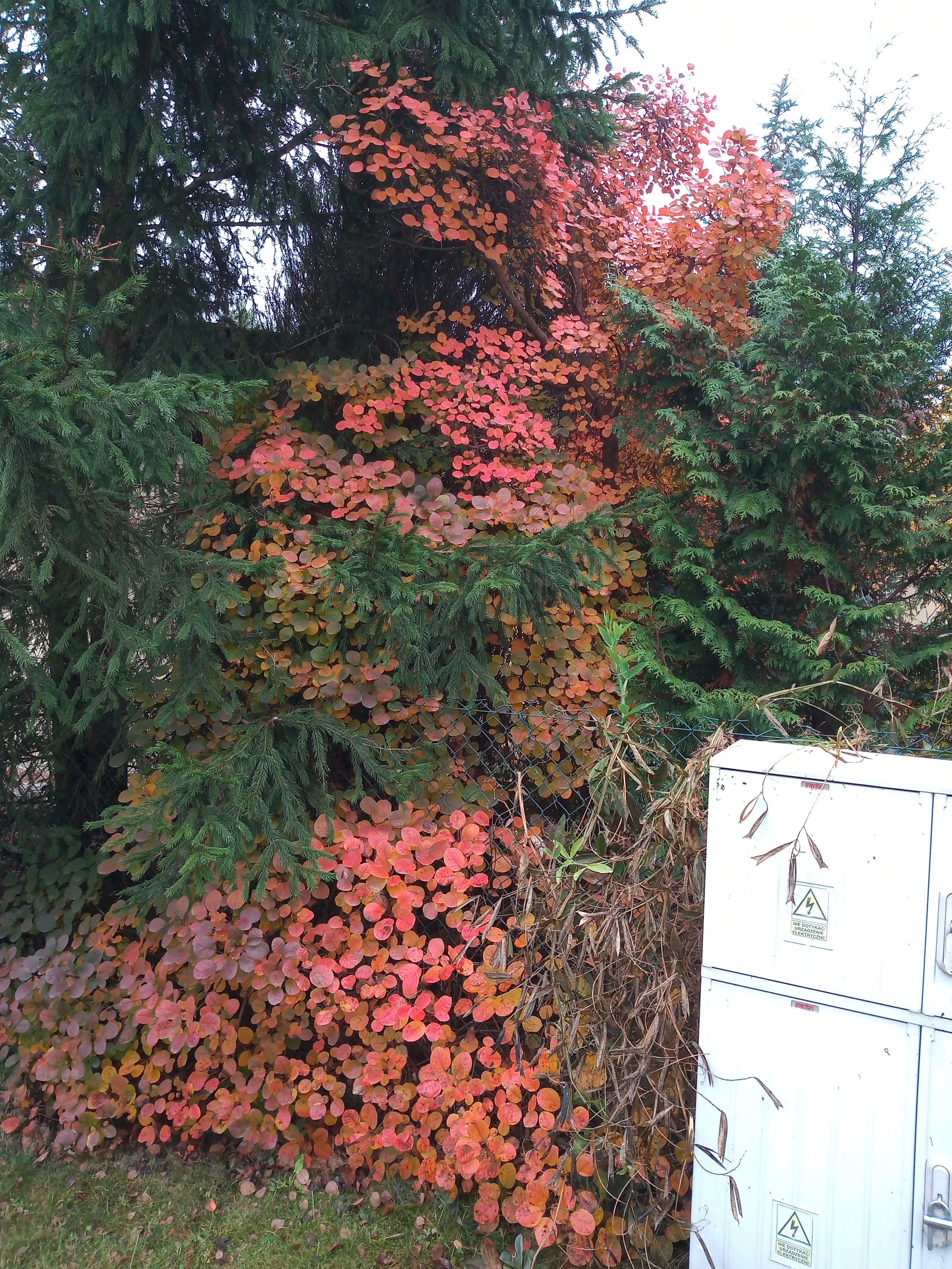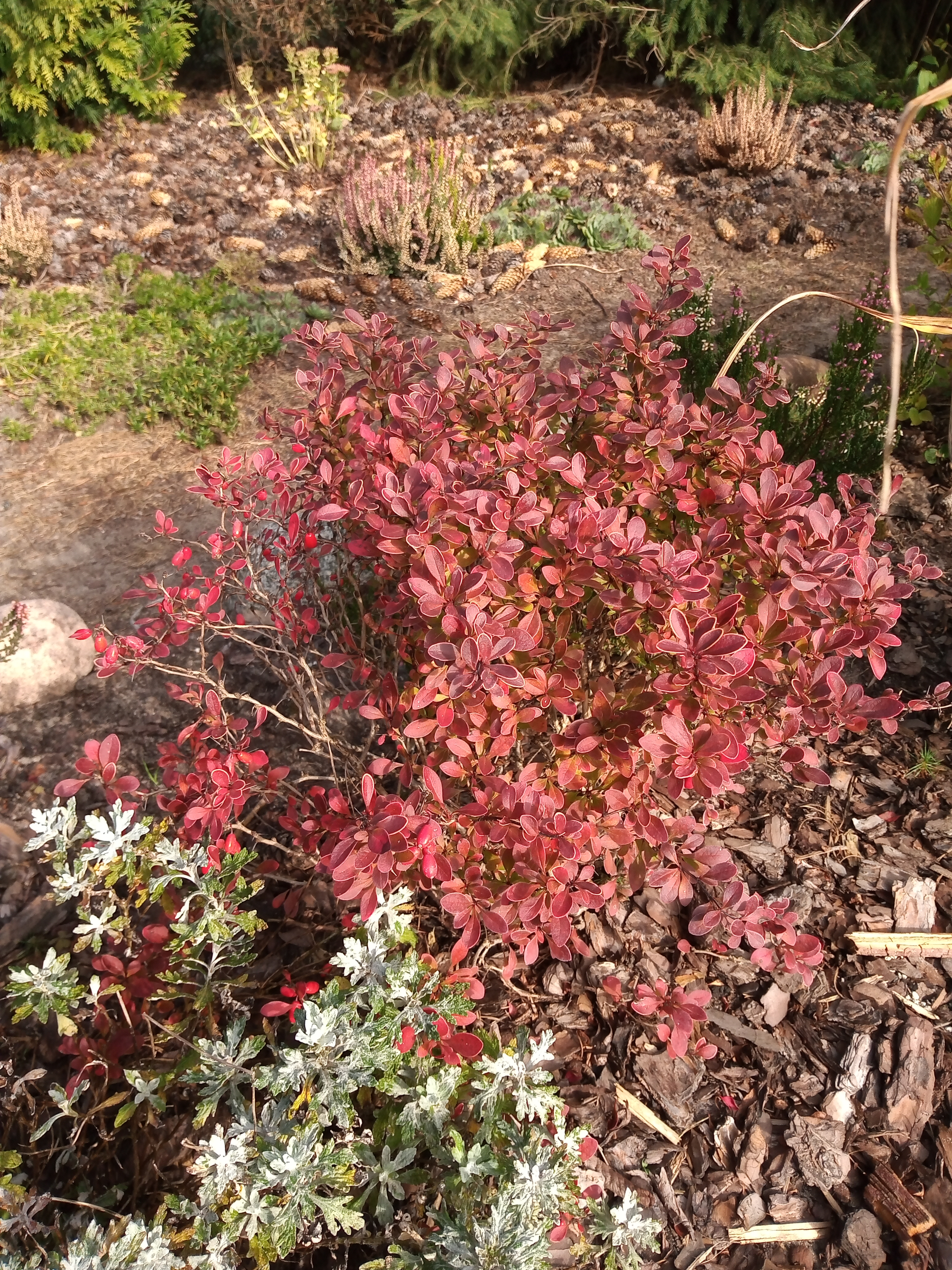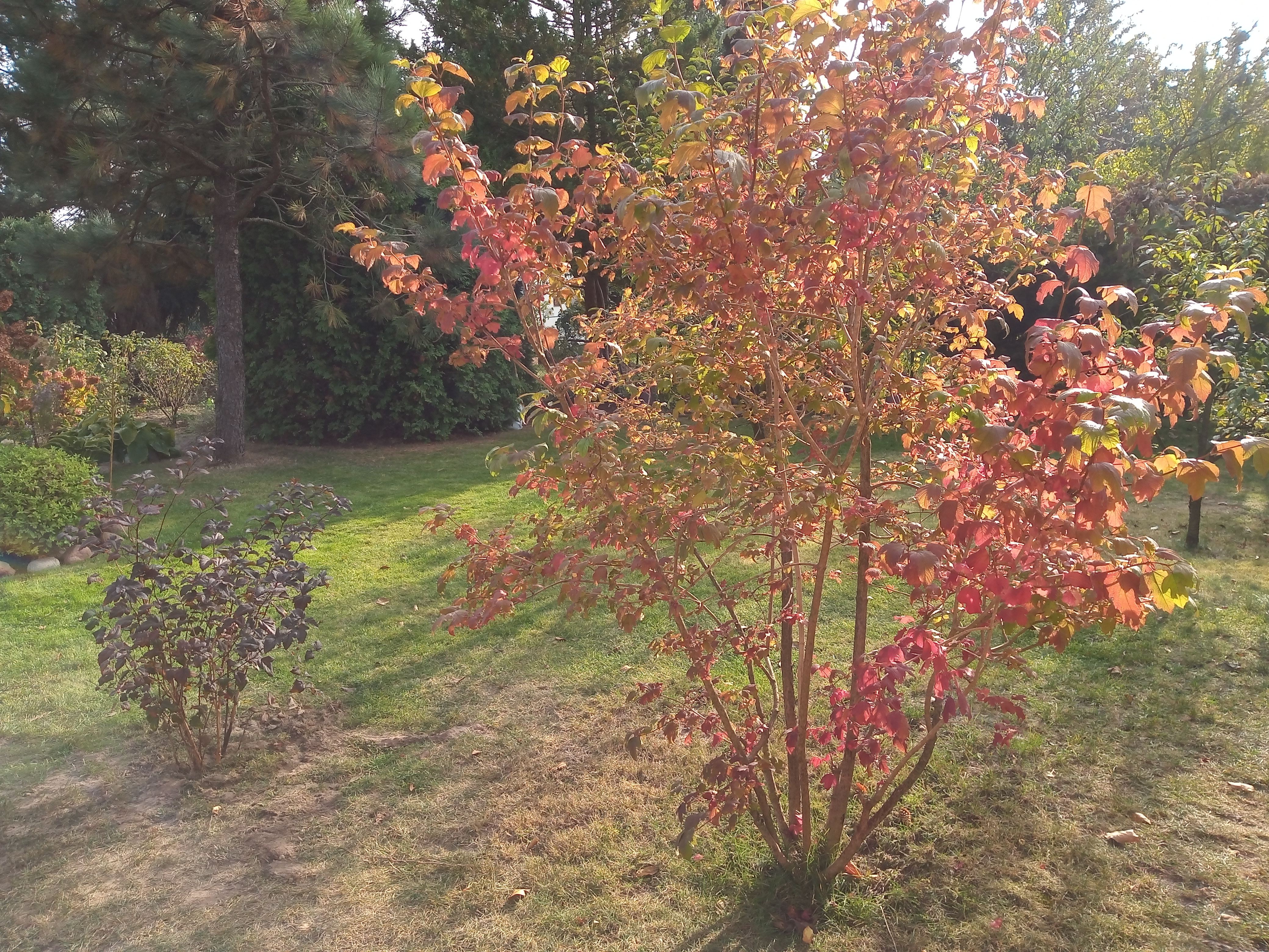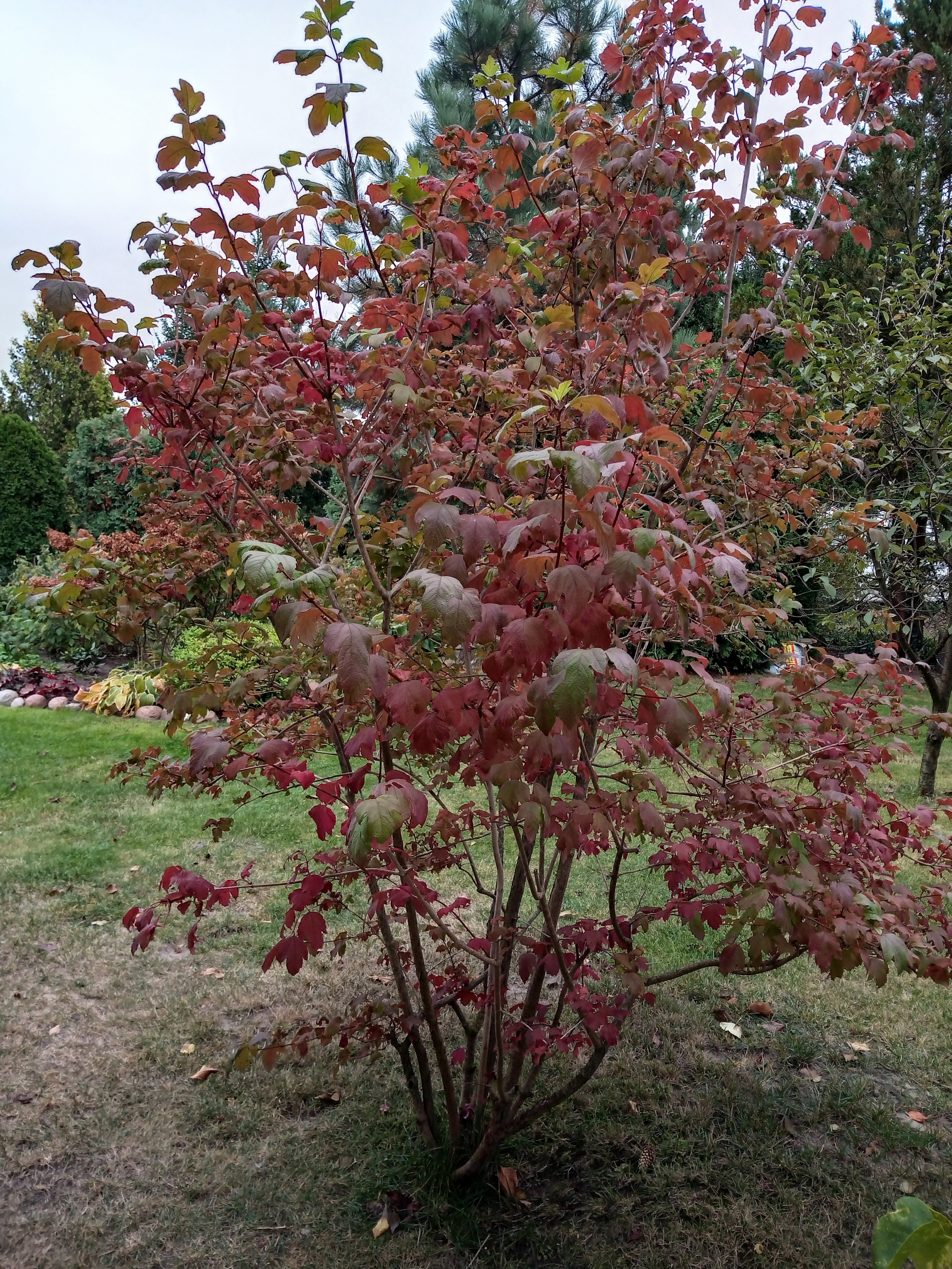 Dzisiaj obok niej posadziliśmy krzew czerwonej pęcherznicy. Ona jest ciemno czerwona przez cały rok.