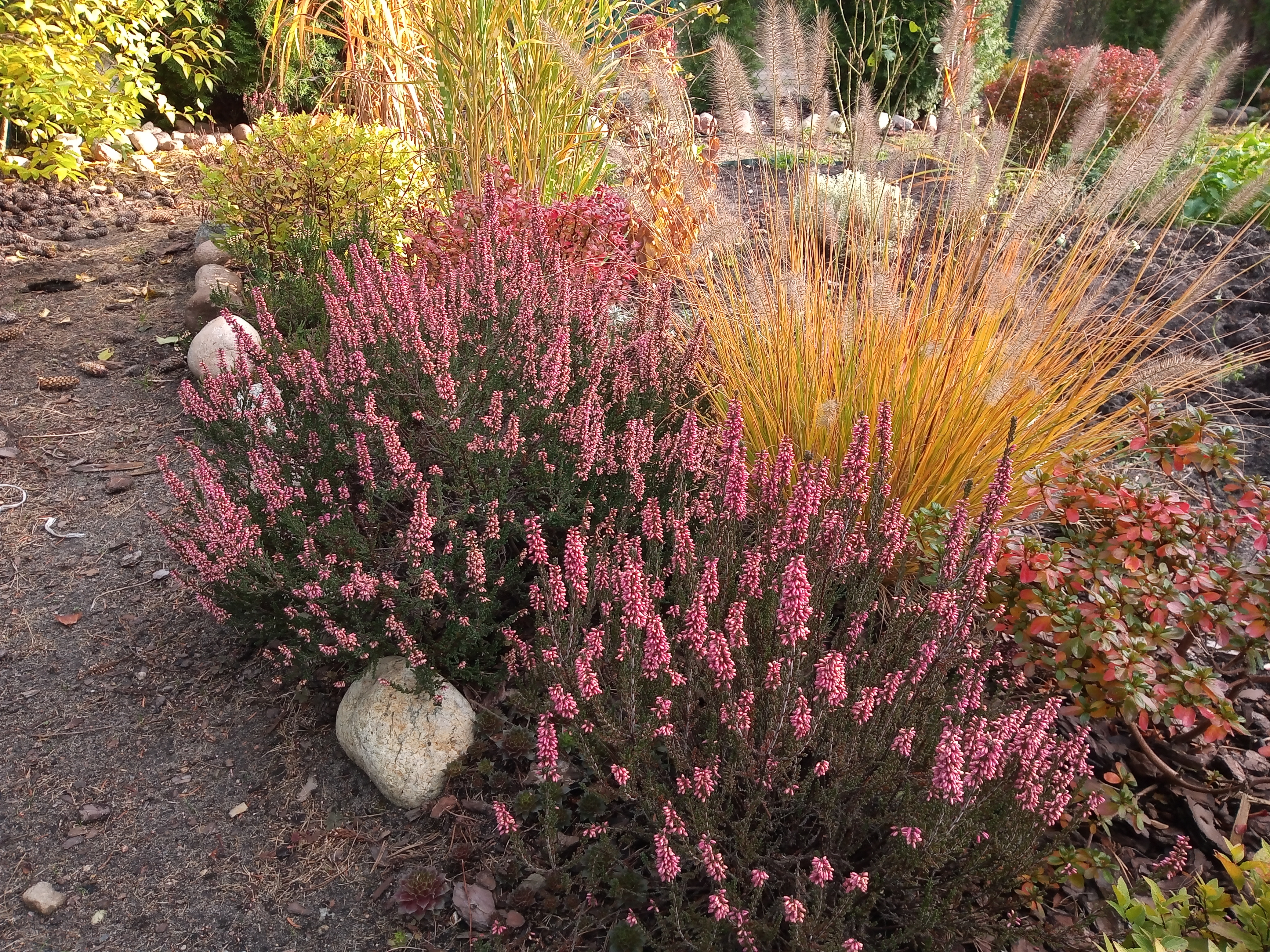 Kwitnące wrzosy oraz przebarwione trawy ozdobne i krzewy.
