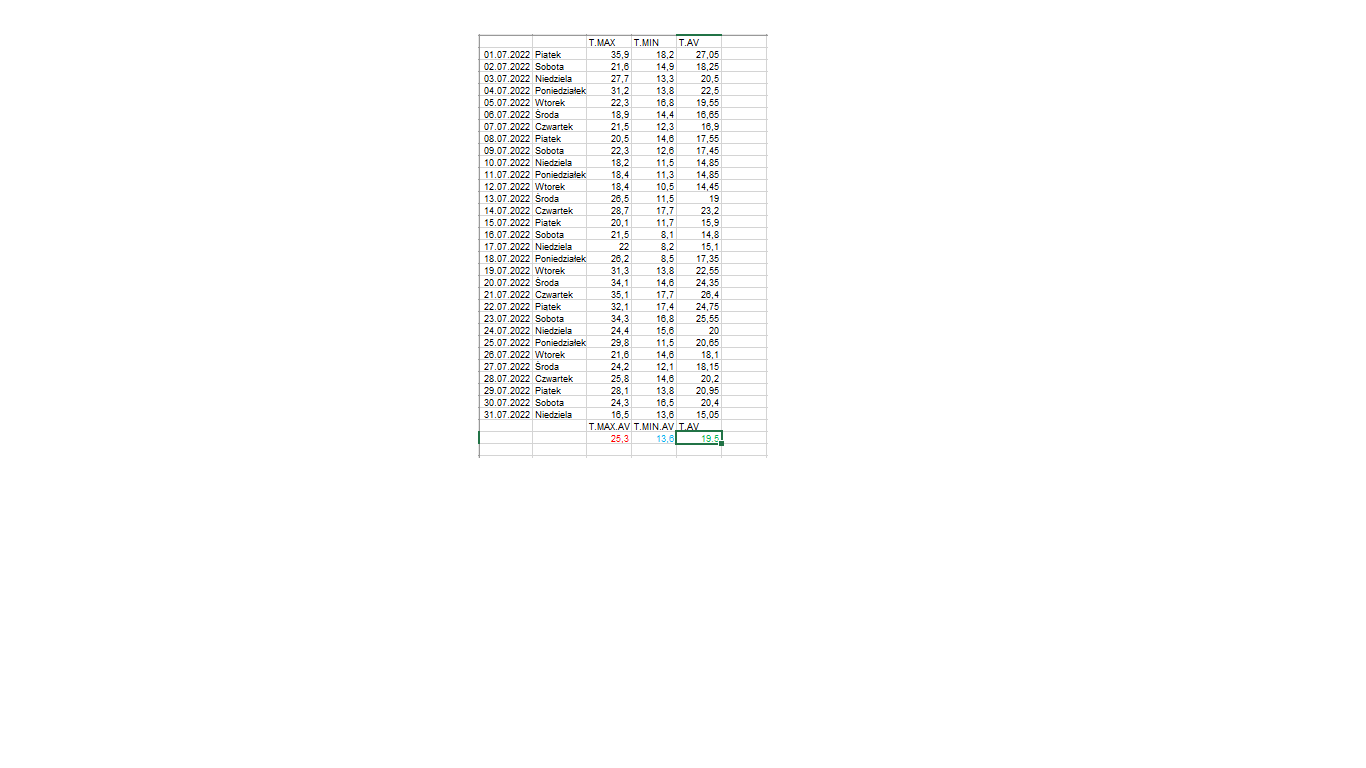 Oto statystyki bieżącego miesiąca u mnie. Mocno przypomina mi on lipca sprzed 15 lat i podobnie jak tamten nie zapisał się on jako zbyt udany miesiąc Największy zarzut mam nawet nie tyle do temperatur co do totalnego braku aury, która z tym miesiącem kojarzy się najbardziej- u mnie tak na prawdę nie było żadnej porządnej burzy- kilka razy pierdziało coś z oddali, a najbliżej trafiało chyba 16.07, i była to niestety burza lodowa.