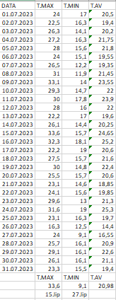 Pomimo bardzo wysokiej temperatury średniej, lipiec 2023 nie był miesiącem upalnym. Wystąpiły tylko cztery przekroczenia 30 stopni, a taka ilość "30-tek" nieraz występowała w sporo chłodniejszych lipcach. Najbardziej upalnym momentem był weekend 15-16 lipca. To w niedzielę 16-go zanotowano absolutnie najwyższą temperaturę maksymalną (32,3, więc również bez szału jak na miesiąc tej klasy) i średnią (25,4, to akurat wyczyn).