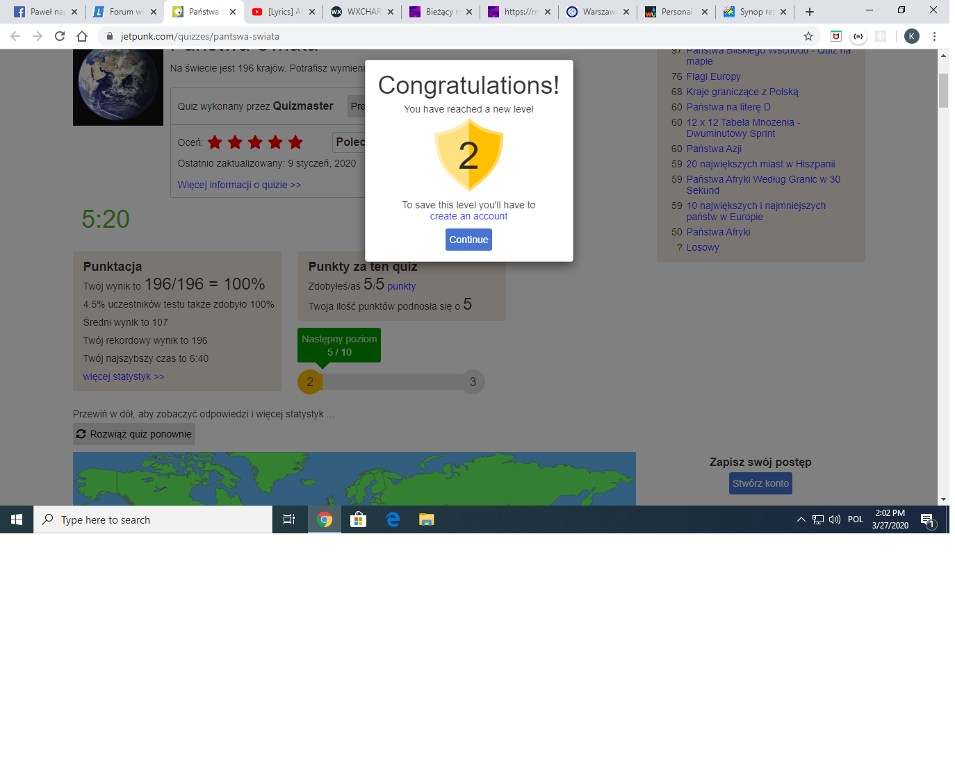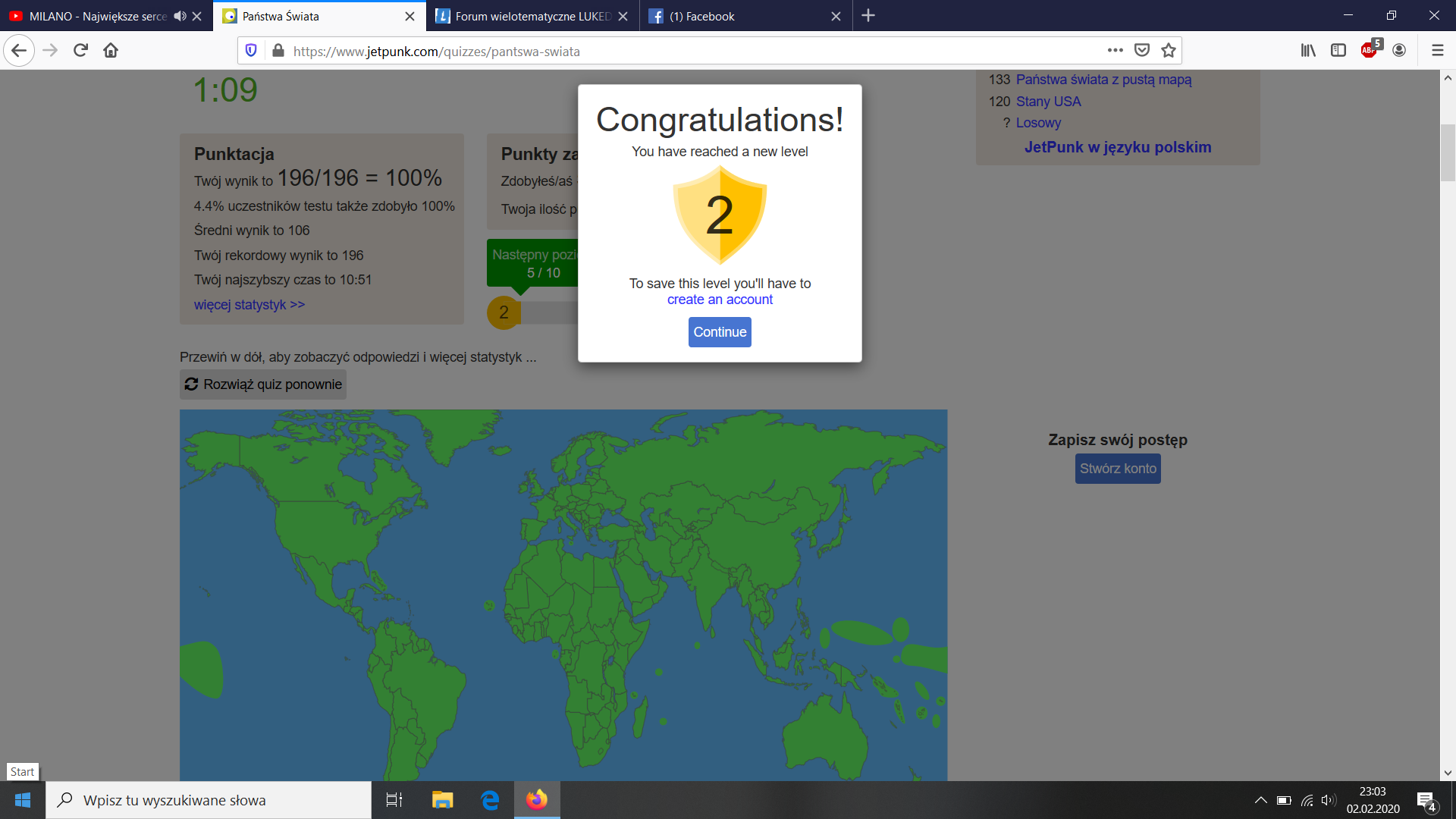 Nareszcie się udało. Podszedłem do quizu na pełnym luzie, bez napinki i spokojnie, tak że sam byłem zaskoczony że dałem radę. Na około 3 minuty przed końcem czasu brakowało mi jednego małego krajów i musiałem sobie powiększyć mapę kliknięciem, żeby zobaczyć w której części świata Musiałem się długo namyślić, bo za nic nie mogłem sobie przypomnieć o co chodzi i wreszcie nadszedł moment olśnienia - Dżibuti