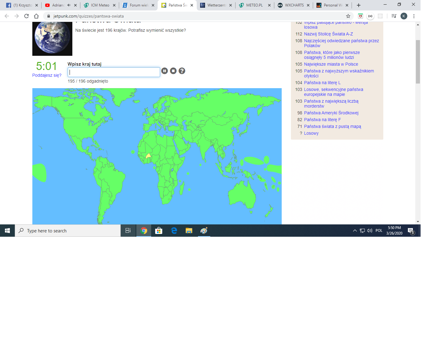 No i pobiłem "swoisty" rekord, udało mi się bowiem osiągnąć wynik 195/196 z 5 minutowym zapasem i to - uczciwie i z ręką na sercą - bez podpowiedzi alfabetycznych (patrzenia na luki). Po prostu - patrzyłem na dany kraj i starałem się skojarzyć jego nazwę, czasem się przy tym myliłem (pomyliłem np Benin z Togiem, ale obie nazwy kojarzyłem)
