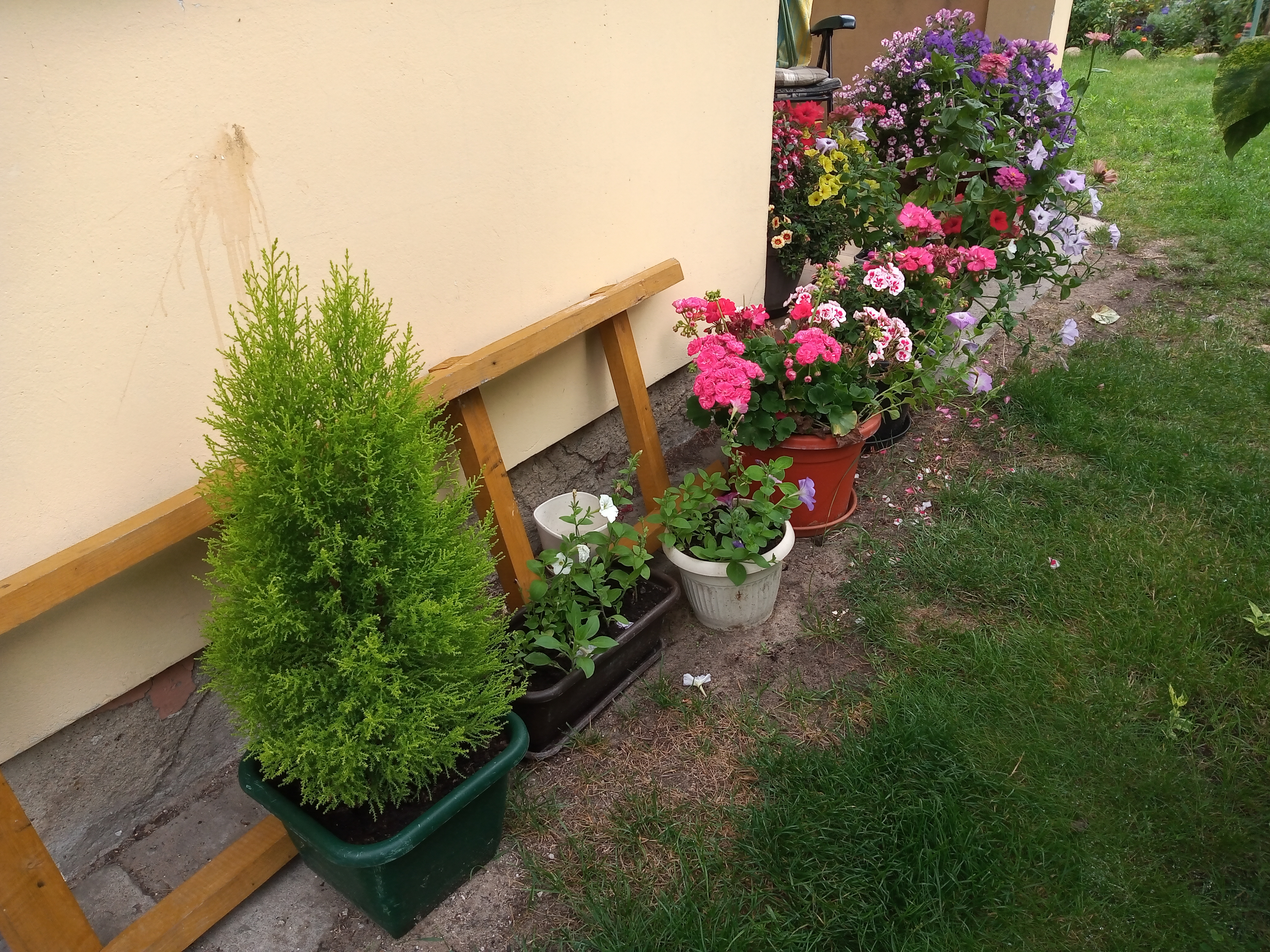 Padało, gdy wróciliśmy już do domu. Nieraz się zdarzało, że pomimo niewielkiej odległości (7 km) deszcz niekiedy pada tylko w Siedlcach, a innym razem, chociaż rzadziej, tylko w Golicach i w Jagodni. A niekiedy i tu i tam. Tak więc nie potwierdzam, ale i nie zaprzeczam. Co do kwiatów to zasługa mojej żony podlewającej wężem roślinność, zresztą nie wiedząc czy będzie padać (bo ostatnio deszczowe chmury przeważnie przechodziły bokiem), w dniu dzisiejszym szlauch także "był w robocie". Ciekawe, ile w tym roku policzą nam wodociągi za zużycie wody.