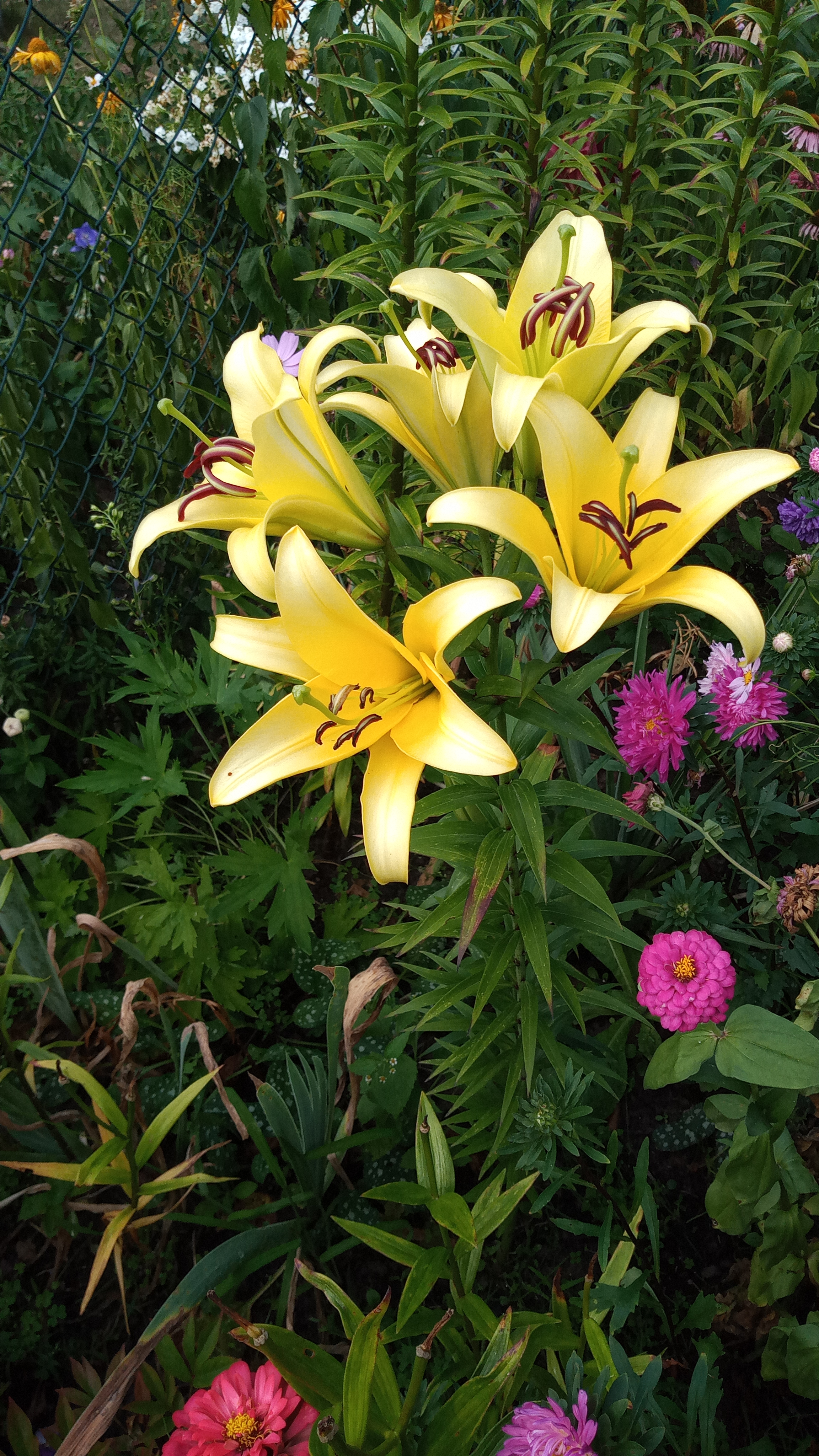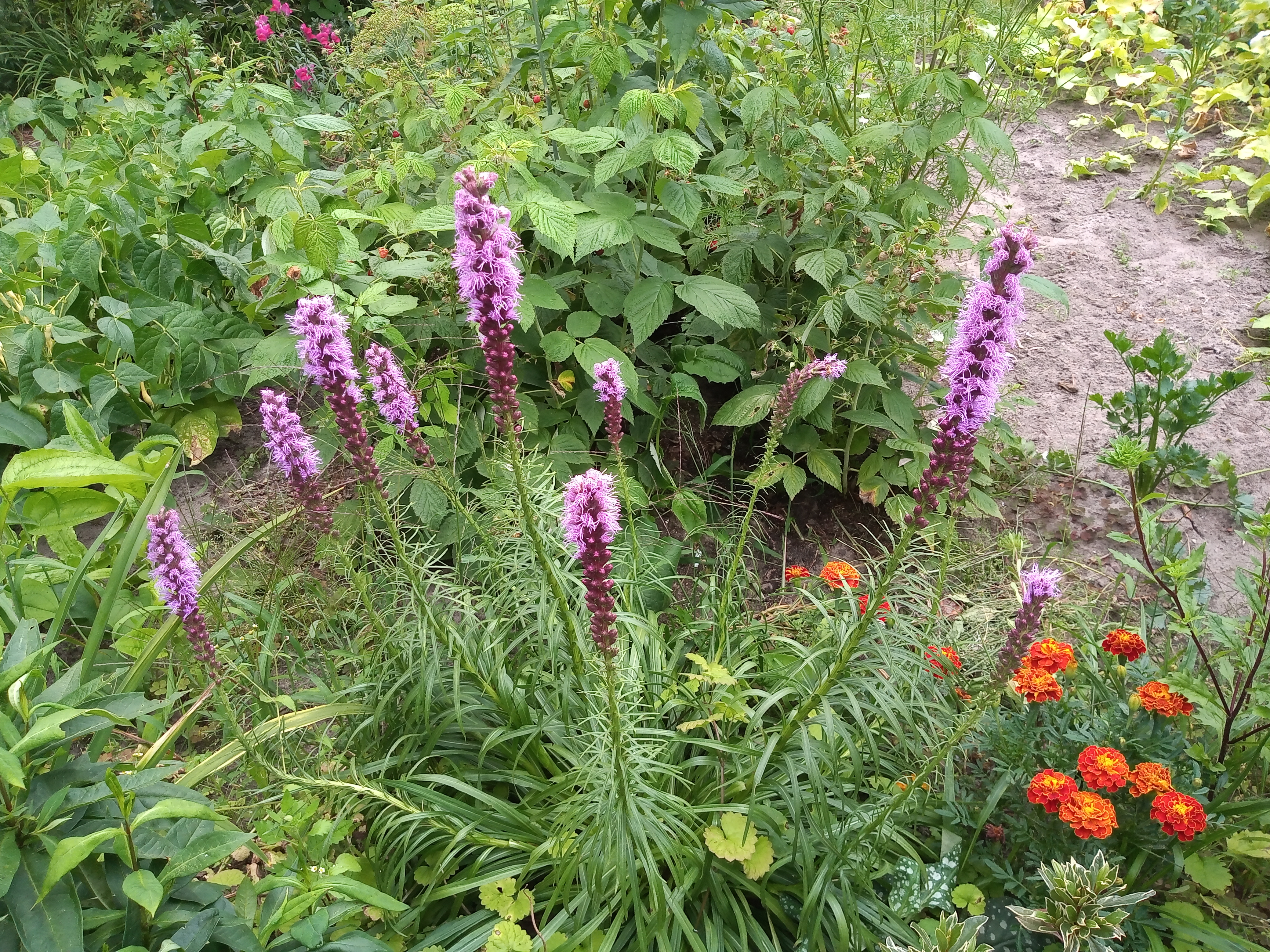 Mieczyk i astry. Zwróć uwagę na wyschnięty trawnik.
