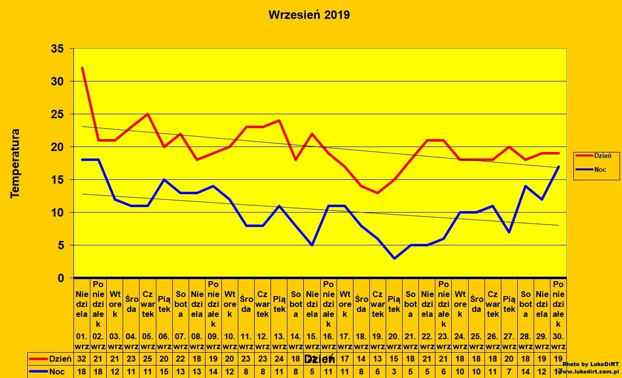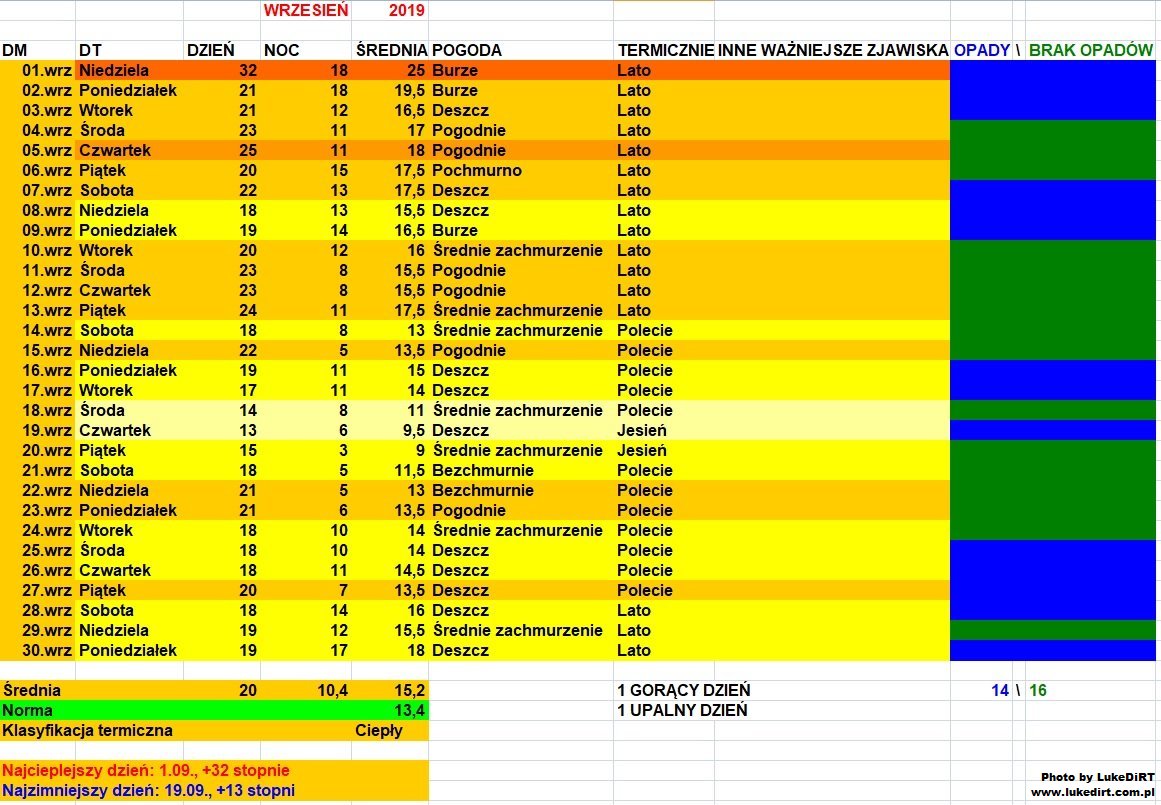 Wrzesień 2019 był miesiącem lekko powyżej normy jeśli chodzi o temperaturę, a ilość opadów osiągnęła mniej więcej normę. Był to mocno zwyczajny miesiąc - było trochę słonecznych, ale i też deszczowych dni. Były dni ciepłe i bardzo ciepłe, ale były też dni chłodne.