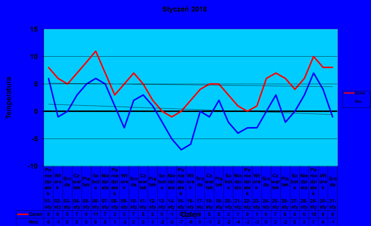 Był to miesiąc ciepły, nawet bardzo ciepły. Zdarzały się dni z dwucyfrową temperaturą na plusie. Nie było za to dużych mrozów dwucyfrowych, nawet nocami.