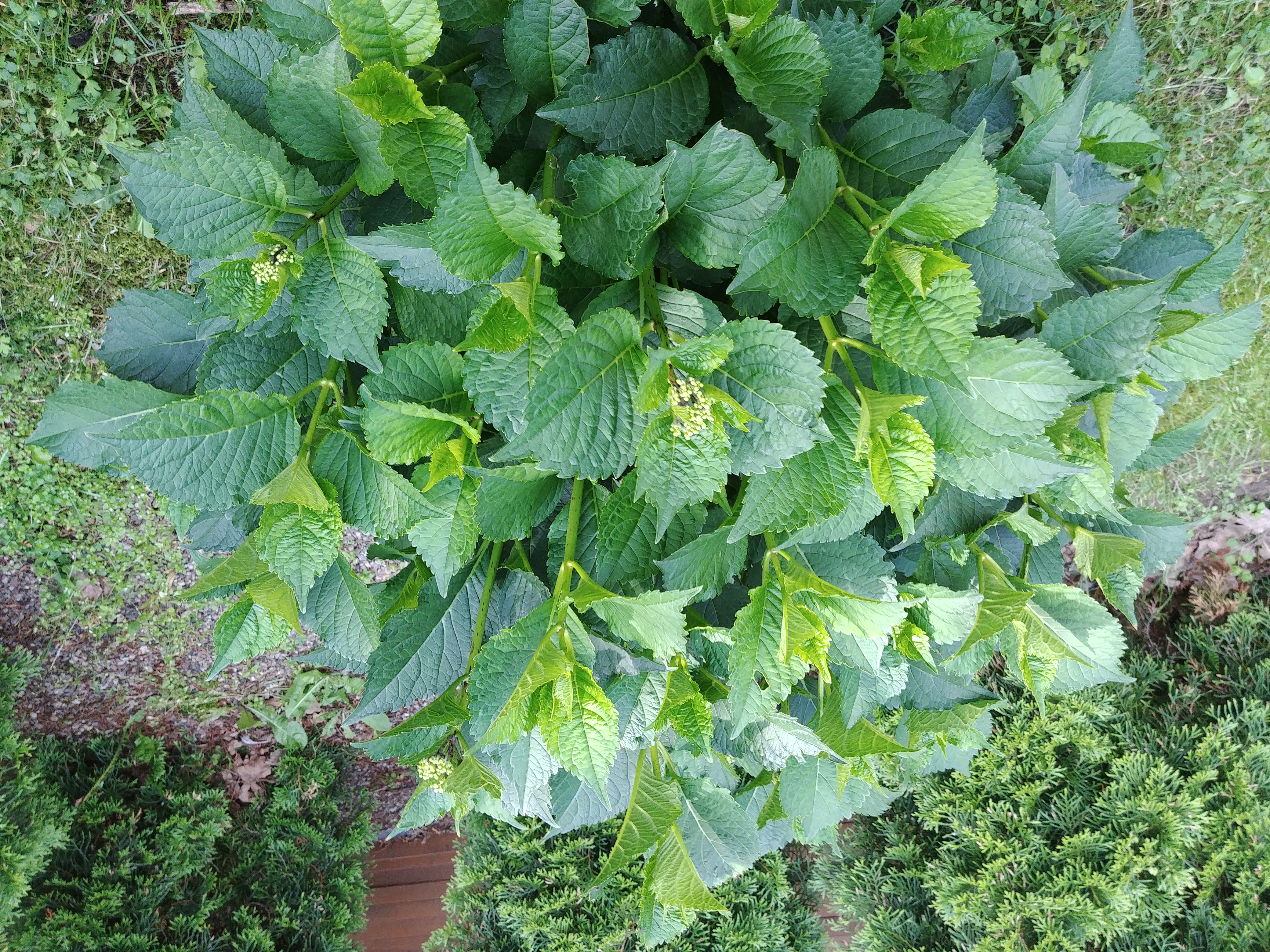 I jeszcze jedna czerwona hortensja nawet ładnie wyglądała we wrześniu ale zdjęcie z 10 lipca a na końcu kwietnia miałem przesadzone z innego miejsca i ścięta przy ziemi. I jak piszą w poradnikach ,że hortensja nie kwitnie na świeżych pędach a tu urosła.