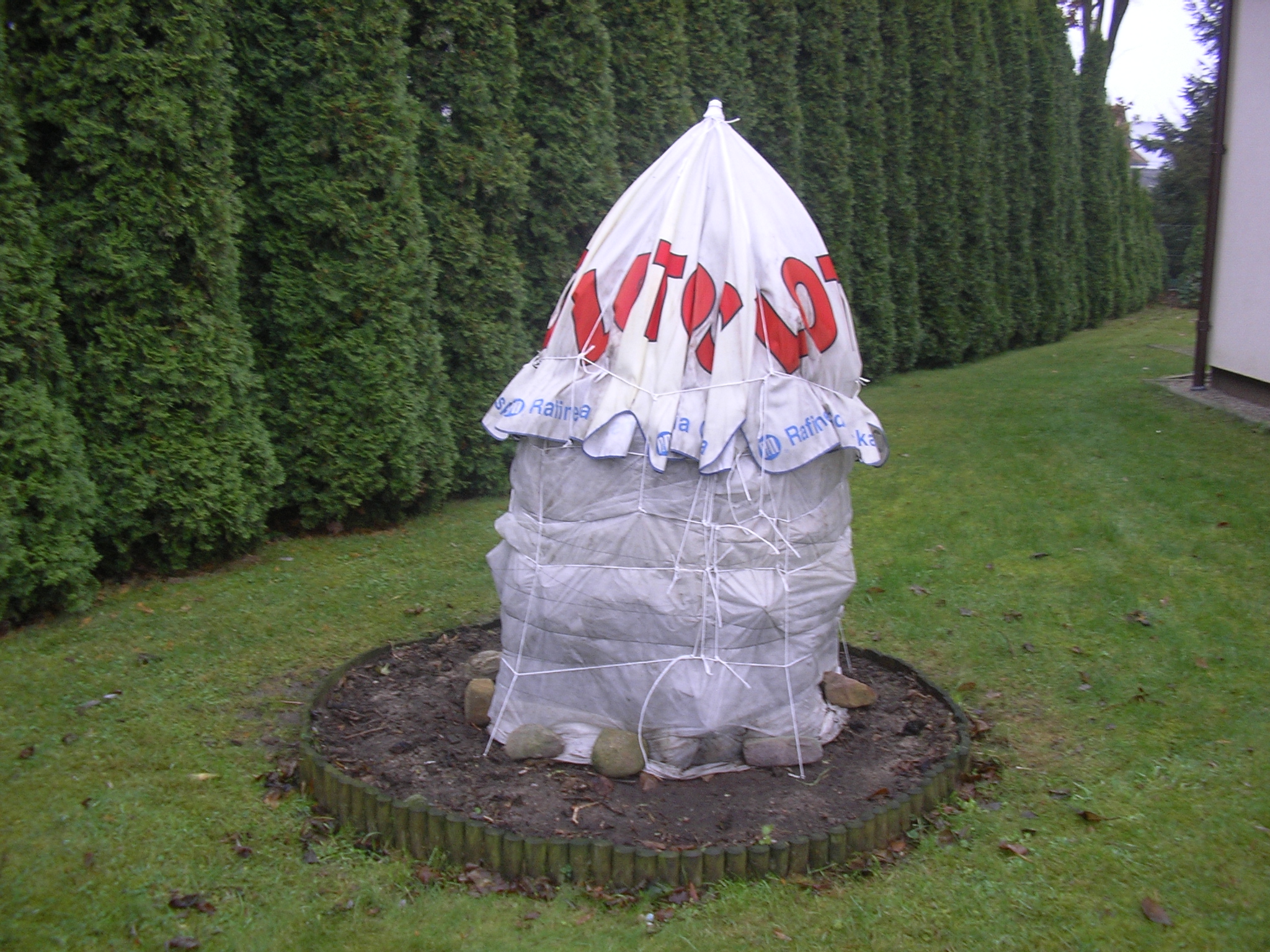Tą fioletową hortensje mam z boków przycięte oraz górę bo na zimę przykrywam z boku fizeliną a na górę mam stary parasol do stołu do połowy sklapły aby śnieg mógł łagodnie spływać.