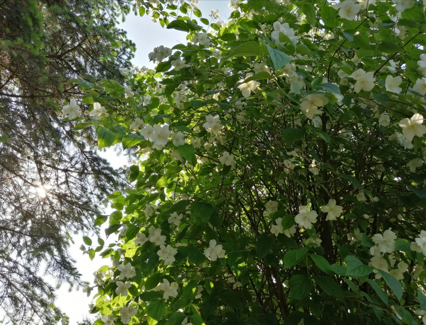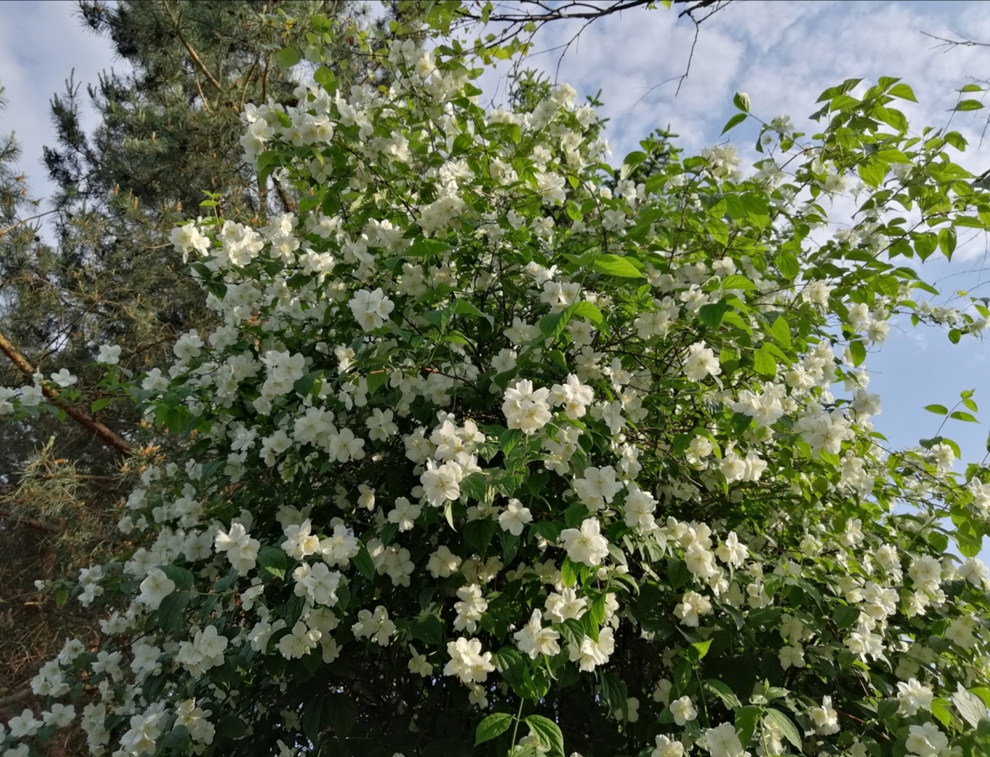 Jaśminy często się tak rozrastają, u mojej cioci jest taki olbrzymi jak drzewo. Ma już swoje lata, ale dobrze że został posadzony w miejscu z odpowiednim zapasem przestrzeni, dzięki czemu nie przeszkadza innym roślinom.