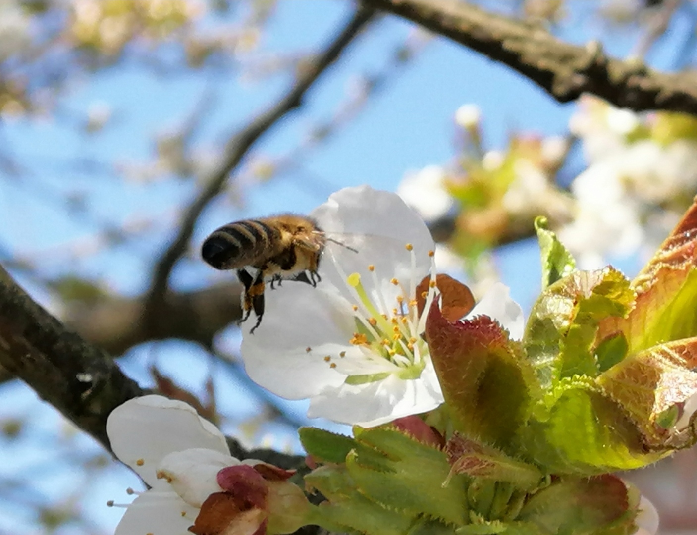 W sobotę 20 kwietnia czereśnia zaczęła szaleć, a razem z nią pszczoły :D
