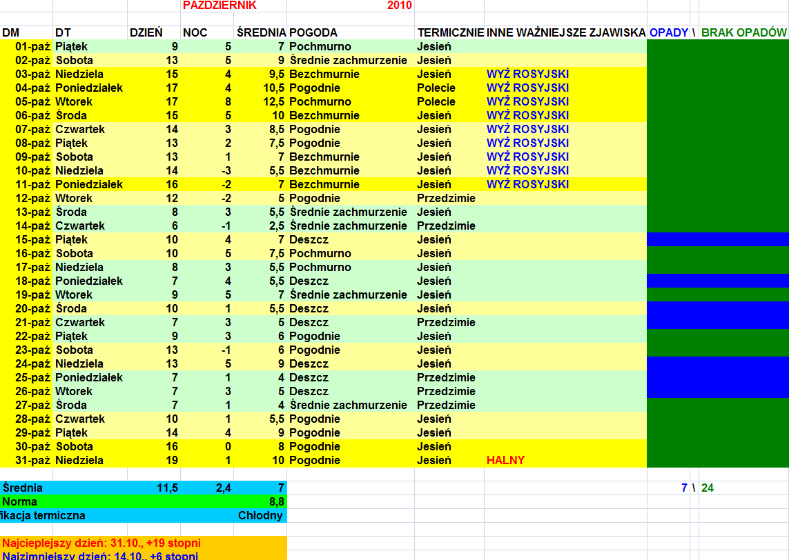 Mimo, że był to chłodny październik, to był jednak też dość przyjemny z uwagi na dużą ilość słonecznych dni. Jednak coś za coś - za pogodne dni przypłacaliśmy nocnymi przymrozkami. Przeciętny był okres od 13 do 27 dnia miesiąca, po czym w ostatnich dniach października ruszyła adwekcja ciepła z południa Europy, dzięki czemu najcieplejszy dzień miesiąca był dopiero 31 października (czyli wtedy, kiedy statystycznie powinno być już najchłodniej w październiku).