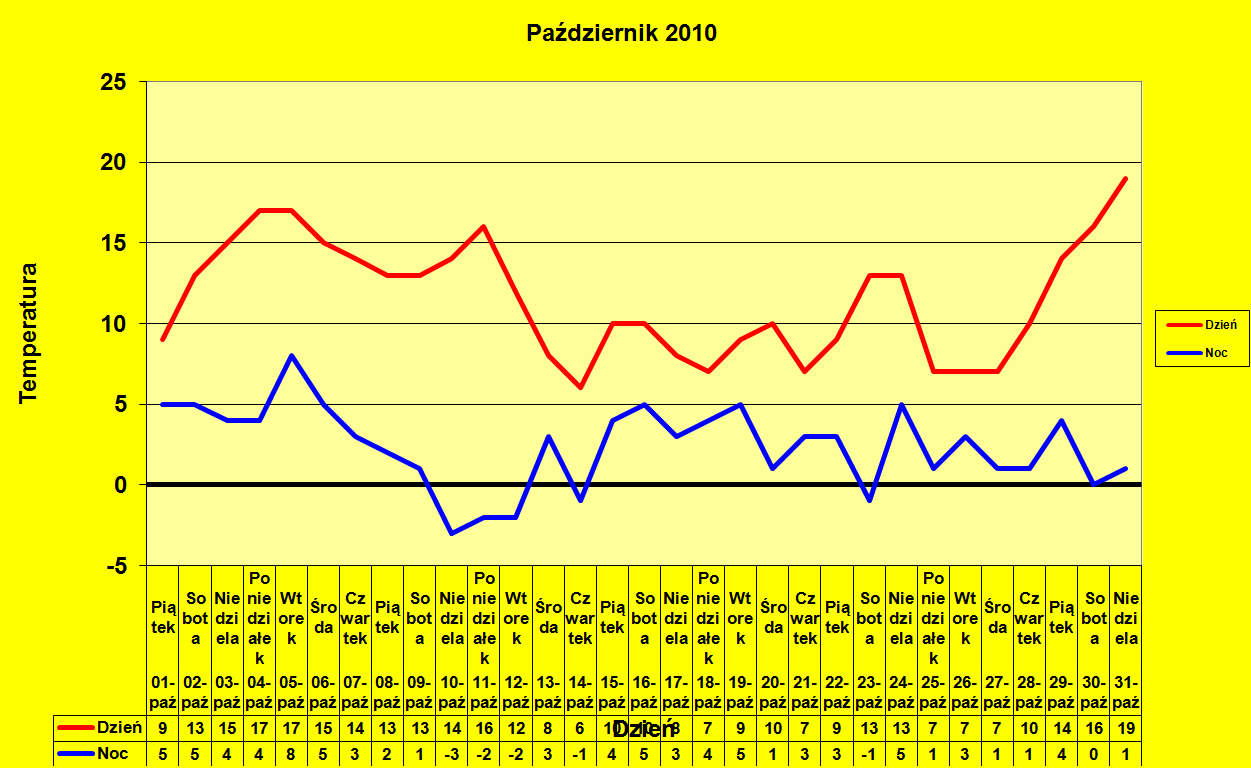 Całkiem fajnie było w dniach 3-6 października, kiedy przy słonecznej pogodzie temperatury przekraczały jeszcze 15 stopni, a więc było ciepło, ale nie jakoś anomalnie, zaś noce nie zawierały przymrozków. Potem nadeszło nieprzerwanie pięć dni mroźnego wyżu, choć w ciągu dni można było liczyć choć na te 12-13 stopni. W połowie miesiąca zrobiło się już jednak prawie-zimowo. Temperatury nie sięgały 10 stopni zatrzymując się częściej w okolicy 5-6, było ponuro i padała mżawka. Trochę cieplejszej w ciągu dnia (choć z powodu mrozów nadal bardzo zimnej) i słonecznej pogody wróciło na początku III dekady i 24 października udało się zmierzyć całe 17,5 stopnia. W kolejnych dniach nadeszło kolejne okołozimowe ochłodzenie wraz z najzimniejszą dobą w miesiącu - 28 października. Tego dnia zanotowano zaledwie -4,2 stopnia temperatury minimalnej, a wzbicie temperatury maksymalnej do wartości dwucyfrowej nie zmieniło faktu, że średnia dobowa wynosząc 2,2 stopnia, jeszcze mocniej podbiła anomalię miesiąca. Anomalię, która od tej pory miała wzrosnąć. Koniec października przyniósł wiele Słońca i aż 19,3 stopnia w swoim ostatnim dniu. To absolutne maksimum tego miesiąca; październik 2010 był jedynym w XXI wieku pozbawionym przekroczenia 20 stopni.