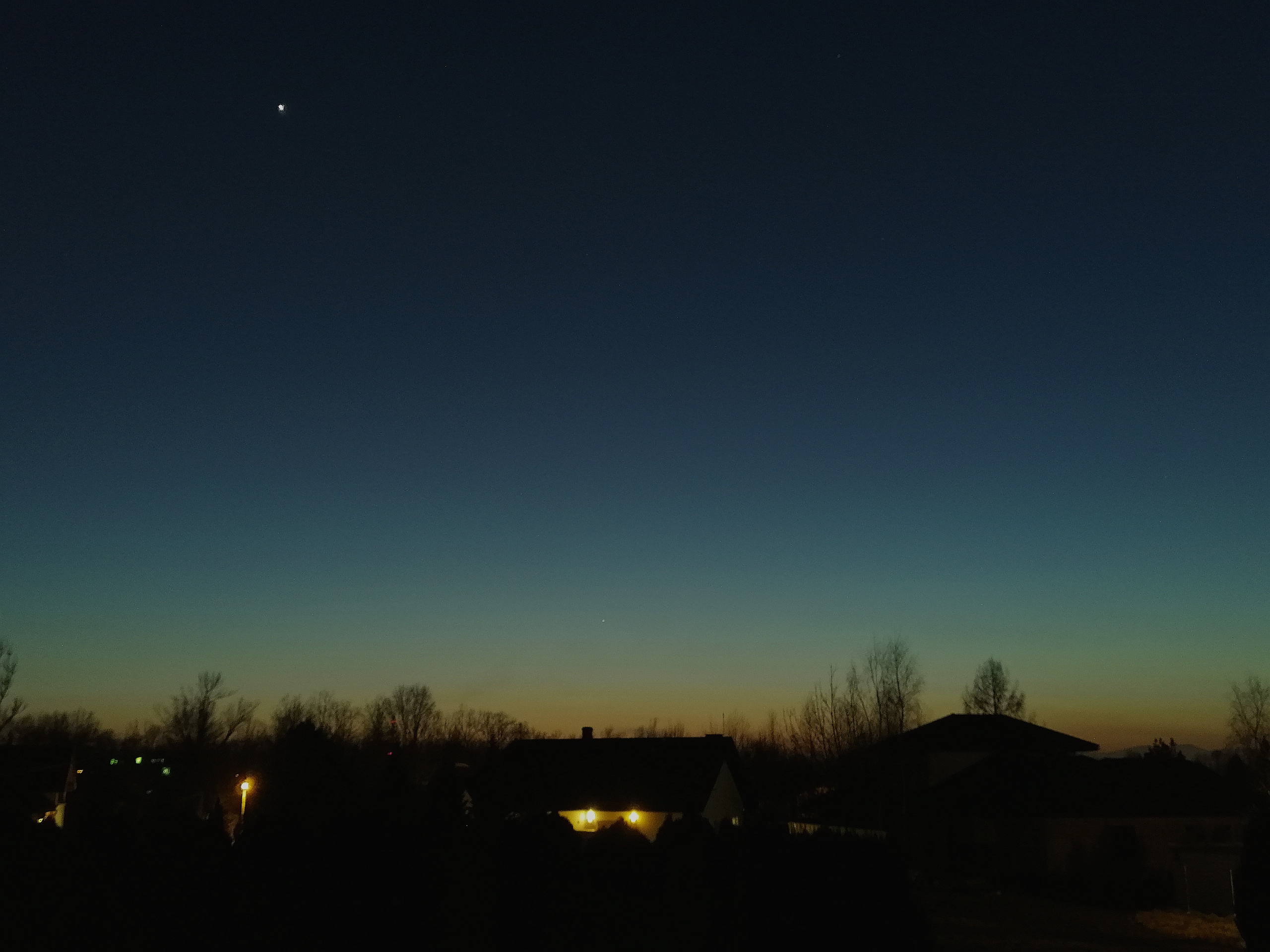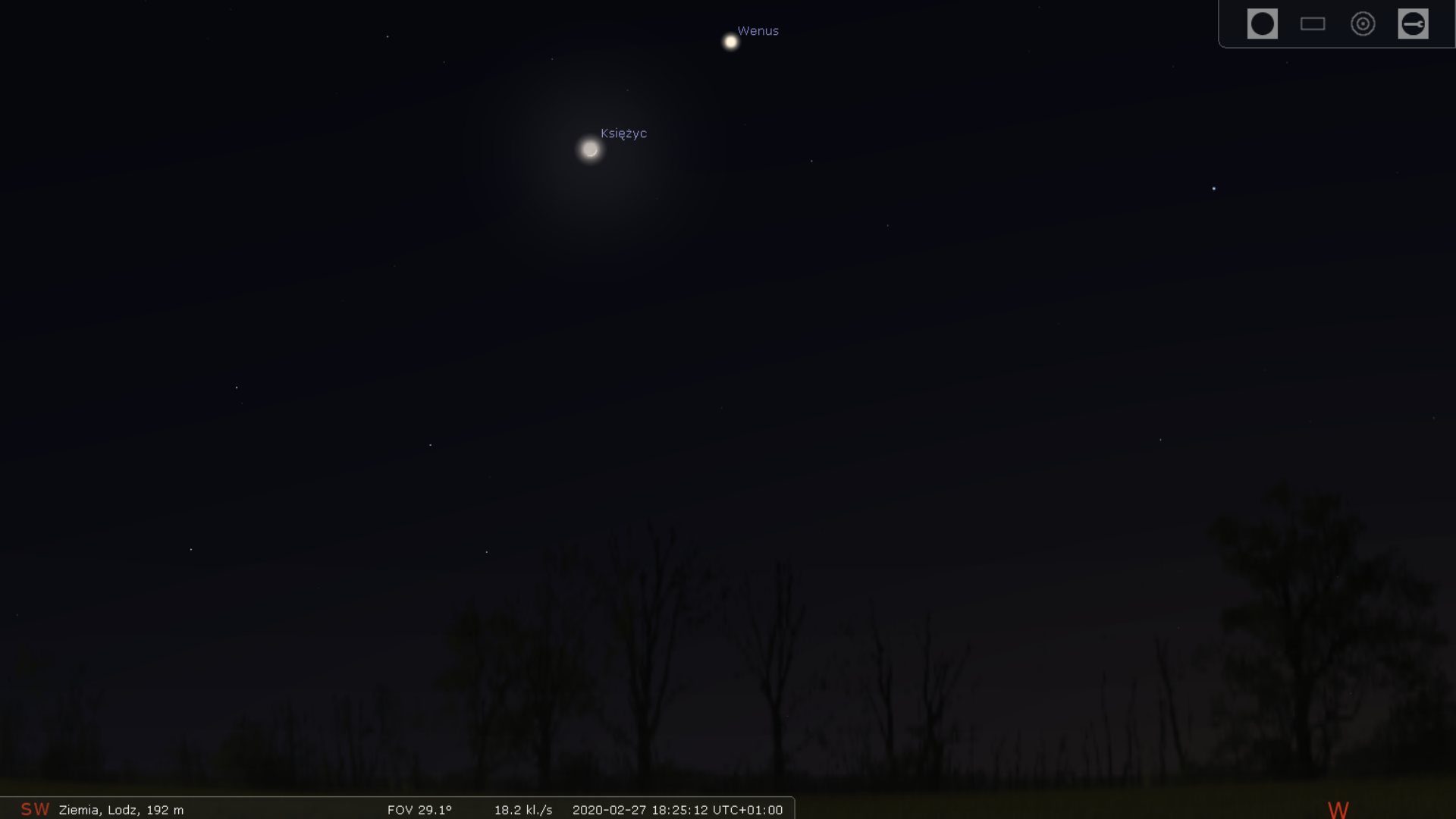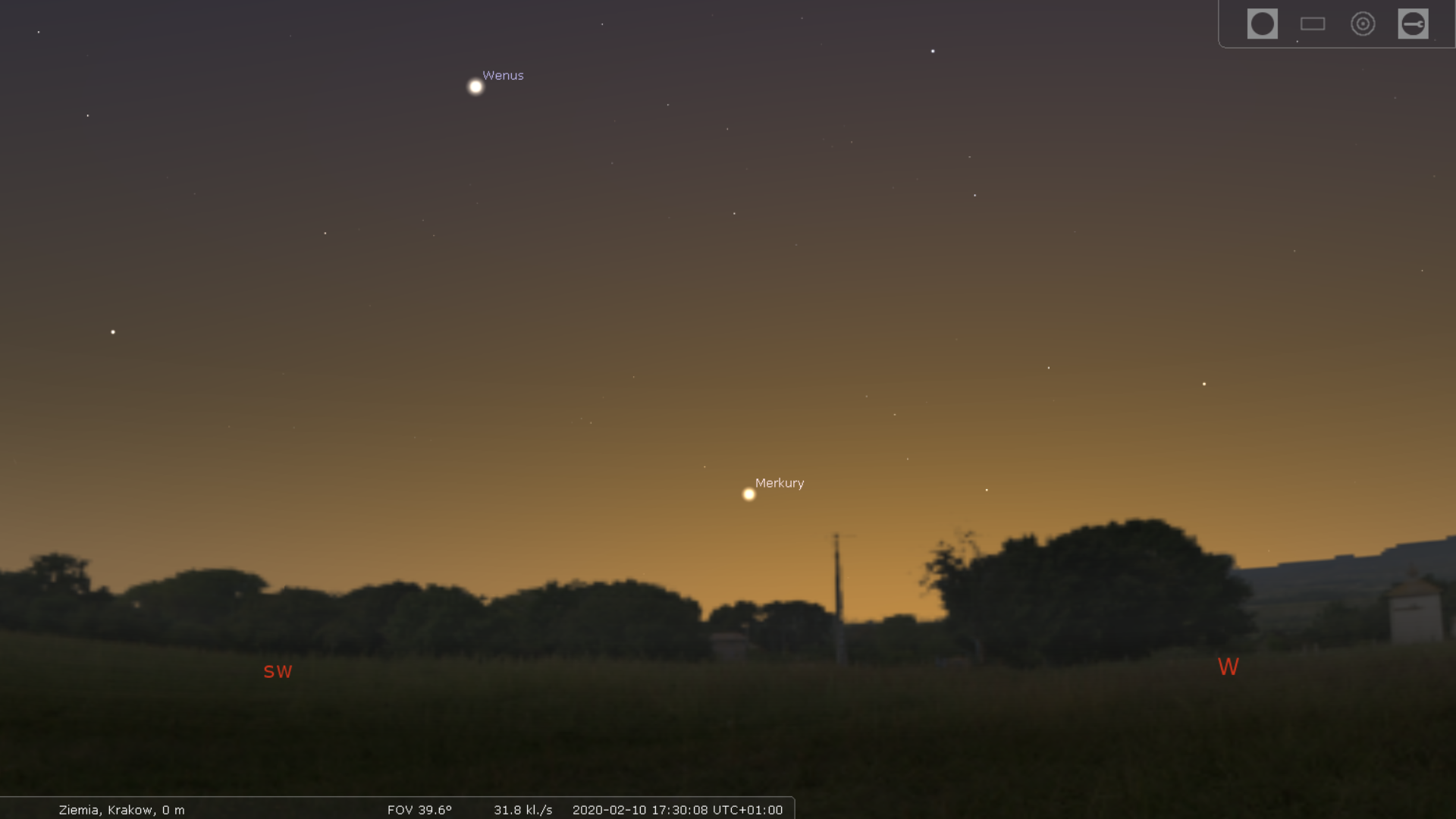 Przed chwilą udało mi się uchwycić wieczorne niebo z Wenus i dobrze widocznym z powodu maksymalnej elongacji wschodniej Merkurym. Aby go tu dojrzeć, trzeba trochę rozjaśnić ekran, bo posłaniec olimpijskich bogów kryje się w poświacie po zachodzącym Słońcu, dosyć nisko. Jest 17:50 i wciąż bardzo dobrze go widać :)