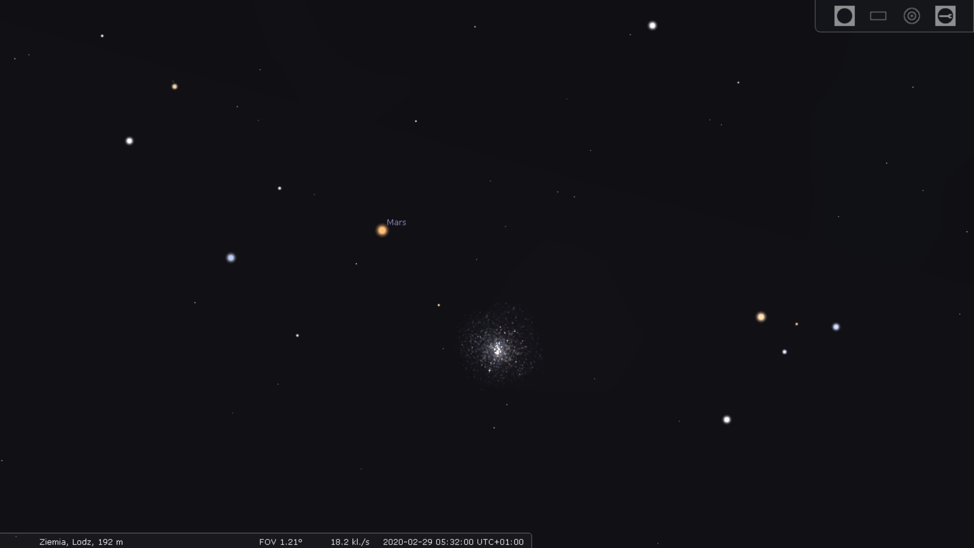 29 lutego będzie gratką dla posiadaczy teleskopów. Wcześnie nad rabem, nisko nad wschodnim horyzontem, Mars napotka Wielką Gromadę Strzelca - gromadę kulistą M22. Już przy użyciu małego teleskopu będzie można ją rozpoznać, ale należy pamiętać że im później rozpoczniemy obserwacje, tym trudniejsze będą warunki, bowiem jest to czas brzasku. Poniższa grafika obrazuje wzajemne położenie tych obiektów o godzinie 5:32.