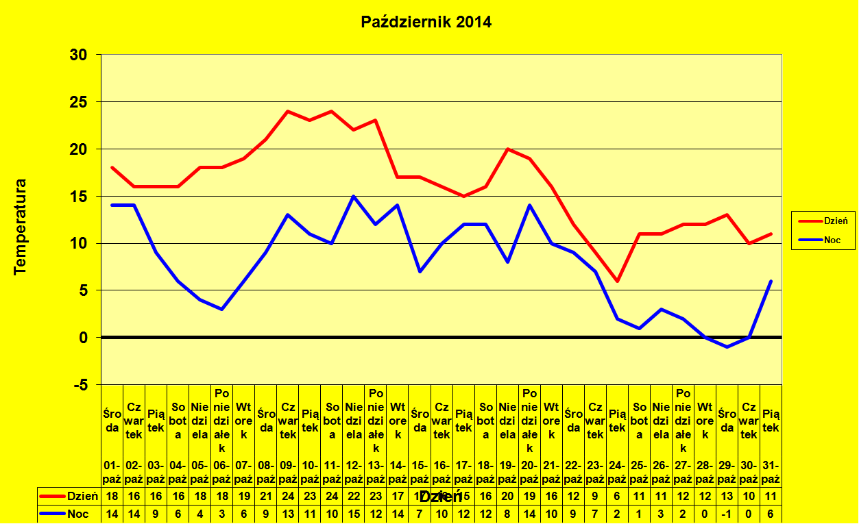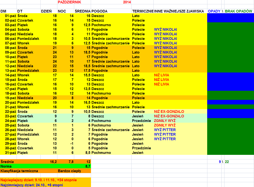 W odróżnieniu od października 2013, październik 2014 najcieplejsze dni miał w pierwszej połowie miesiąca. Ostatecznie termicznie oba październiki były bardzo podobne - według oficjalnych pomiarów cieplejszy był październik 2013. Natomiast Excel w moich podsumowaniach obliczył, że minimalnie cieplejszy był październik 2014.