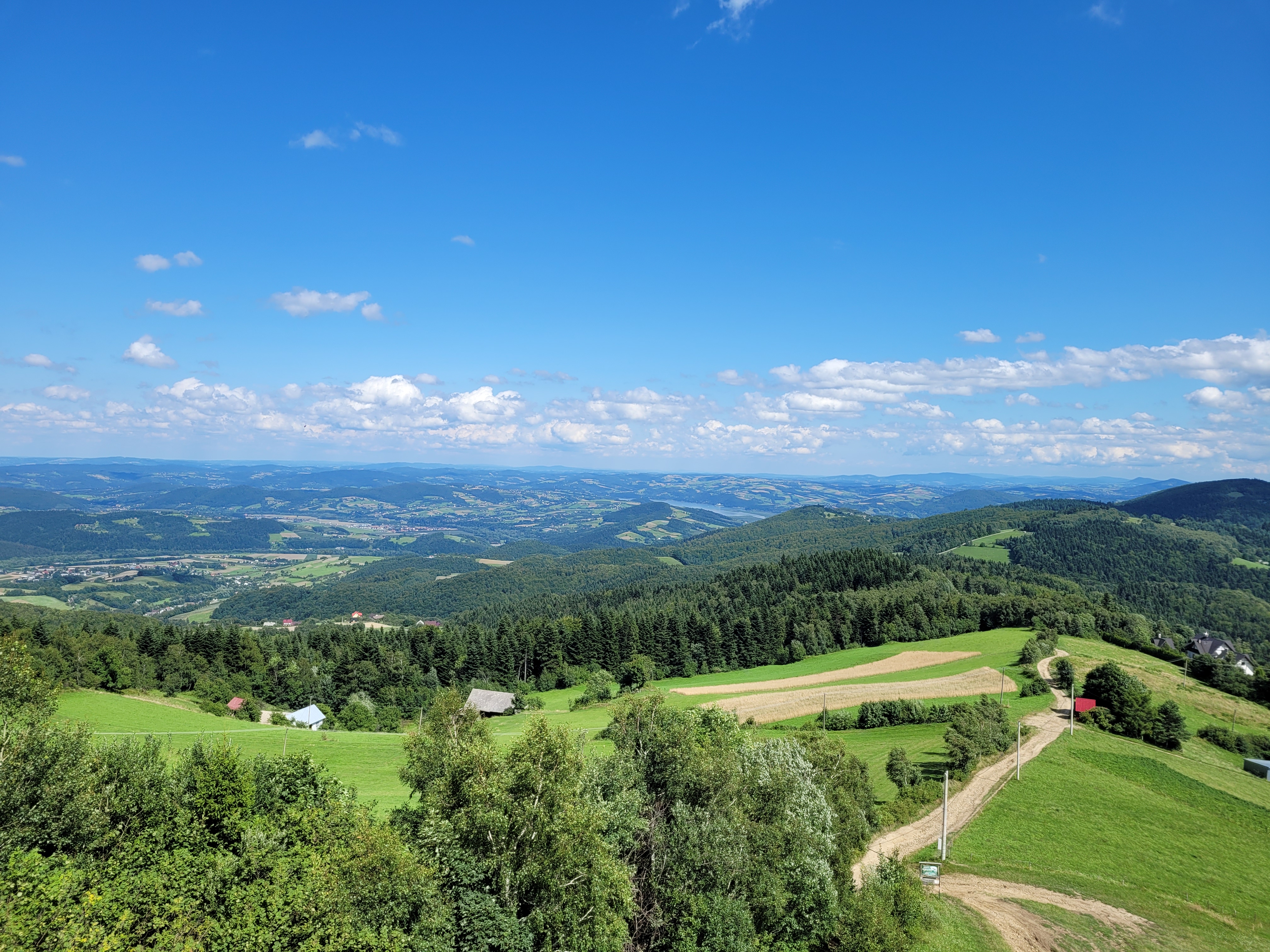 Na szczycie czuć już różnicę temperatur, wieje też inny wiatr, jakiego niżej wczoraj się nie uświadczyło. Krajobrazy są wspaniałe i obejmują panoramę Beskidu Wyspowego, Pogórze Rożnowskie wraz z Jeziorem Rożnowskim (na piątym zdjęciu od góry), a także doskonale widoczne Tatry. Na północy można wypatrzeć Brzesko, zaś na wschodzie, między wzgórzami kryje się moje rodzinne miasto. Najwięcej zobaczyć można z obleganej wczoraj przez turystów wieży widokowej, na którą jednak niełatwo się dostać. Prowadzące na górę schodki są bardzo strome i nie mają poręczy, tylko belki których można się chwycić. Niestety odezwał się we mnie mój lęk wysokości i miałem kłopoty z wyjściem na górę, bałem się jak stamtąd zejdę. Na samą górę wylazłem dopiero w drugiej próbie, kiedy chwilowo na wieży było mniej ludzi, a następnie zszedłem na siedząco :D
