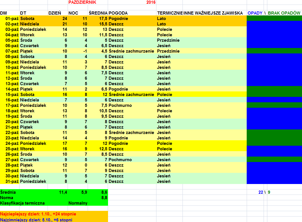 Na pewno ten miesiąc sprawił, że wszyscy, co myślą, że w Polsce panuje bezgraniczny niedobór opadów, zaczęli się poważnie zastanawiać. Owszem w ciągu dnia było trochę za chłodno, no ale mówi się trudno. Dobrze, że śnieg nie padał, bo parę bardziej "przyzwoitych" październików niestety posiadały i taki wyskok na koncie., a dla mnie niestety ta okoliczność ma kluczowe znaczenie. :cry: Na pewno za konsekwencję można go podziwiać- jak niż przyszedł, tak długo nie odpuszczał. ;-) ;-) ;-) Natomiast poza pierwszymi 2 dniami, które były bardzo ciepłe (przynajmniej u mnie- 1 było blisko +25 C, a 2 wciąż powyżej +20 C) ;-) , to wręcz przedni listopad do kolekcji by się trafił. ;-) ;-) ;-)