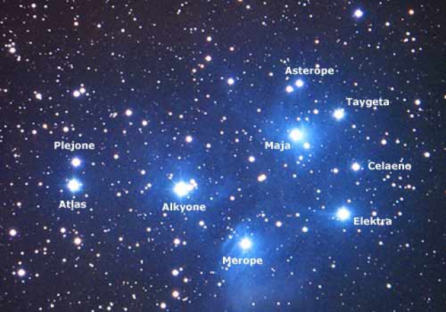 Plejady (lub Siedem Sióstr), bo o nich mowa, to od starożytności najbardziej znana gromada gwiazd, nazwana tak na cześć siedmiu mitycznych sióstr; córek Atlasa i nimfy Plejone, które zrozpaczone po śmierci sąsiednich Hiad (do nich jeszcze przejdziemy), z rozpaczy popełniły samobójstwo, po którym Zeus umieścił je wśród gwiazd. Gołym okiem widzimy zwykle sześć gwiazd układających się w miniaturowy Wielki Wóz. Siódmą gwiazdę można zaobserwować spoza miasta, zaś pod ciemnym, wiejskim niebem i bardzo dobrej widoczności w bezksiężycową noc, dostrzeżemy jeszcze ósmą i dziewiątą. Dlaczego dziewięć skoro sióstr było siedem? Otóż oprócz nich, to znaczy Alkione, Asterope, Celaeno, Elektry, Mai, Merope i Taygety, wśród gwiazd umieszczono także ich mitologicznych rodziców - Atlasa i Plejone. Gwiazdy zajmują na niebie obszar o średnicy trzykrotnie większej od średnicy tarczy Księżyca. Przez lornetkę można zobaczyć kilkadziesiąt kolejnych gwiazd; ogólnie w skład gromady wchodzi ich około stu, jednak znacząco ustępują one dziewięciu podstawowym młodym niebieskim olbrzymom.