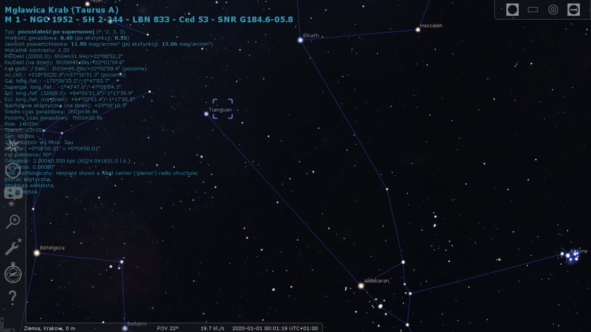 Na mapie gwiazdozbioru (powyżej) zaznaczone jest położenie Kraba. Odszukanie nie powinno sprawić trudności, ponieważ M1 znajduje się bardzo blisko jasnej gwiazdy Tianguan. Jest większa niż spodziewa się większość obserwatorów, stąd patrząc przez lornetkę, należy dokładnie przestudiować ten obszar. Wtedy dostrzeżemy, że to nie gwiazda, lecz obiekt mgławicowy. Obiekt tak ważny i jedyny w swoim rodzaju.