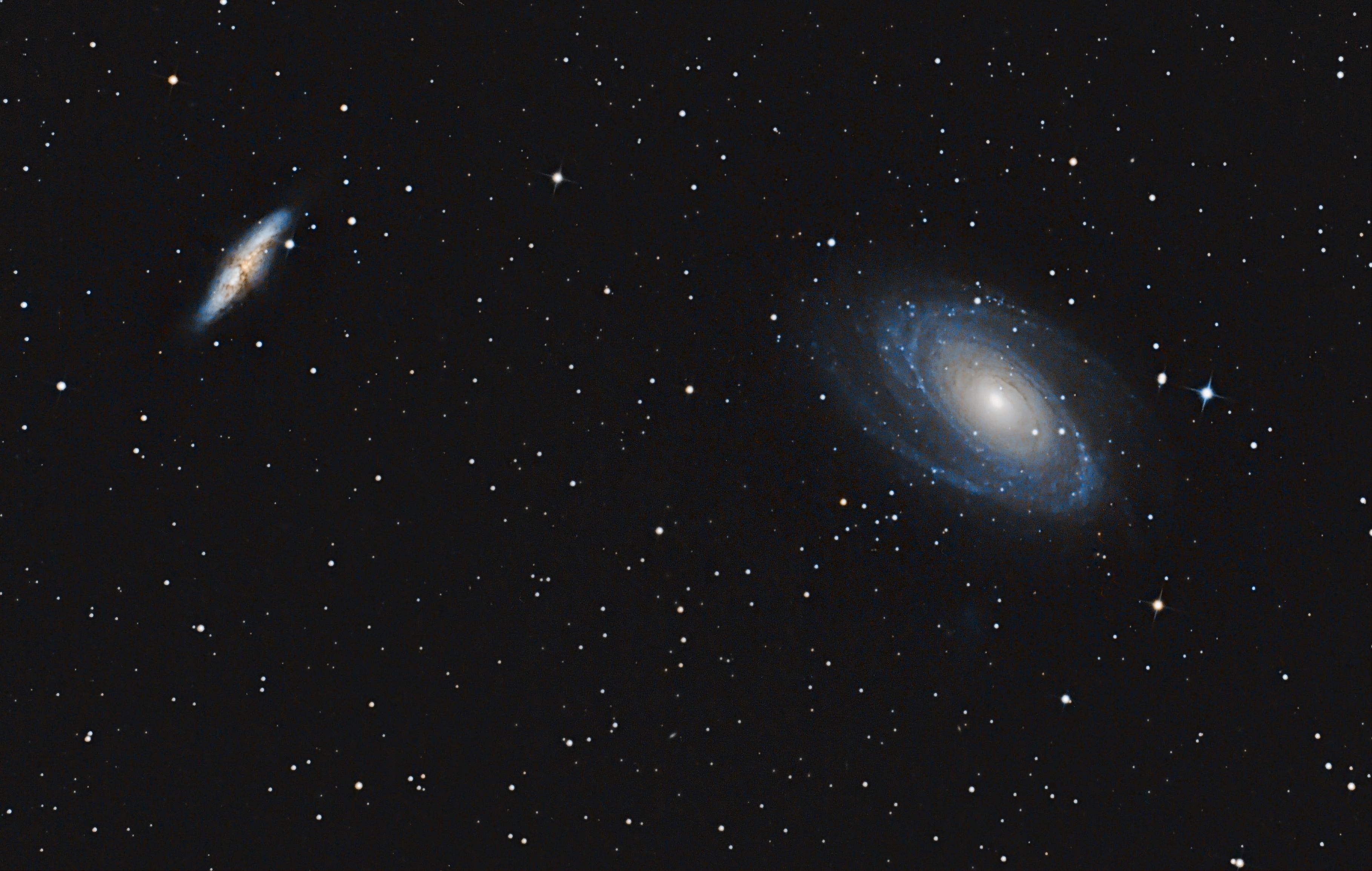 Zacznijmy od wspaniałej pary galaktyk - M81 i M82. Leżące blisko siebie potężne przestrzenne twory są na tyle wyraziste i rozpoznawalne, że doczekały się swoich nazw. M81 (po prawej) jest nazywana na cześć odkrywcy Galaktyką Bodego, natomiast M82 (po lewej) - Cygarem. Obie są oddalone od Ziemi o 12 milionów lat świetlnych.